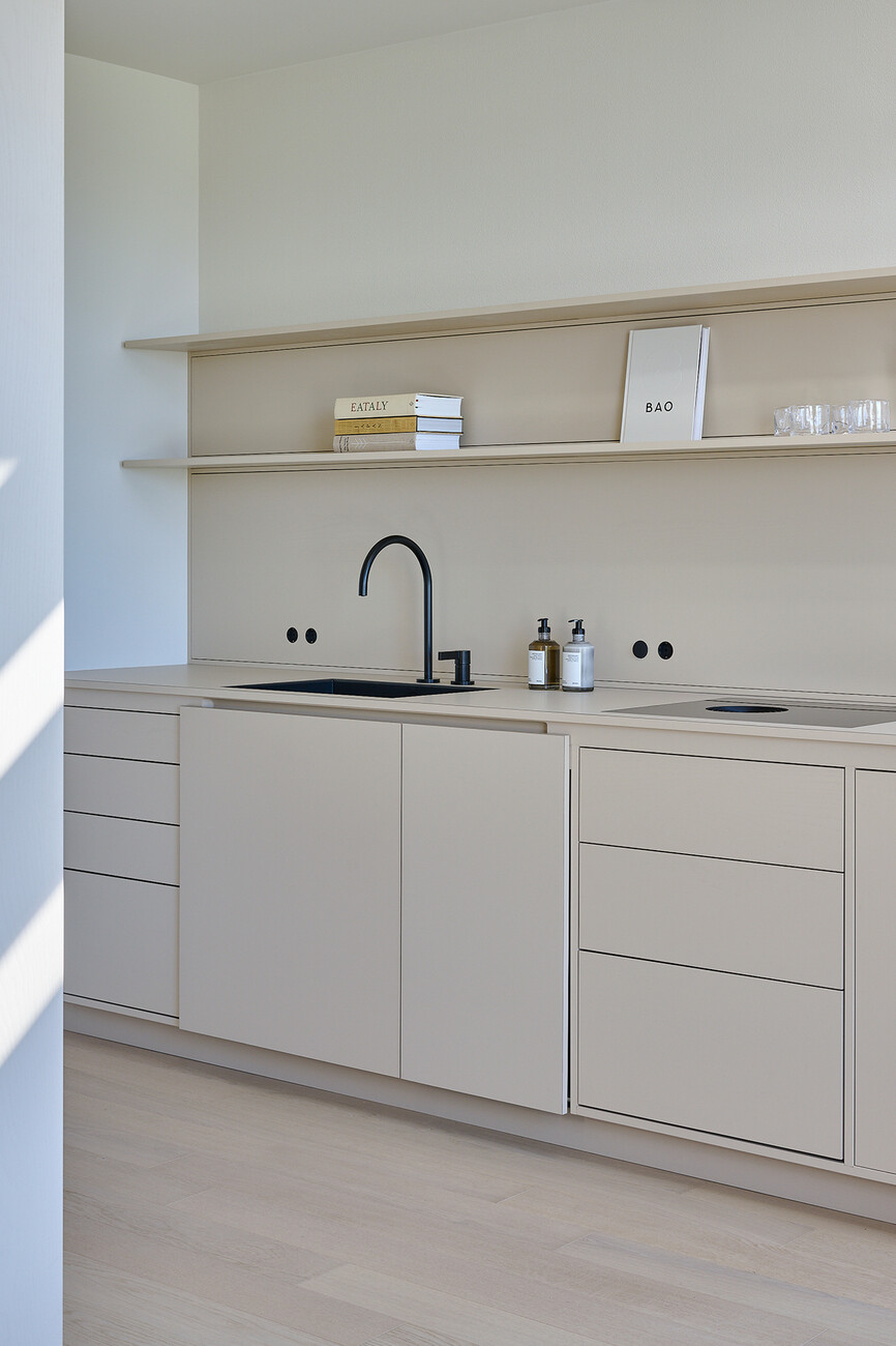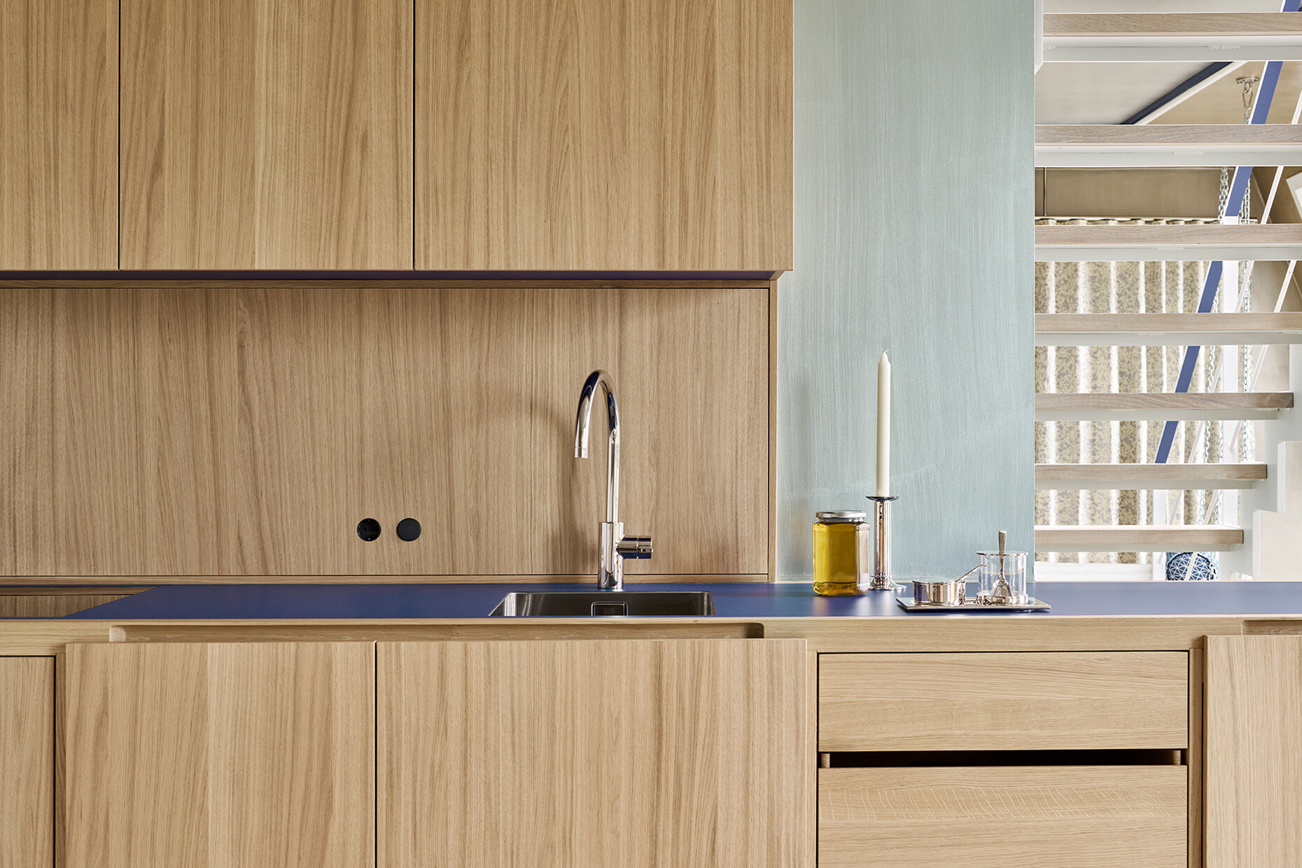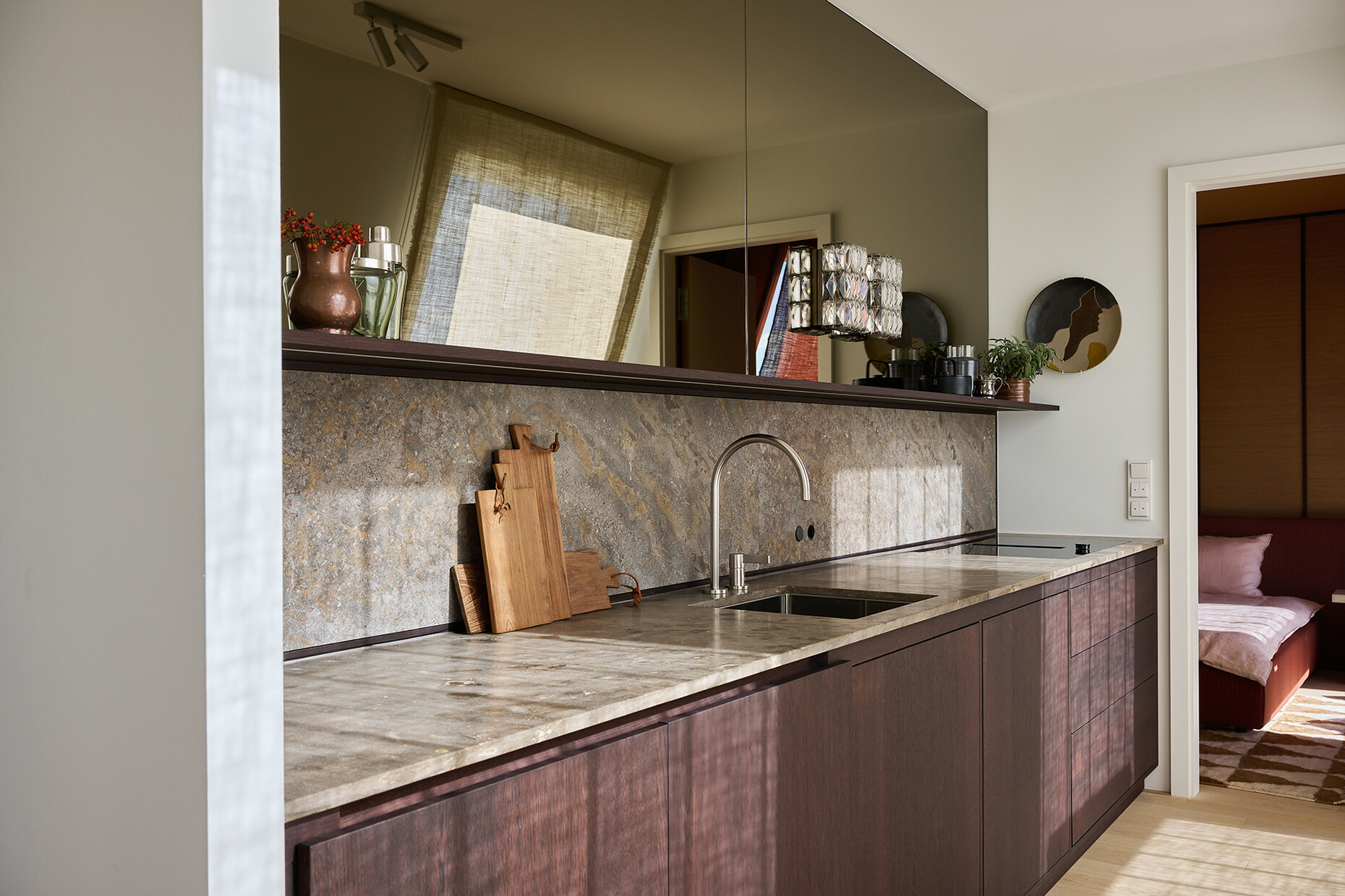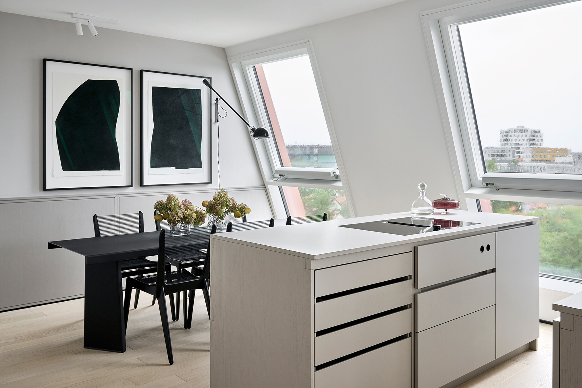 So individuell die Gestaltung der zehn Penthouse-Apartments im "Van B" nach den Vorstellungen der zehn verschiedenen Designstudios auch sein mag, sie alle haben ein Element gemein: "J*Gast". Dabei handelt es sich um ein patentiertes Rahmensystem, in dem durch Einklinken von Bauteilkomponenten ein enorm individualisierbares Küchenmöbel entsteht. Zur Wahl stehen Massivholzschubläden und echtholzfurnierte Elemente. Die robusten Arbeitsplatten werden vorwiegend aus heimischen Natursteinen oder Terrazzo gefertigt. "J*Gast gleicht einem Möbelstück", sagt Tobias Petri, "und damit passt es gut in offene Grundrisse." Die ideale Ergänzung also für die zehn vollmöblierten Statement-Pieces nach den Designs der beteiligten Interiorstudios im "Van B".