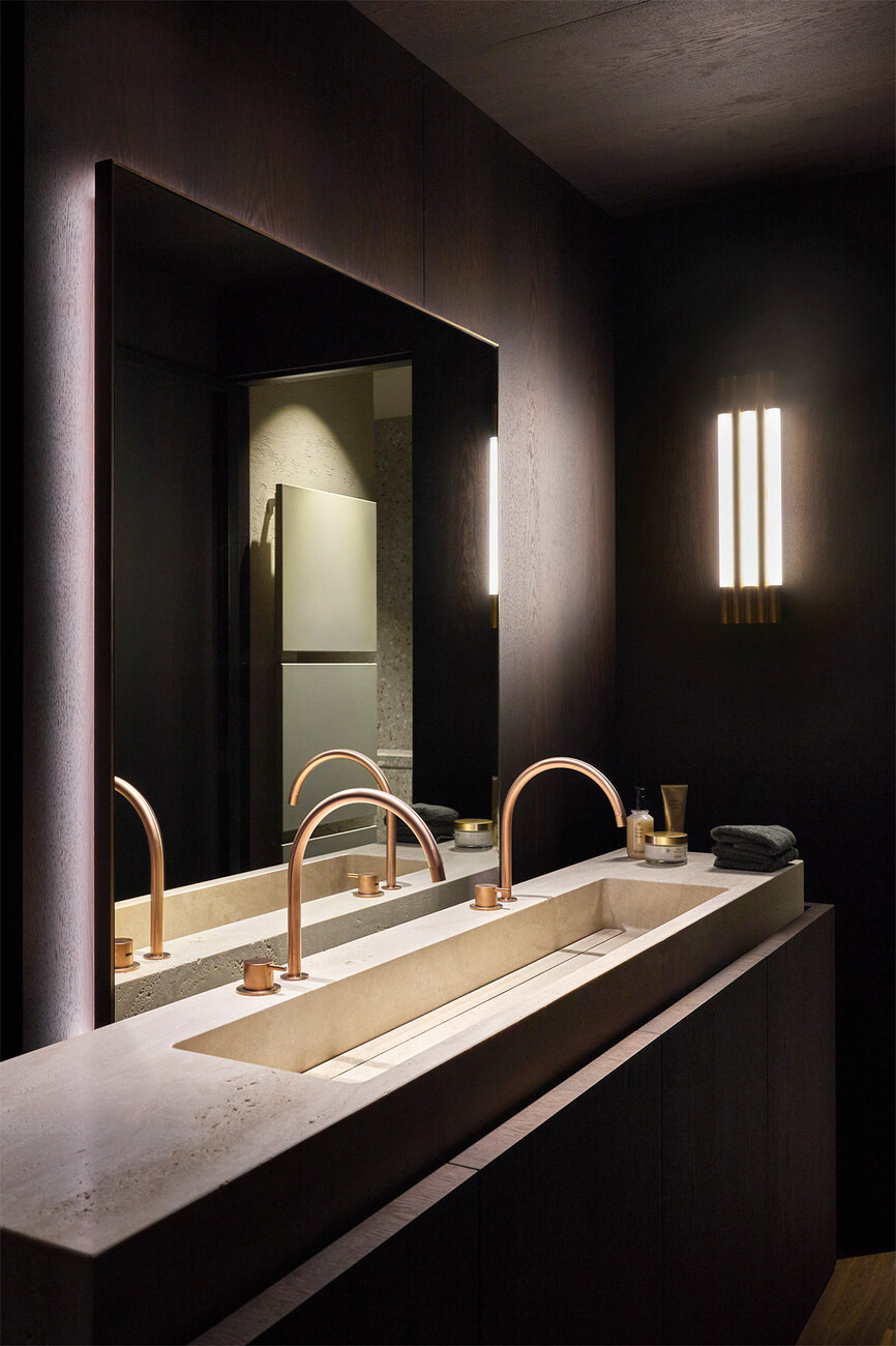 In der "Holzrausch Edition Van B" verbünden sich Lehmputz mit Holzpaneelen, patiniertes Messing mit Naturstein, geräucherte Eichendielen mit Schwarzstahl, dunkle Erdtöne mit unbehandelten Materialien, organische Lebendigkeit mit formaler Strenge zu einem die Sinne anregenden und gleichermaßen Geborgenheit ausstrahlenden Gesamtkunstwerk. Eingerichtet ist es mit eigens entworfenen Manufakturmöbeln und Lichtobjekten, die im Zusammenspiel mit ausgewählten DesignerInnen und befreundeten KünstlerInnen entwickelt wurden. Eine Auswahl dieser Stücke aus den Kooperationen auch im Rahmen anderer Interieurprojekte ist als Editionen im Münchner Showroom erhältlich.