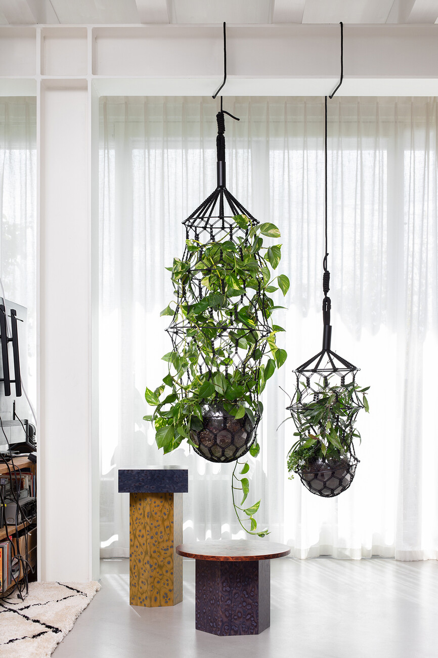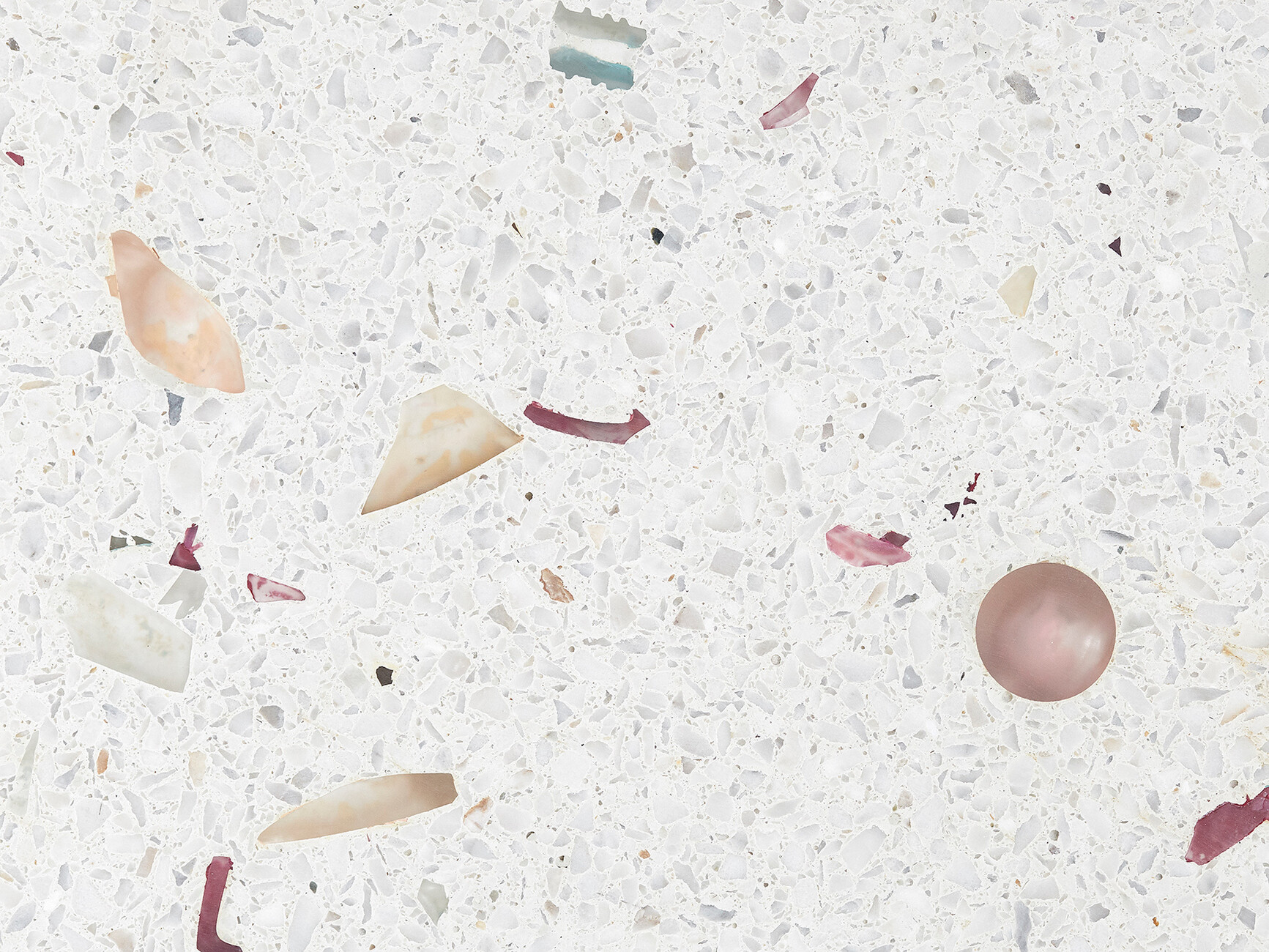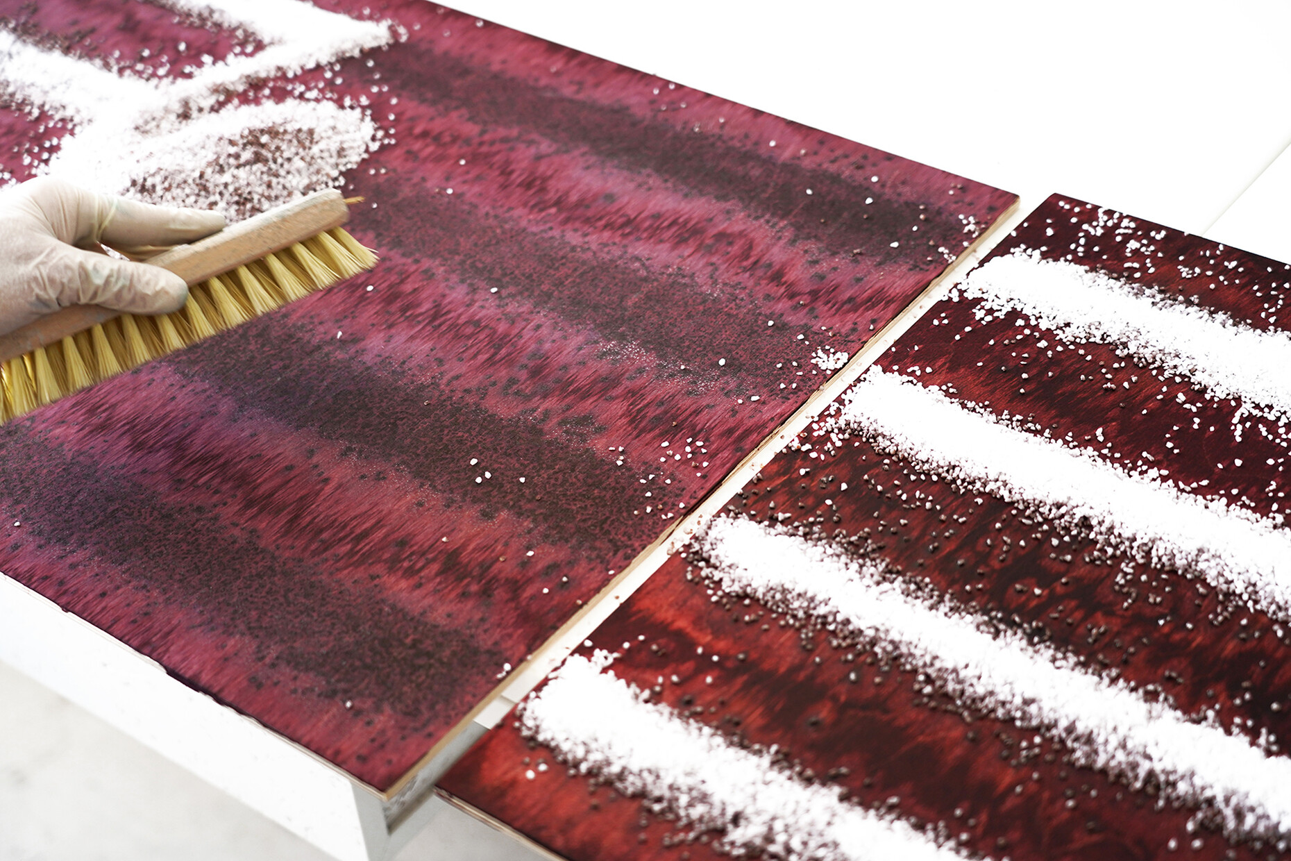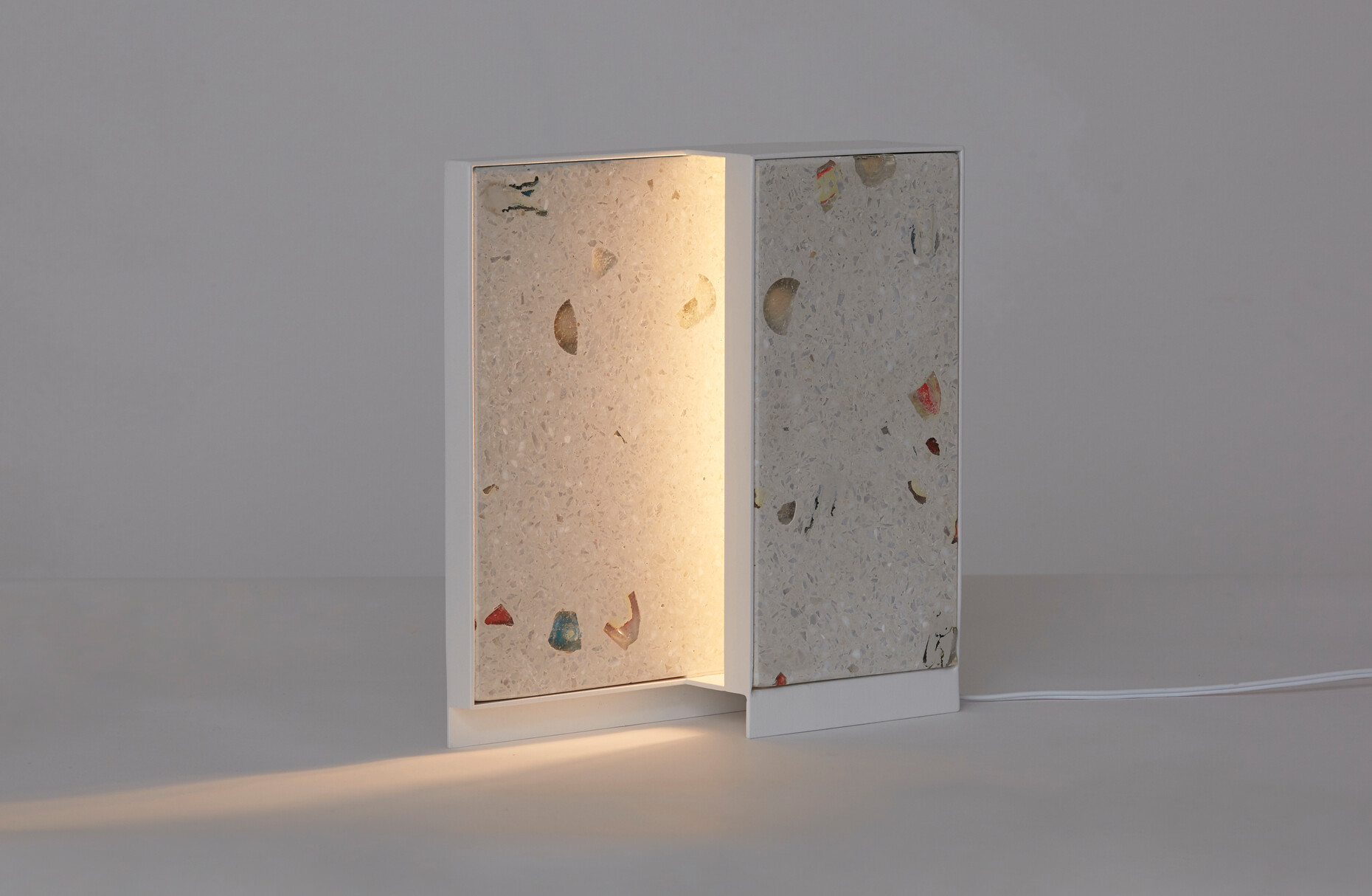 Es ist nicht das erste Upcycling-Projekt, das llot llov für cosnova beauty entwickelt haben. 2018 stellten Jacob Brinck und seine Studiopartnerin Ania Bauer einen Terrazzo vor, in den Stücke von Nagellackflaschen als Zuschlag eingegossen worden waren. Die dicken Glasbruchstücke mit den farbigen Lackspuren erzeugen ein lebendiges Muster in dem hellgrau-samtigen Beton. llot llov vertreibt das Material unter dem Namen "Glacier" selbst, entweder in Form von Platten oder bereits weiterverarbeitet als Tisch oder Leuchte. Die kleinen Tiegel-Leuchten sind ebenfalls direkt über das Studio zu beziehen, im Moment arbeiten Bauer und Brinck an weiteren Varianten. Überhaupt ist das 2007 gegründete Berliner Studio eine gute Adresse für ungewöhnliche Entwürfe. llot llov hüllen Leuchten in Fransenkleider oder Strickschläuche, sie entdeckten Makramee wieder, bevor die Knüpftechnik ihr großes Revival feierte. Und Ania Bauer ließ sich von Seidenmaltechniken zu einer neuartigen Oberflächenveredlung für Holz inspirieren. Salzkristalle, auf noch feuchte Farbe gestreut, saugen sich mit den Pigmenten voll und hinterlassen so faszinierende Muster. Manche der Muster erinnern an Pfauenfedern, andere eher an mikroskopische Aufnahmen von Einzellern. Auch "Osis" gibt es direkt bei den Designer, als Platte oder bereits zu Möbeln weiterverarbeitet. llot llov gehörten zu den ersten jungen Designstudios, die nicht nur entwarfen, sondern auch Produktion, Vertrieb und Marketing in die eigene Hand nahmen – ein Modell, wie es mittlerweile in Berlin einige Labels verfolgen, etwa New Tendency, Bartmann oder Loehr.