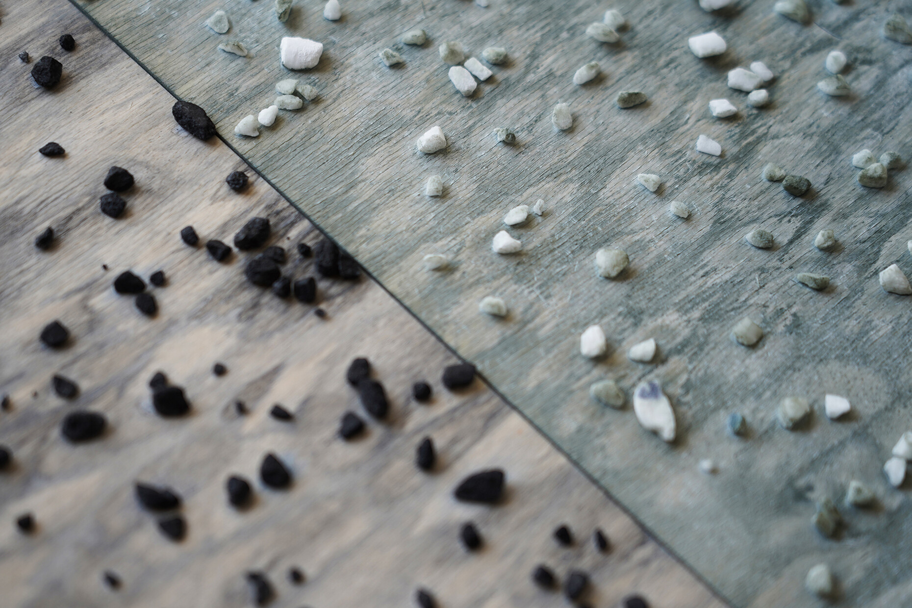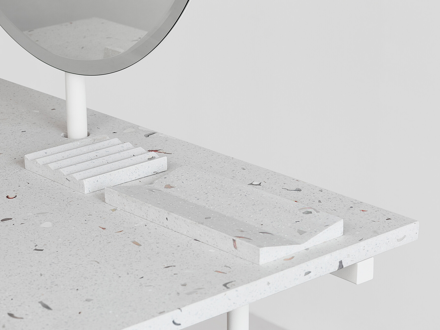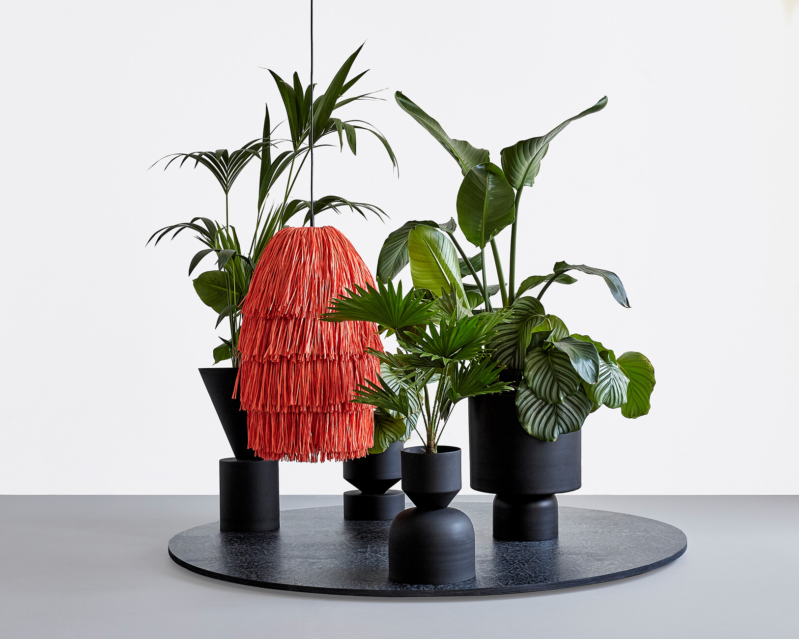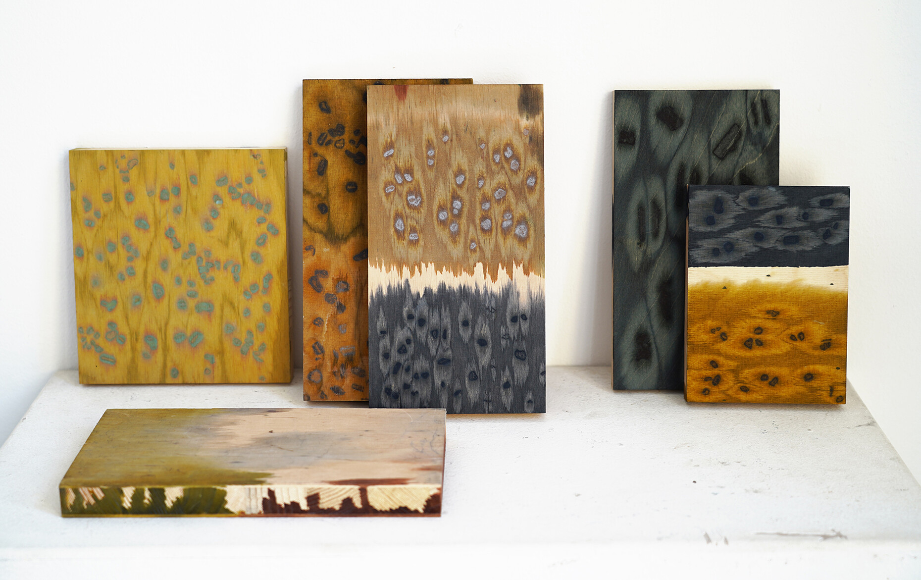 Es ist nicht das erste Upcycling-Projekt, das llot llov für cosnova beauty entwickelt haben. 2018 stellten Jacob Brinck und seine Studiopartnerin Ania Bauer einen Terrazzo vor, in den Stücke von Nagellackflaschen als Zuschlag eingegossen worden waren. Die dicken Glasbruchstücke mit den farbigen Lackspuren erzeugen ein lebendiges Muster in dem hellgrau-samtigen Beton. llot llov vertreibt das Material unter dem Namen "Glacier" selbst, entweder in Form von Platten oder bereits weiterverarbeitet als Tisch oder Leuchte. Die kleinen Tiegel-Leuchten sind ebenfalls direkt über das Studio zu beziehen, im Moment arbeiten Bauer und Brinck an weiteren Varianten. Überhaupt ist das 2007 gegründete Berliner Studio eine gute Adresse für ungewöhnliche Entwürfe. llot llov hüllen Leuchten in Fransenkleider oder Strickschläuche, sie entdeckten Makramee wieder, bevor die Knüpftechnik ihr großes Revival feierte. Und Ania Bauer ließ sich von Seidenmaltechniken zu einer neuartigen Oberflächenveredlung für Holz inspirieren. Salzkristalle, auf noch feuchte Farbe gestreut, saugen sich mit den Pigmenten voll und hinterlassen so faszinierende Muster. Manche der Muster erinnern an Pfauenfedern, andere eher an mikroskopische Aufnahmen von Einzellern. Auch "Osis" gibt es direkt bei den Designer, als Platte oder bereits zu Möbeln weiterverarbeitet. llot llov gehörten zu den ersten jungen Designstudios, die nicht nur entwarfen, sondern auch Produktion, Vertrieb und Marketing in die eigene Hand nahmen – ein Modell, wie es mittlerweile in Berlin einige Labels verfolgen, etwa New Tendency, Bartmann oder Loehr.
