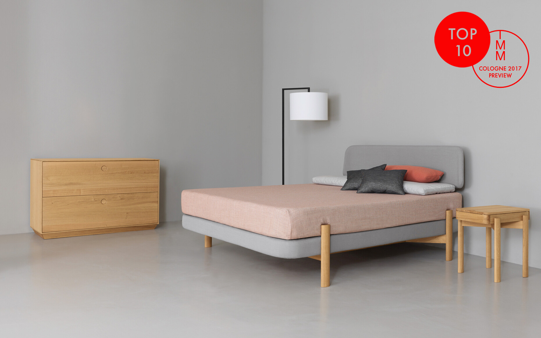 Dass ein Boxspringbett nicht klotzig sein muss, sondern leichtfüßig und filigran auftreten kann, beweist „Kosi“ vom jungen Designer Moritz von Schmeling für Zeitraum. Handwerklich sauber gearbeitet und ungewöhnlich konstruiert, wird der Boxspringrahmen mit Tonnentaschenfederkern auf eine Kreuzzarge gesetzt, deren Enden mit vier ovalen Hölzern verbunden sind. Obenauf liegt lose die Matratze, die ebenso wie der Rahmen weich abgerundet ist, was zusätzlich für optische Leichtigkeit sorgt.