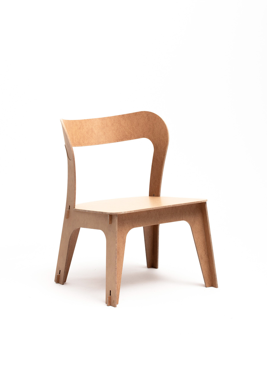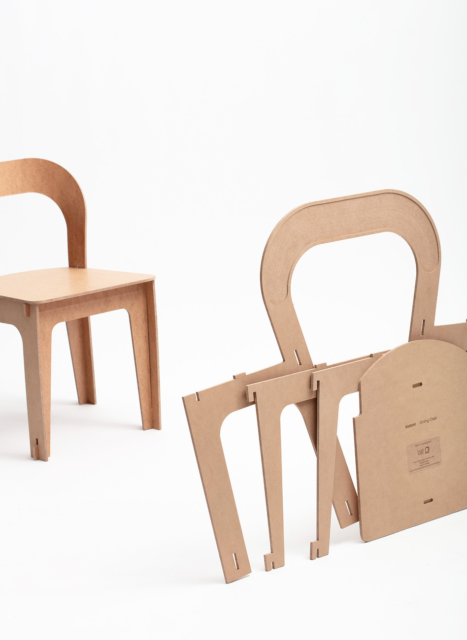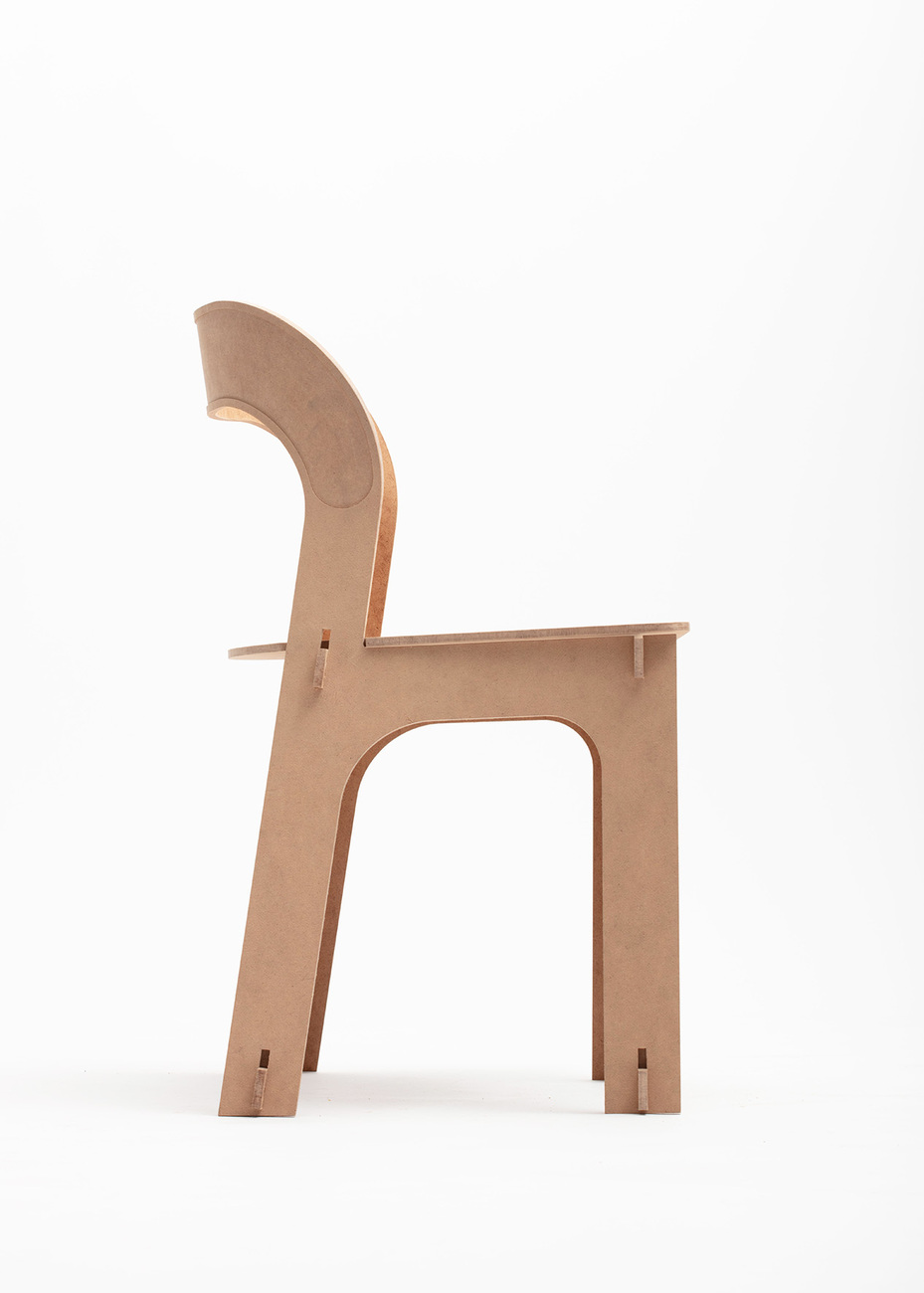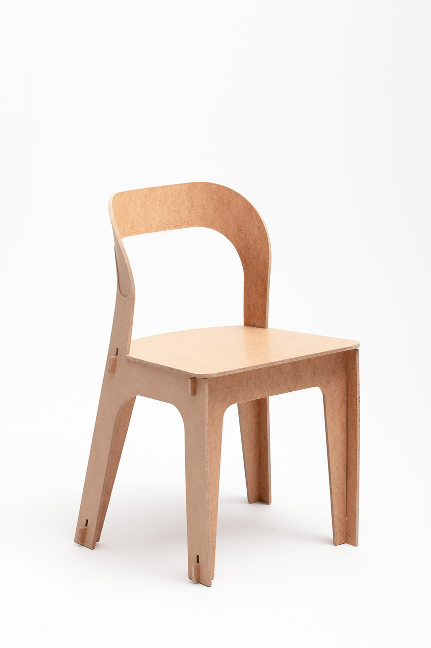 Auf die Frage, wie sich Burgard dem Entwurf genähert hat, erinnert sie sich: "Die Idee kam schon an Tag eins. Ich habe zuerst einen kleinen Maßstab getestet, in diesem hat das Material allerdings nicht funktioniert. Als ich große Formen ohne engen Radius ausprobiert habe, funktionierte es plötzlich. Irgendwann dachte ich: Ich wollte schon immer einen Stuhl machen. Als ich merkte, es könnte klappen, bin ich einen Schritt zurückgegangen und habe wochenlang viele kleine Papiermodelle und Schnittmuster gebaut. Alle Modelle waren Steckmöbel, aus einem Material gefertigt und ohne komplizierte Techniken. Die Entscheidung fiel letztlich auf ein Modell, bei dem die Rückenlehne gebogen ist – die einzig schlüssige Lösung." Der finale Entwurf besteht aus vier Teilen: Das größte Teil, bestehend aus Lehne und Beinen, wird gebogen und fixiert, indem U-förmige Querstreben eingesteckt werden. Darauf wird die Sitzfläche montiert. Alle Elemente sind verhakt, eine weitere Sicherung ist nicht nötig. "Das tolle am Material ist, dass dafür der ganze Baum verwendet wird. Von den Wurzeln, zu den Ästen: alles wird zerhexelt und ohne petrochemische Bindemittel allein mit dem freigesetzten baumeigenen Lignin durch Hitze und Druck gepresst – so entsteht die Platte. Für mein Projekt war der Werkstoff ideal geeignet. Die Platten sind dünn, aber dennoch sehr stabil", so Burgard. Der Herstellungsprozess der "Brühmöbel" garantiert eine platzsparende Lagerung und Logistik, ebenso kann das Material im Sinne der Kreislaufwirtschaft vollständig rückgeführt werden. Zudem ist ihr außergewöhnlicher Aufbau eine angenehme Abwechslung: Statt das Möbel zu verschrauben, wird es einfach aufgegossen.