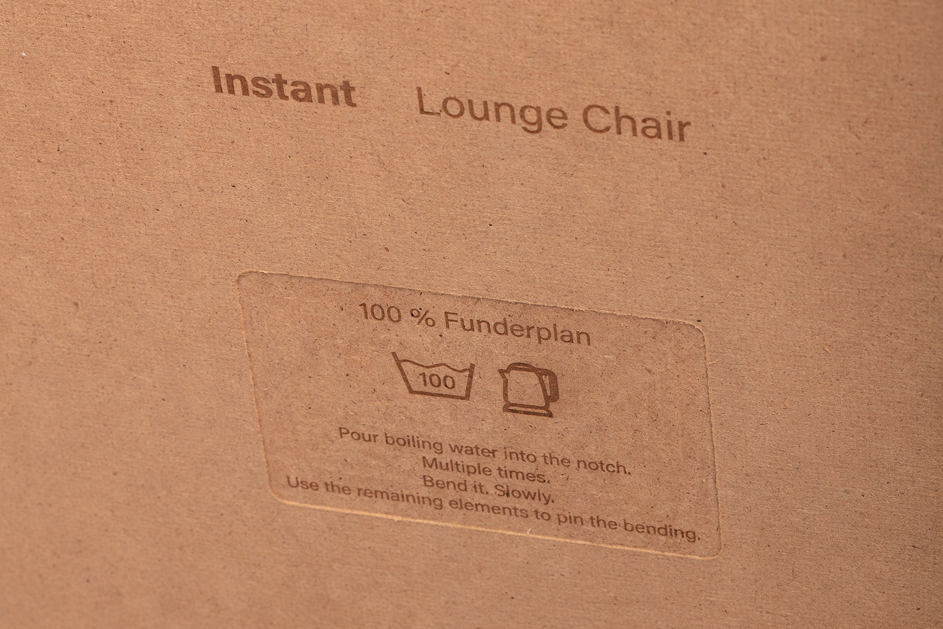 Judith Burgards Idee entstand als Experiment: Die Fundermax GmbH startete im Sommersemester 2023 ein Kooperationsprojekt mit der Burg Giebichenstein Kunsthochschule Halle. Für die Umsetzung stellte der österreichische Hersteller den Studierenden unter der Leitung von Prof. Klaus Michel und dem Künstlerischen Mitarbeiter Jacobo Cuesta Wolf den acht Millimeter schlanken Holzwerkstoff "Funderplan" zur Verfügung. "Wir hatten großes Glück und haben viel Material bekommen. Damit sollten wir Möbel entwickeln. Das war die einzige Bedingung", so Burgard. Im Rahmen dieser Kooperation entwarf sie "Instant", eine Steckmöbelserie bestehend aus einem Stuhl und einem Lounge Chair; weitere Produkte wie Tische und eine Garderobe befinden sich noch in der Entwicklungsphase. "Der Plattenwerkstoff hat besondere Eigenschaften. Mit ihm kann man Instant-Möbel realisieren, die als Schnittmuster versendet werden. Durch das Eingießen von kochendem Wasser in ausgefräste Vertiefungen lässt sich der Werkstoff temporär verformen. Bei meinem Stuhl befindet sich hierfür an der Rückenlehne eine kleine Einkerbung. Wenn das Wasser eingezogen ist, wird das Material biegbar, dann kann man ihn formen und zusammenstecken. Nach dem Trocknen und Abkühlen erreicht er wieder die gleiche Stabilität, wie zuvor.", erklärt sie.
