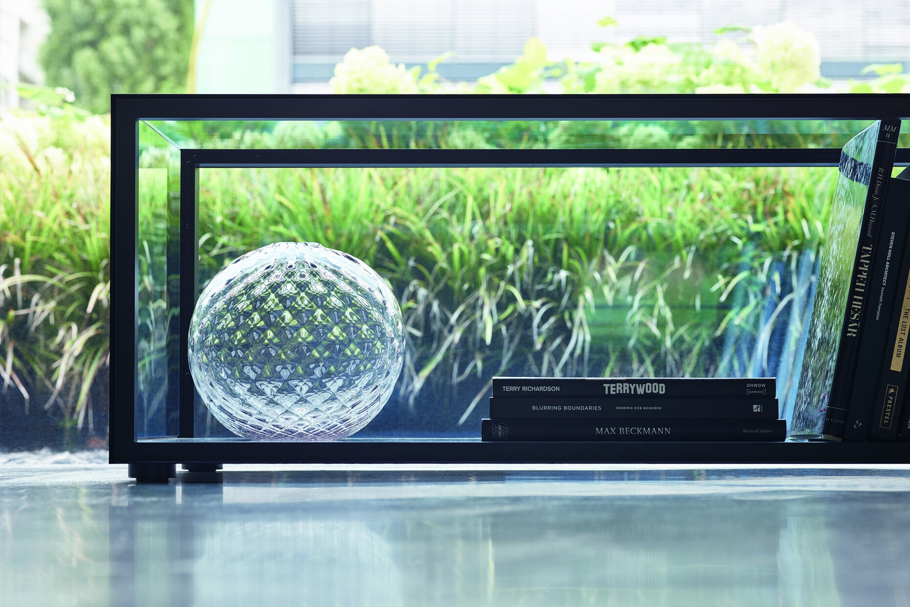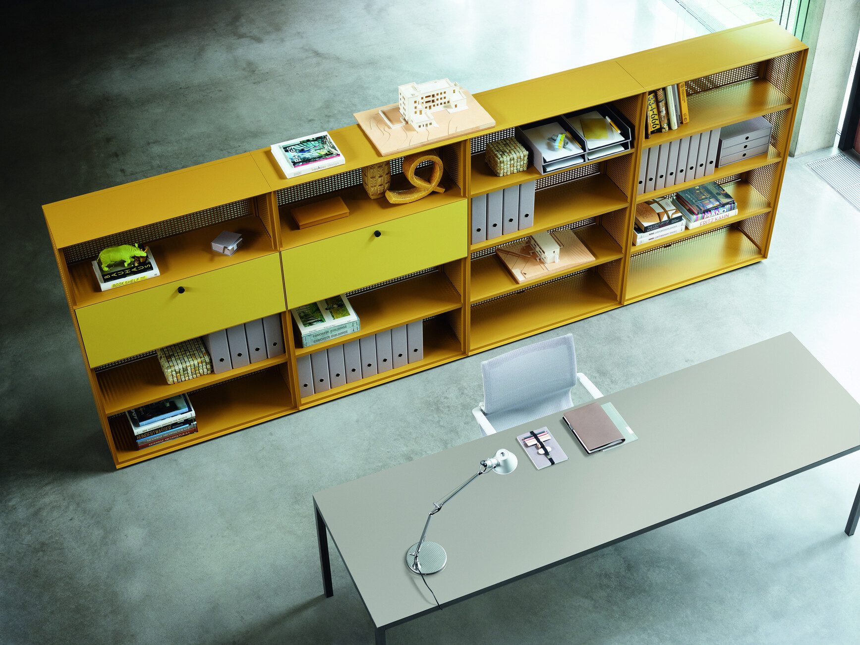 „Mesh“, sprich Gitter, heißt das Regalsystem, das anstelle eines festen Korpus mit einem filigranen Aluminiumgestell aufwartet. Elemente aus Lochblech und farbig getöntem Glas lassen eine individuelle Gestaltung zu. „Es ging darum“, so Aisslinger, „ein langlebiges Hybrid zu entwickeln, das Wohnen und Arbeiten verbindet, quasi die eierlegende Wollmilchsau“. Von bereits bestehenden Baukastensystemen unterscheidet sich „Mesh“ durch den Einsatz von flexiblen, transparenten und strukturierten Flächen statt durchgängiger Metall- oder Holzplatten. Die Auflösung der geschlossenen Ebenen im System war dabei die erste Herausforderung. Der Designer musste eine tragende Rahmenbauweise finden, damit alle weiteren Elemente ausgetauscht werden können: „Das ist wie bei einem Bauernschrank, man hat einen Rahmen und in der Mitte eine dünne Ausfachung“, erklärt er. Trotz des leichten Gerüstes aus Aluminium sollte das Produkt solide gebaut sein: „Man muss die Mischung finden zwischen Statik, Konstruktion, visueller Stabilität und Proportion.“
