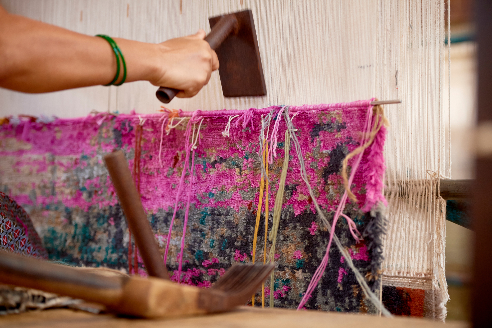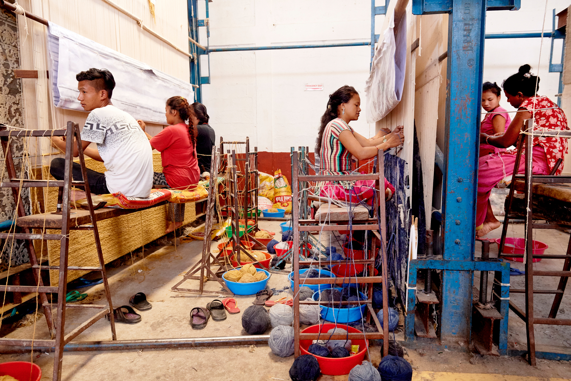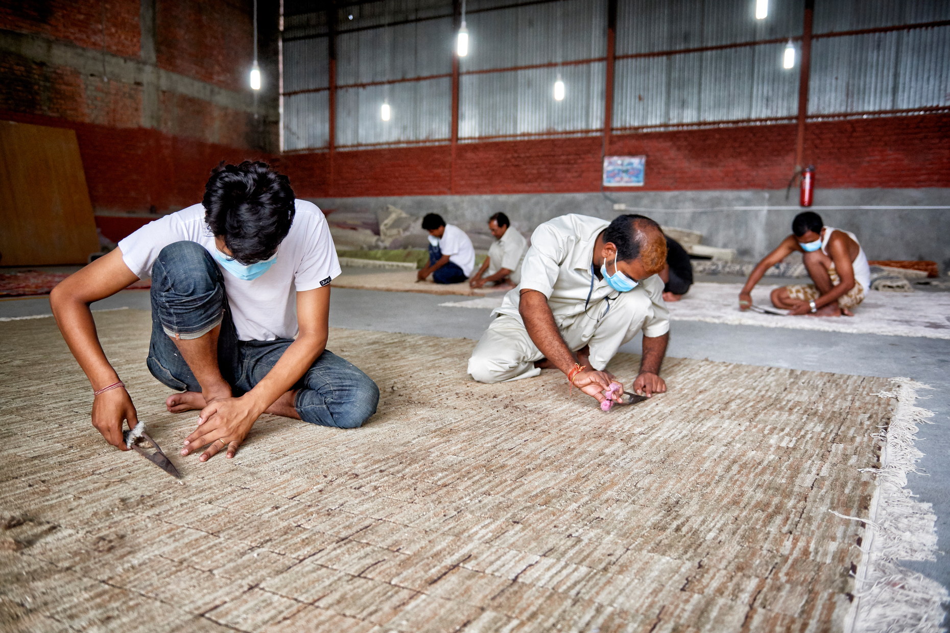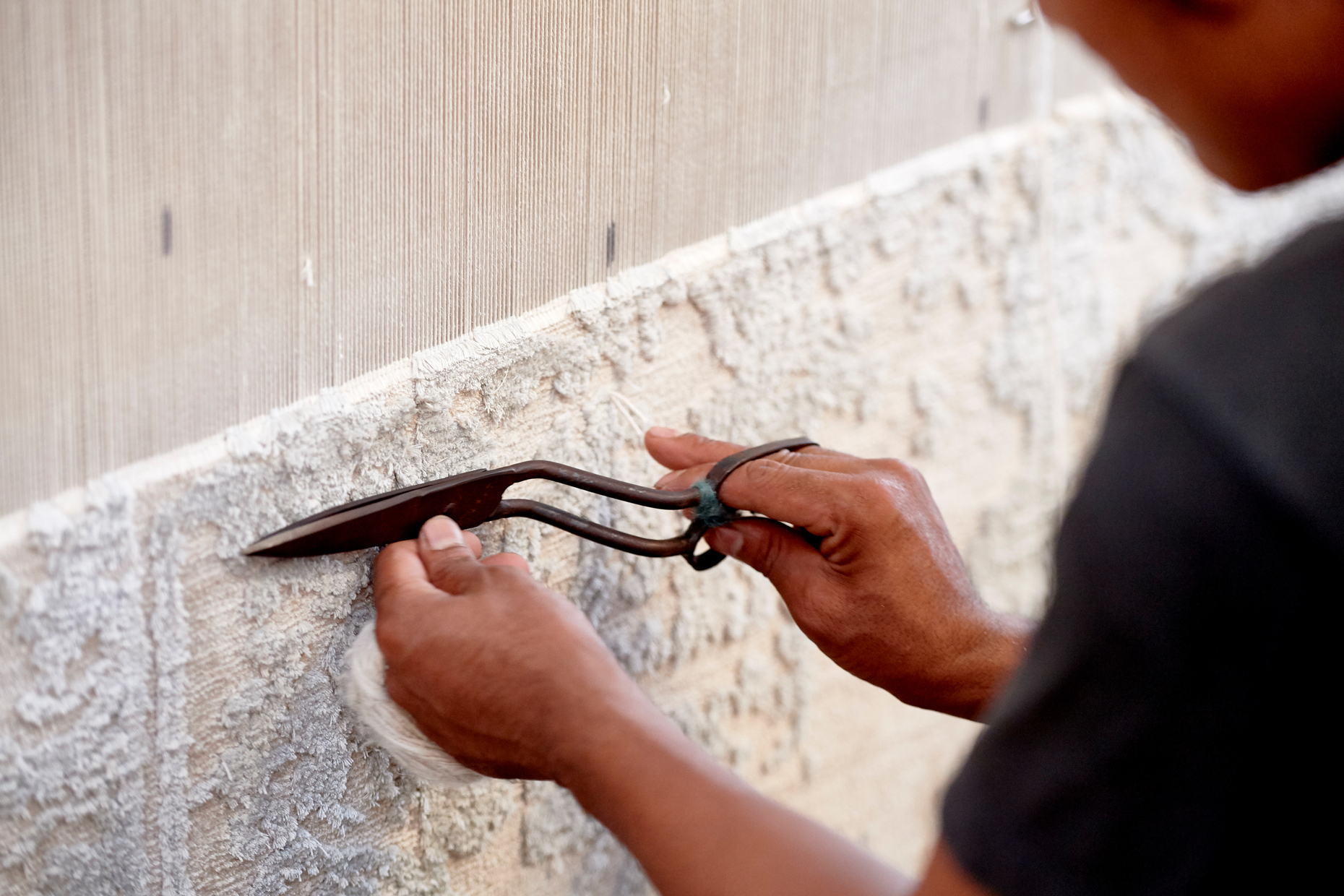 Hier kommen die erfahrenen Mitarbeiter in den Teppichwerkstätten von Jan Kath in Nepal ins Spiel. Mit ihrer Expertise übersetzen sie die Designs in Pläne für die Anordnungen der Knoten. Mehrere Teppichknüpfer fertigen auf dieser Grundlage anschließend in monatelanger Arbeit aus Woll- und Seidenfäden den jeweiligen Teppich. Bis zu 70 unterschiedliche Farben kann er haben. Gefärbt wird die Wolle übrigens ausschließlich mit ökologisch unbedenklichen Pigmenten eines Schweizer Lieferanten. Bei den Teppichen der "Spektrum"-Kollektion besteht die Komplexität insbesondere in den vielfach abgestuften Farbverläufen. Es verlangt große handwerkliche Meisterschaft und viel Konzentration beim Knüpfen, um ein harmonisches Gesamtbild des Teppichs zu erzielen. In Gegensatz dazu liegt die Herausforderung bei Teppichen, die auf traditionellen Mustern basieren, eher im Finishing, dem vorsichtigen Trimmen des fast fertigen Stücks, für das es viel Erfahrung braucht.