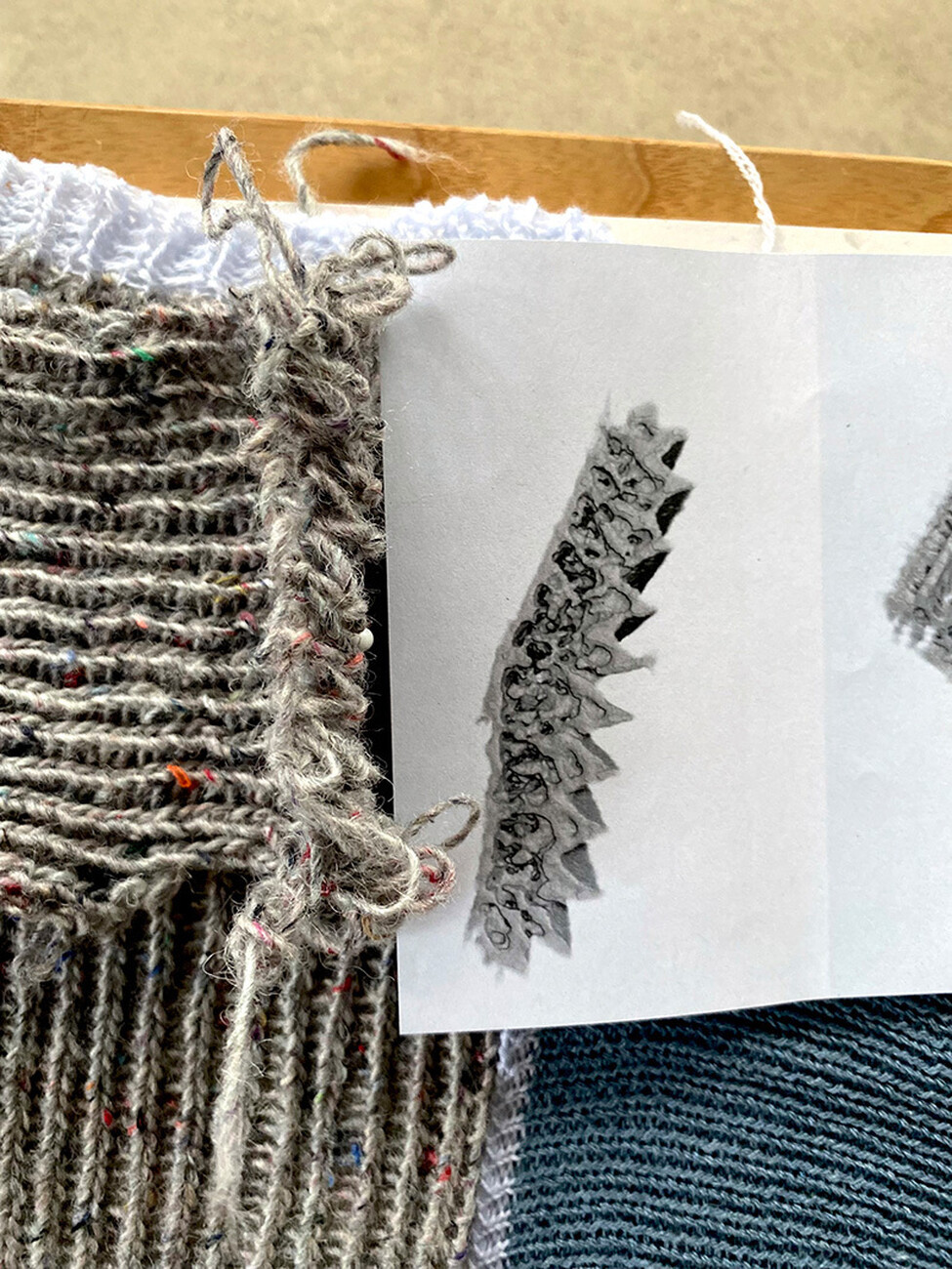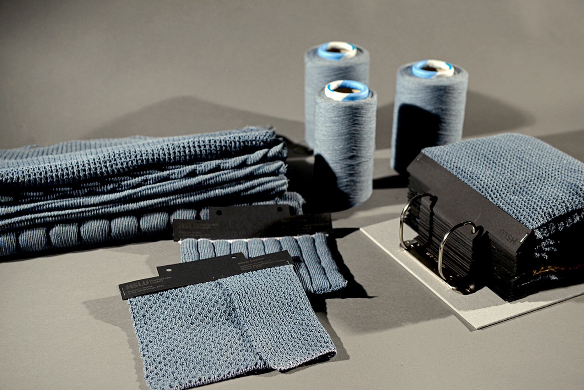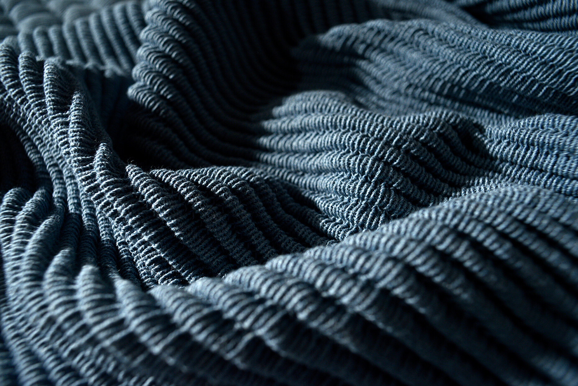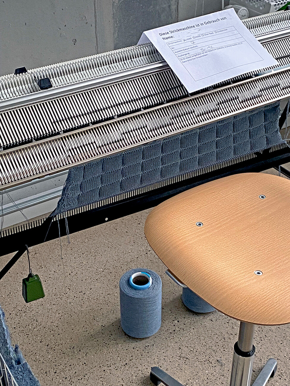 Kateryna Basiuk: Genau. Es geht darin um die akustische Tarnung von speziellen Mottenarten, die sich vor ihrem natürlichen Feind, den Fledermäusen schützen. Unter dem Mikroskop kann man sehen, dass ihre Flügel eine spezielle Struktur haben, die die Ultraschallwellen von Fledermäusen absorbieren. Sie ist ziemlich ähnlich zu klassischem Strick, fast wie Patentmuster. Ich finde es spannend, dass die Absorption von Akustik auch in der Natur stattfindet. Die Struktur der Flügel hat mich dazu inspiriert, sie auf Strick zu übertragen. Also habe ich recyceltes Garn genommen und viel ausprobiert. Später habe ich die Textilien dann akustisch getestet. Es hat sich gezeigt, dass alle positiven Auswirkungen auf Absorption und Schalldämmung vorhanden sind.