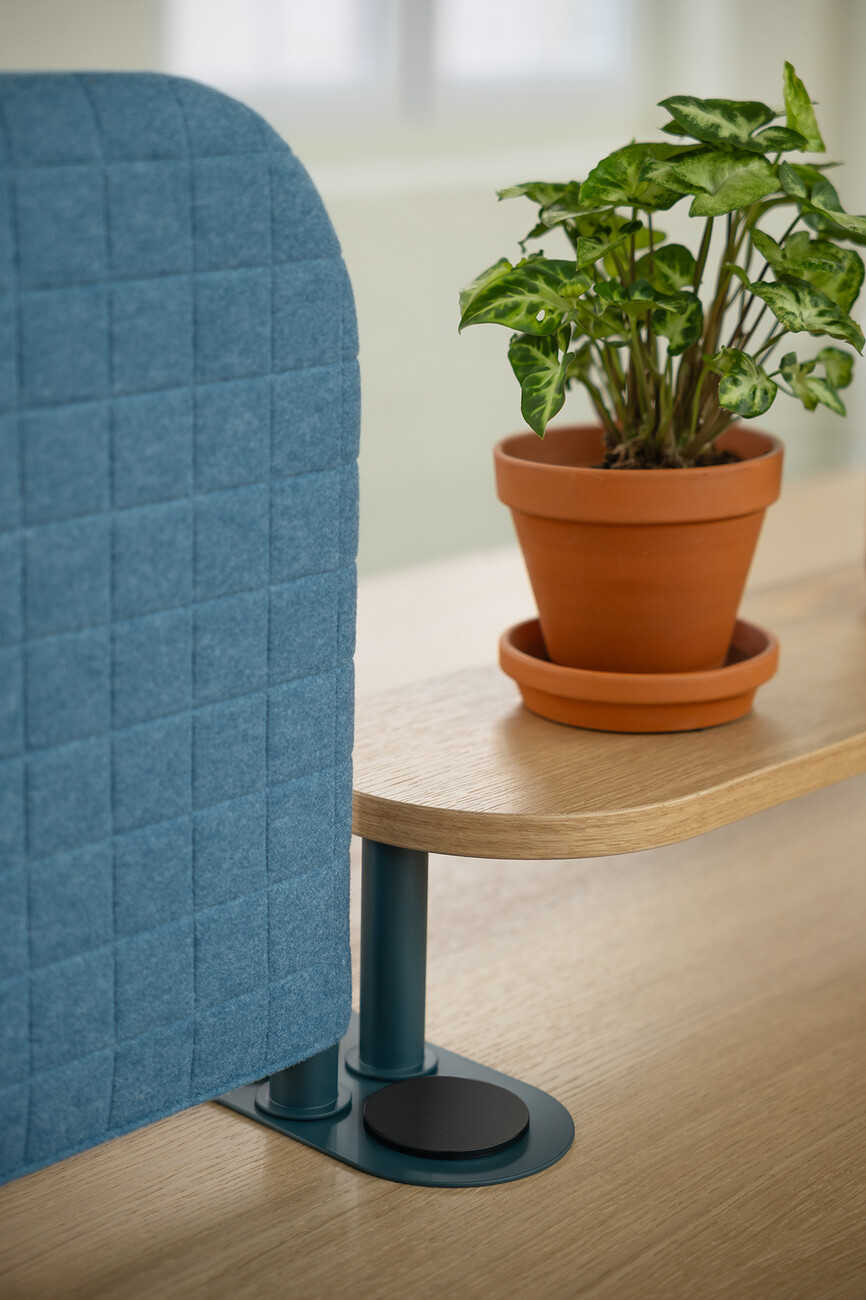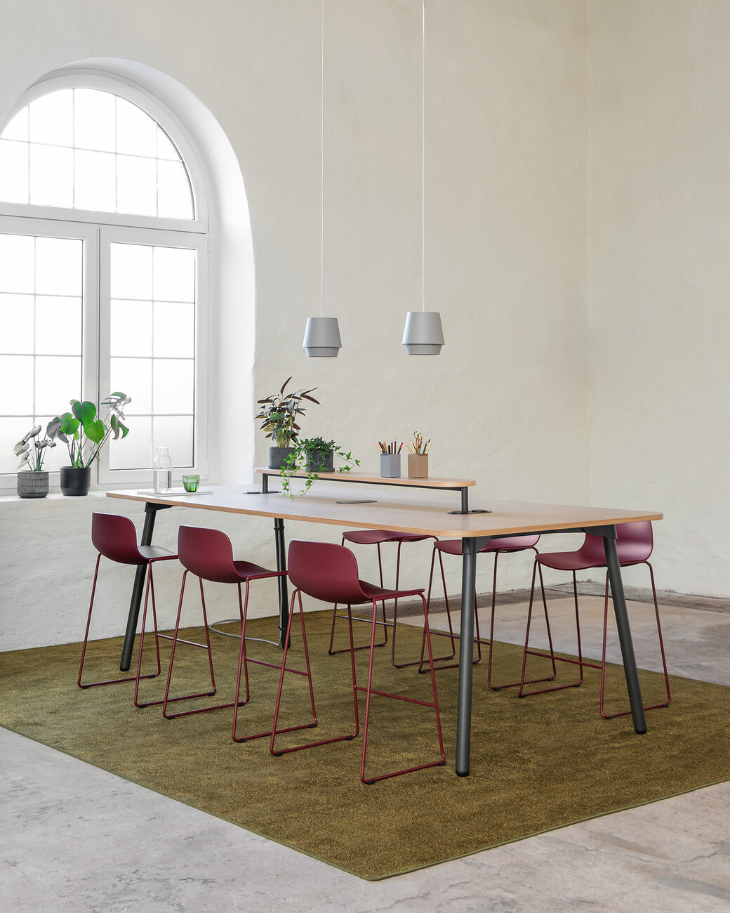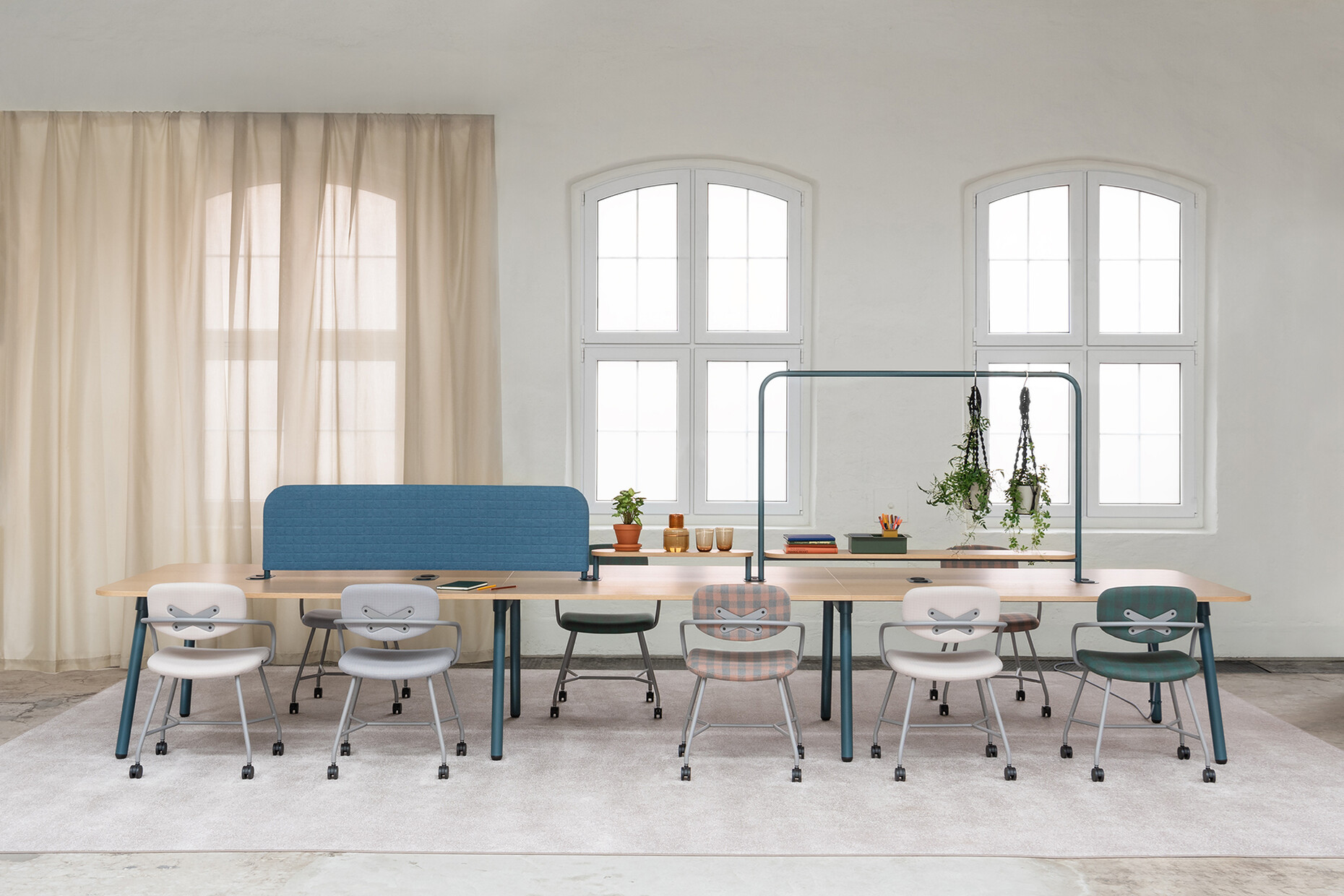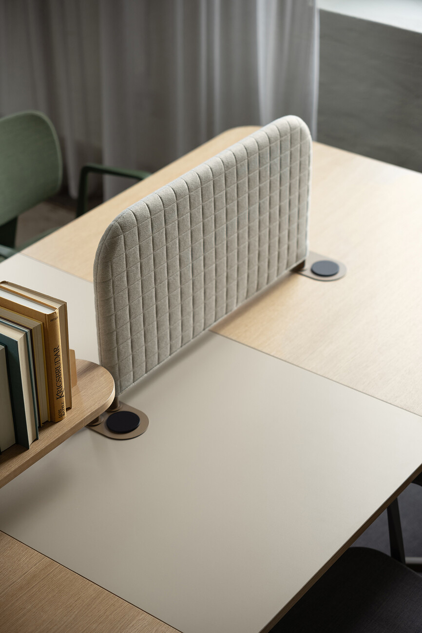 Entworfen von der schwedischen Designerin Marie Oscarsson bietet "Etage" eine Vielzahl von Höhen und Größen sowie passendes Zubehör. Dazu gehört unter anderem eine schallabsorbierende Tischblende aus gestepptem Stoff, die in den "Colours by Materia" ausgewählt werden kann. Auch die flexiblen Gestelle und Details aus Metall können in den Farben Beige, Senfgelb, Staubrosa, Rostrot, Bordeauxrot, Blaugrau, Grün, Grau, Dunkelgrau, Schwarz oder Weiß gestaltet wie kombiniert werden. Die Tischplatte wird indes je nach Bedarf aus Eichenfurnier oder beigem HPL-Laminat gefertigt.
