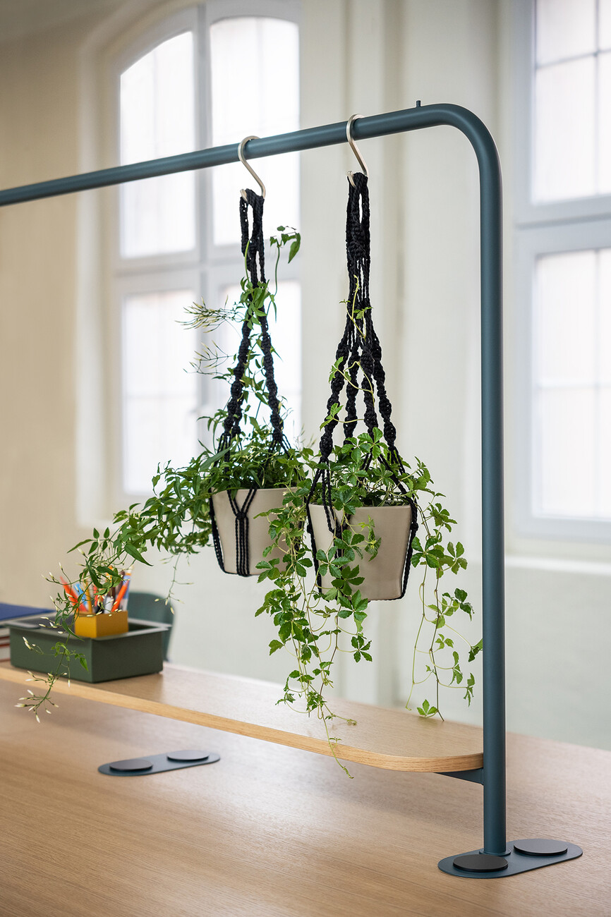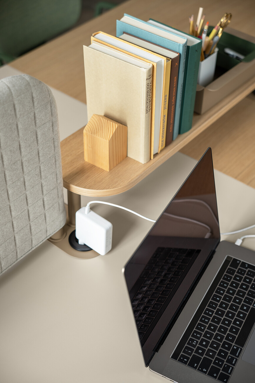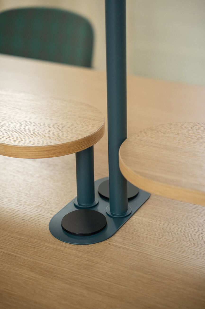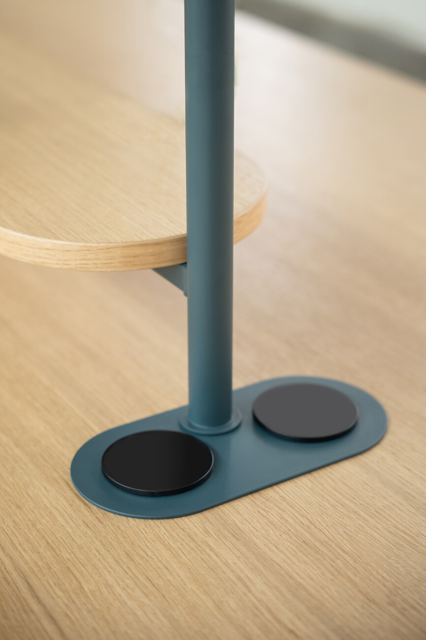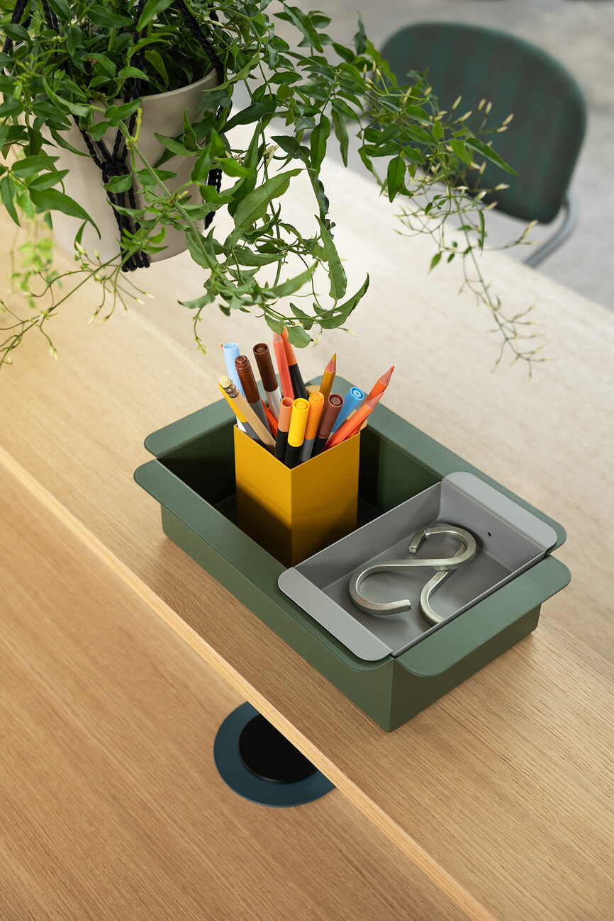 Entworfen von der schwedischen Designerin Marie Oscarsson bietet "Etage" eine Vielzahl von Höhen und Größen sowie passendes Zubehör. Dazu gehört unter anderem eine schallabsorbierende Tischblende aus gestepptem Stoff, die in den "Colours by Materia" ausgewählt werden kann. Auch die flexiblen Gestelle und Details aus Metall können in den Farben Beige, Senfgelb, Staubrosa, Rostrot, Bordeauxrot, Blaugrau, Grün, Grau, Dunkelgrau, Schwarz oder Weiß gestaltet wie kombiniert werden. Die Tischplatte wird indes je nach Bedarf aus Eichenfurnier oder beigem HPL-Laminat gefertigt.