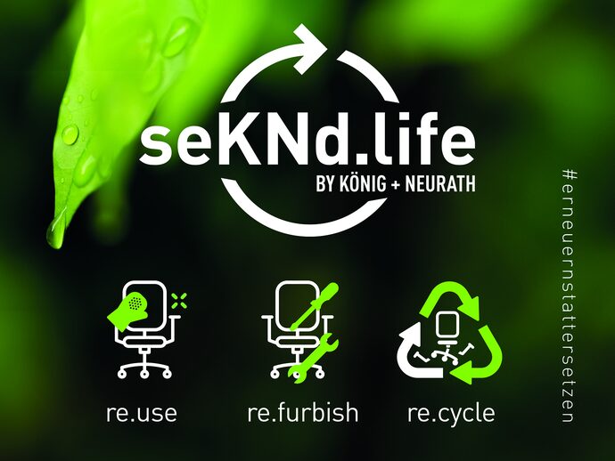 seKNd.life steht für die herstellerunabhängige Rücknahme in Projekten, professionelle Aufbereitung und Weiterverwendung von Büromobiliar sowie das ressourcenschonende Recycling. Der Service umfasst die Bestandsaufnahme, Bewertung, Aufarbeitung und Re-Implementierung der Möbel – europaweit und nach hohen Qualitäts- und Nachhaltigkeitsstandards. Die Produktion trägt bis heute das Qualitätssiegel "Made in Germany" und ist auf eine Größe von über 90.000 Quadratmeter mit eigener Holz- und Metallverarbeitung gewachsen. Der ganzheitliche Ansatz von König + Neurath wurde bereits zahlreich mit dem European LEVEL Zertifikat für Büromöbel ausgezeichnet, das Nachhaltigkeitsaspekte wie Material, Energie, Chemikalien und soziale Verantwortung bewertet. Nahezu alle Produkte von König + Neurath in den Kategorien Tische, Schränke, Stellwände und Sitzmöbel sind zertifiziert und haben das höchste Zertifizierungsniveau "LEVEL 3" für höchste ökologische Ansprüche erreicht. Parallel tragen die Produkte von König + Neurath den Blauen Engel in den Kategorien Tische, Stauraum und Raumgliederungssysteme (DE-UZ 38) sowie Polstermöbel (DE-UZ 117). Die nächste Zielmarke ist bereits gesetzt: Bis 2030 plant König + Neurath klimaneutral zu sein.