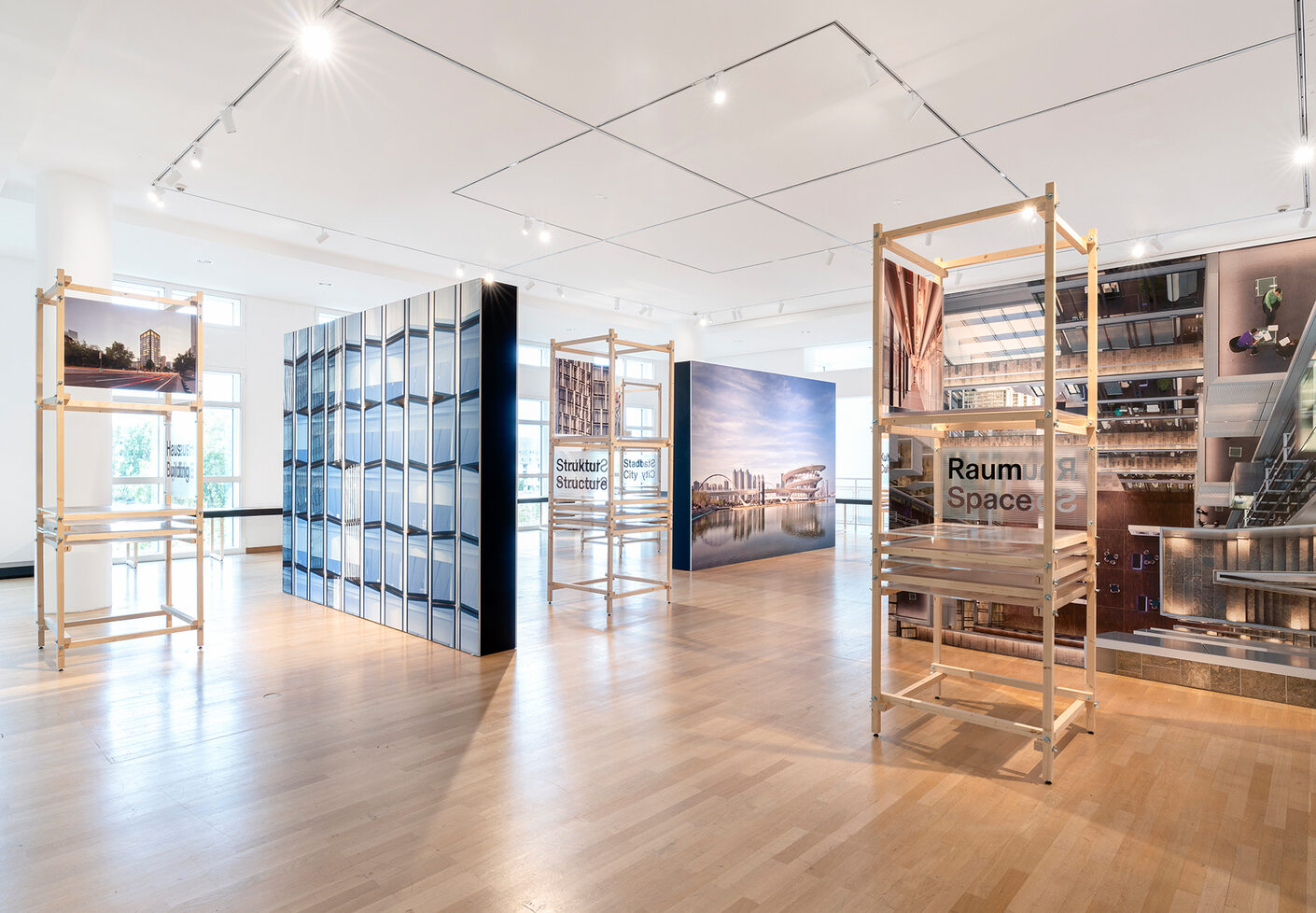 Cornelia Hellstern und Roland Pawlitschko haben das Ergebnis der "Carte Blanche" gestaltet, die das Museum Angewandte Kunst in Frankfurt am Main an KSP Engel ausgestellt hat. "Herr Engel wollte unter keinen Umständen eine Nabelschau", so Hellstern. Keine Retrospektive sollte das Ergebnis also werden und parallel als Wanderausstellung dienen. Im ersten Raum des Obergeschosses kann nun ein Schaudepot mit Architekturmodellen auf Schwerlastregalen begutachtet werden, kuratiert von Mario Lorenz. Auf dem zweiten Abschnitt öffnet sich eine weite Fläche, in dem freistehende Wandscheiben sowie turmähnliche Aufbauten zu sehen sind und die viel Freiraum für die Entdeckung lässt. Die für KSP Engel sechs wesentlichen Typologien und Themen Ort, Stadt, Haus, Struktur, Raum, Kultur werden aufgegriffen und geben Einblicke in das komplexe Schaffen des Architekturbüros. "Wir zeigen nicht ein Projekt nach dem anderen, sondern schauen nach den Inhalten und was eigentlich hinter dem Büro steckt", so Hellstern. Als "Werkzeuge", die sich aus den Methoden, Strategien und Lösungsansätzen für zukunftsfähige Gebäude und Quartiere ableiten, haben sie die Vielschichtigkeit, Maßkonfiguration, Sensibilität, Vernetzung sowie Resilienz herauskristallisiert. Die Besucherinnen und Besucher können erkunden, wie diese für die bis in die Details durchdachten Planungen eingesetzt werden, die einer qualitativ hochwertigen Architektur vorangehen.