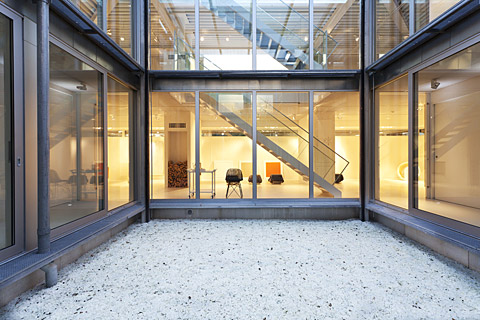 Auch im Inneren des Studios, das häufig von Künstlern wie Filmemachern, Fotografen, Musikern und Autoren als kreativer Rückzugsort gemietet wird, setzt der Architekt das Spiel von Abgeschlossenheit und Offenheit fort: Große Räume wechseln sich mit kleinen intimen Einheiten ab, unterschiedliche Lichtverhältnisse und Perspektiven entstehen mit Hilfe von Schiebetüren, beweglichen Wänden, halbtransparenten Vorhängen sowie Glasflächen, die auf Wunsch blickdicht werden.