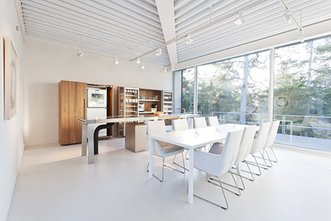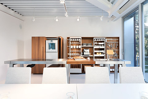 In diese variablen Räume passt die mobile und anpassungsfähige Küchenwerkstatt b2 von bulthaup, bestehend aus den drei Elementen Werkbank, Werkschrank und Geräteschrank, die jederzeit ergänzt, umgestellt und anders kombiniert werden können. Im geschlossenen Zustand setzen die drei Module das architektonische Konzept des Studio Furillen fort, bei offenen Koffertüren wird der Inhalt der Küche sichtbar und ist sofort einsatzbereit.