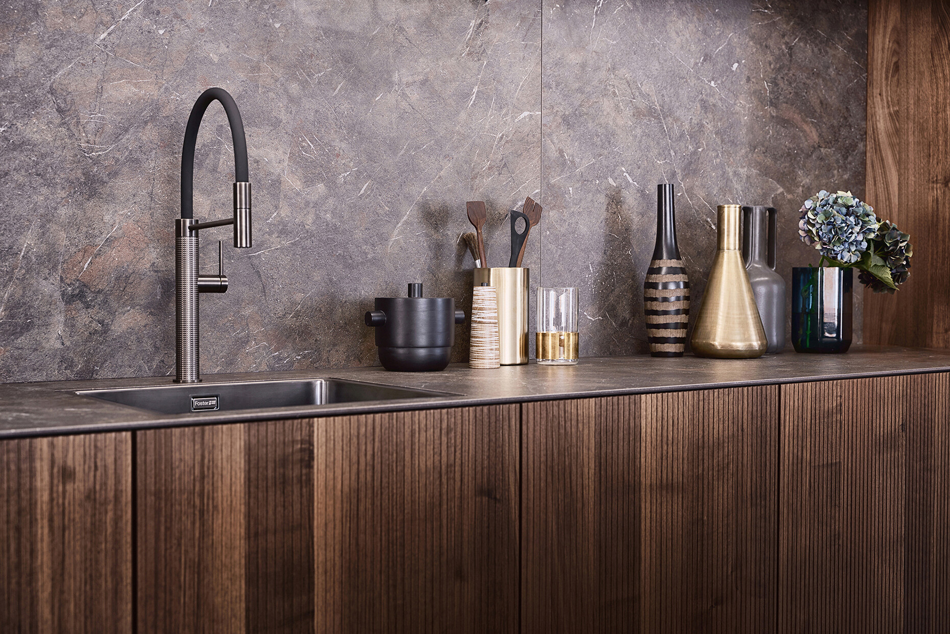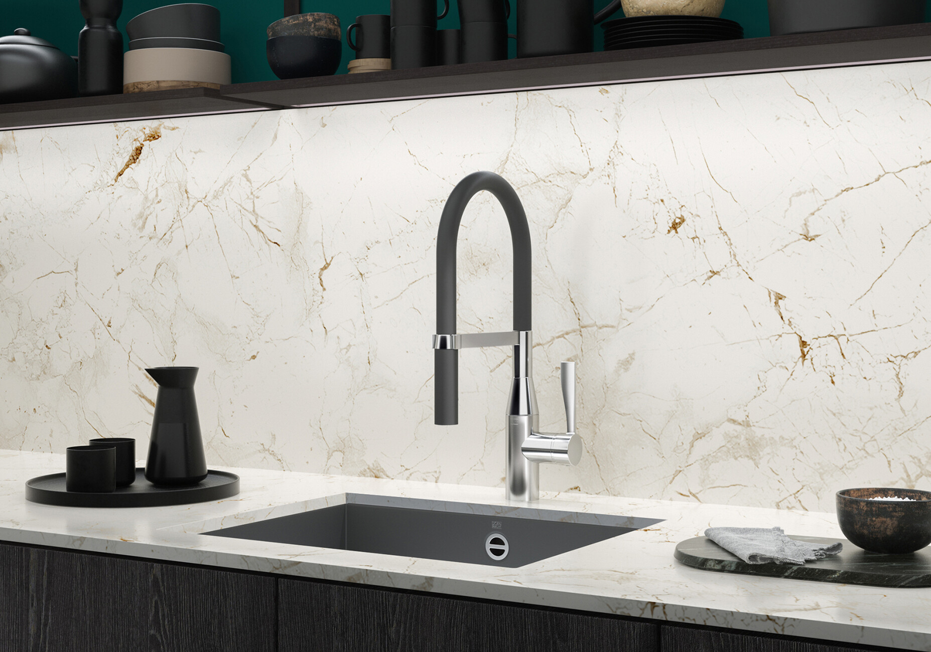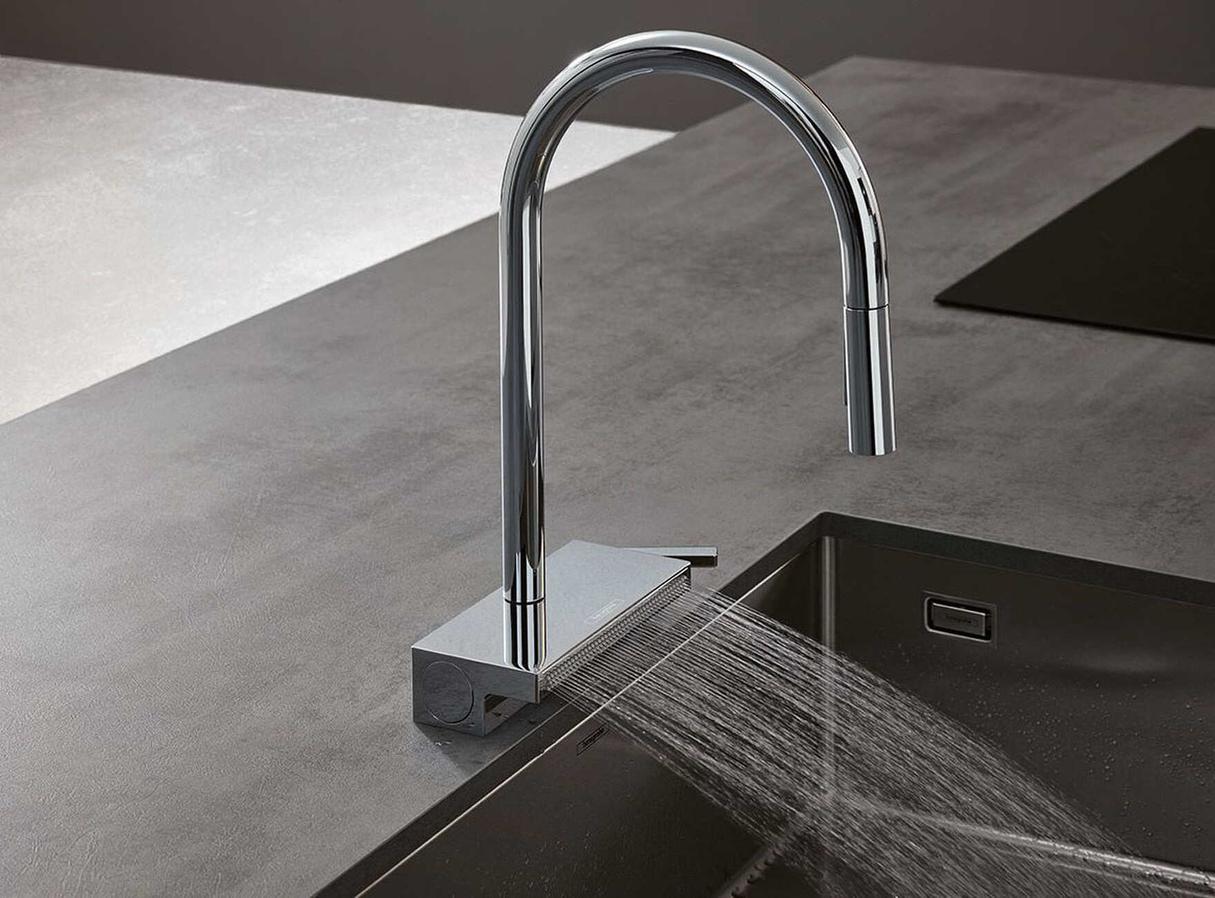 "Sync" heißt der kompakte Profi-Einhebelmischer von Dornbracht, der für mehr Flexibilität in der Küche sorgt: Der nach unten herausziehbare Auslauf mit Brausefunktion ermöglicht ein bequemes Arbeiten in der Küche und vergrößert den Aktionsradius rund um das Becken. Der lange Hebel und der ergonomische Öffnungswinkel von 90 Grad erleichtern zudem die richtige Dosierung der Wassermenge. Via Knopfdruck kann zwischen Strahlarten gewählt werden – dem sanften Laminar- und dem kräftigen Brausestrahl – die eigens für "Sync" entwickelt wurden. Mit einer Höhe von nur 45 Zentimetern und einer Ausladung von 20 Zentimetern eignet sich die neue, kleine Profiarmatur zudem auch für Küchen mit begrenztem Platz um die Wasserstelle.