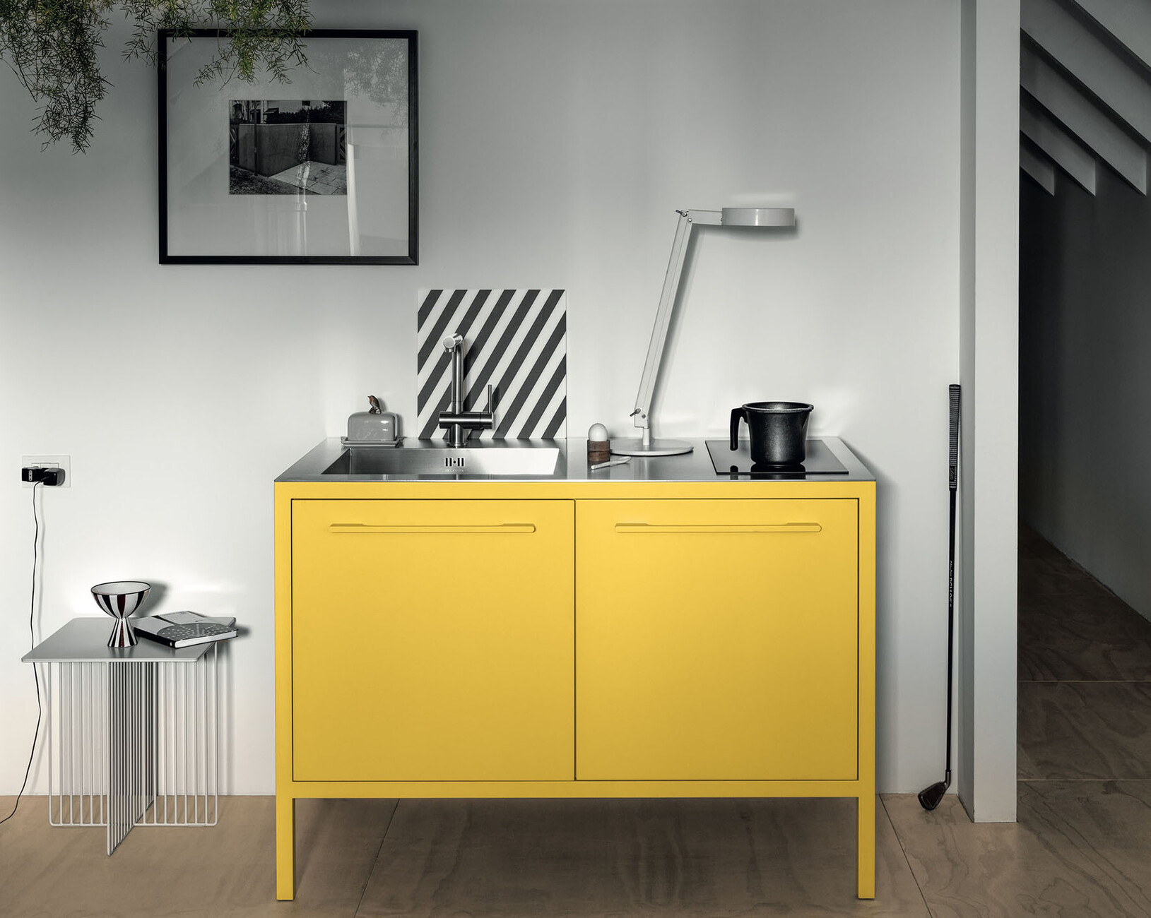 Mit der Küche "Frame" von Salvatore Indriolo bringt Fantin Farbe ins Spiel: Die Module lassen sich in unterschiedlichen Größen und Farben realisieren. Drei verschiedene Höhen sowie zwei Breiten können so in zahlreiche Raumlösungen übersetzt werden. Neben Schränken wartet das Programm mit Funktionselementen wie Spüle, Induktionskochfeld oder Backofen auf. Die charakteristisch geschweißten Vierkantrohrrahmen sind dabei immer sichtbar und unterstreichen die optische Wirkung der langlebig gebauten Möbel. Die vier Millimeter dicke Arbeitsfläche aus Stahl ist in satinierter oder in Vintageausführung verfügbar und kann mit jedem Finish der Reihe kombiniert werden. Die Farbpalette erstreckt sich über 46 Nuancen, die von neutralen Tönen wie Beige und Grau bis hin zu den intensiven Farben wie Orange und Rot reichen. Um einen monochromen Look zu schaffen, lassen sich alle Module auch mit einer ultra-matten "Fenix NTM"-Arbeitsplatte ausstatten.
