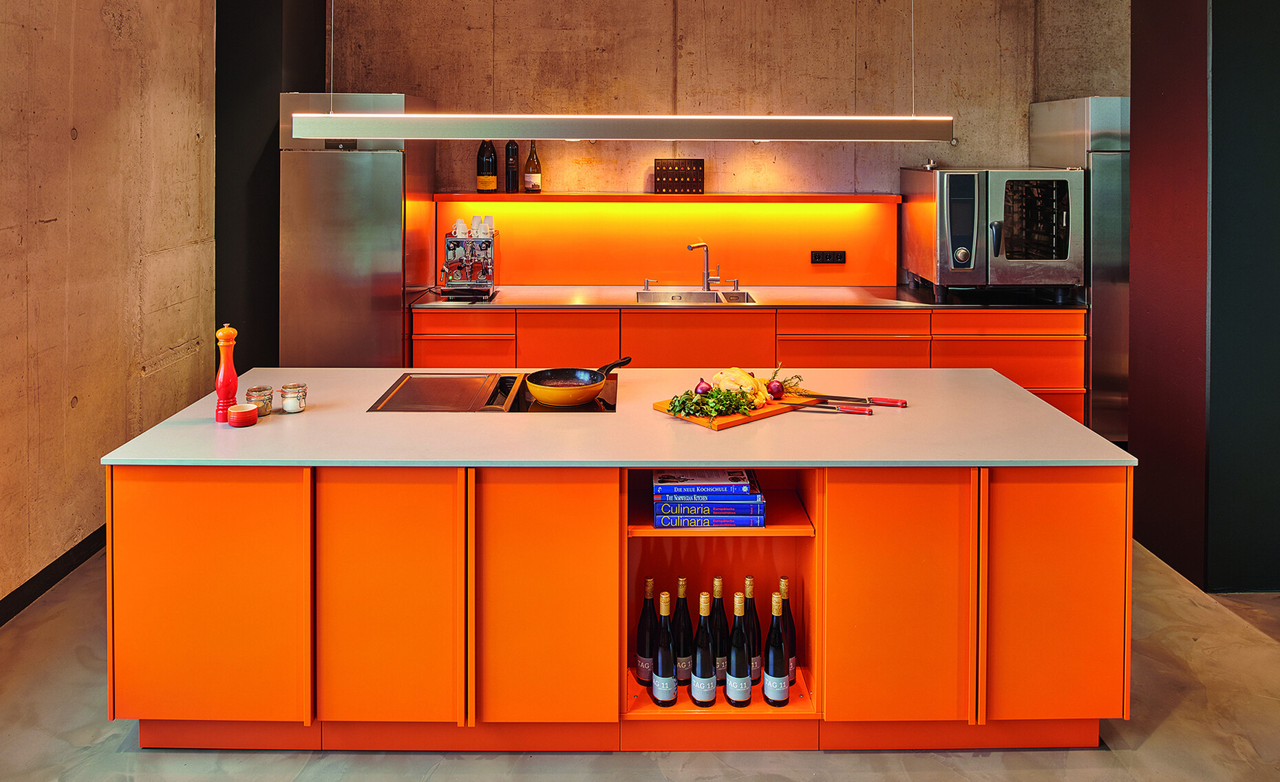 Mut zur Farbe in der Küche – bei Popstahl ist das kein Problem. Der Korpus und die Fronten werden aus gefaltetem Stahlblech hergestellt. Eine spezielle Füllung der Fronten sorgt dabei für einen satten, warmen Klang, eine angenehme Haptik und garantiert, dass sich das Metall auch nach langjähriger Nutzung nicht verformt. Im Pulverbeschichtungsverfahren wird das Farbpulver ohne Zusatz von Lösungsmitteln auf das Metall aufgesprüht. Bei der anschließenden Erhitzung des Werkstückes auf etwa 200 Grad Celsius verläuft das Farbpulver und verbindet sich mit dem Metall zu einer dauerhaften Oberflächenbeschichtung. Zwischen über 200 Farben kann für Front und Sockel gewählt werden: Neu im Sortiment sind Kiwigrün, Quittengelb und Lorbeerblau. Da jede Küche nach individuellen Wünschen und Ansprüchen geplant und gefertigt wird, sind zudem die Optionen ein- oder mehrfarbig sowie Edelstahl-, Holz-, Beton- oder Naturstein-Arbeitsplatte, großzügige Kochinsel oder mobile Kompaktküche gegeben.