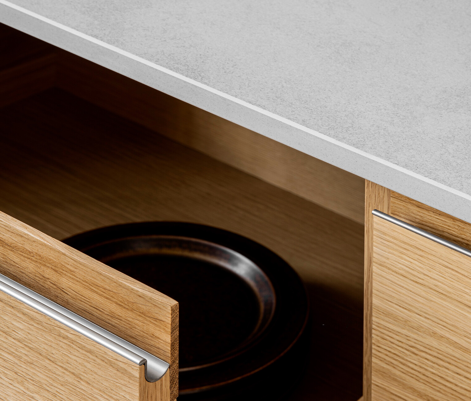 "Profile" heißt das aktuelle Design von Norm Architects für die dänische Küchenmarke Reform. Mit einer integrierten Griffleiste aus Aluminium, die in drei Farbtönen gewählt werden kann, wird die hölzerne Kante der Küchenfront stilvoll geschützt. Das extruierte, abgerundete Profil ist funktional und lässt sich zudem leicht reinigen. Mit "Profile" haben Norm Architects die grifflose Küche weitergedacht und auch für die Arbeitsplatte eine clevere Lösung entwickelt: "Fenix NTM Laminat" ist widerstandsfähig, matt und bietet eine weiche Haptik.