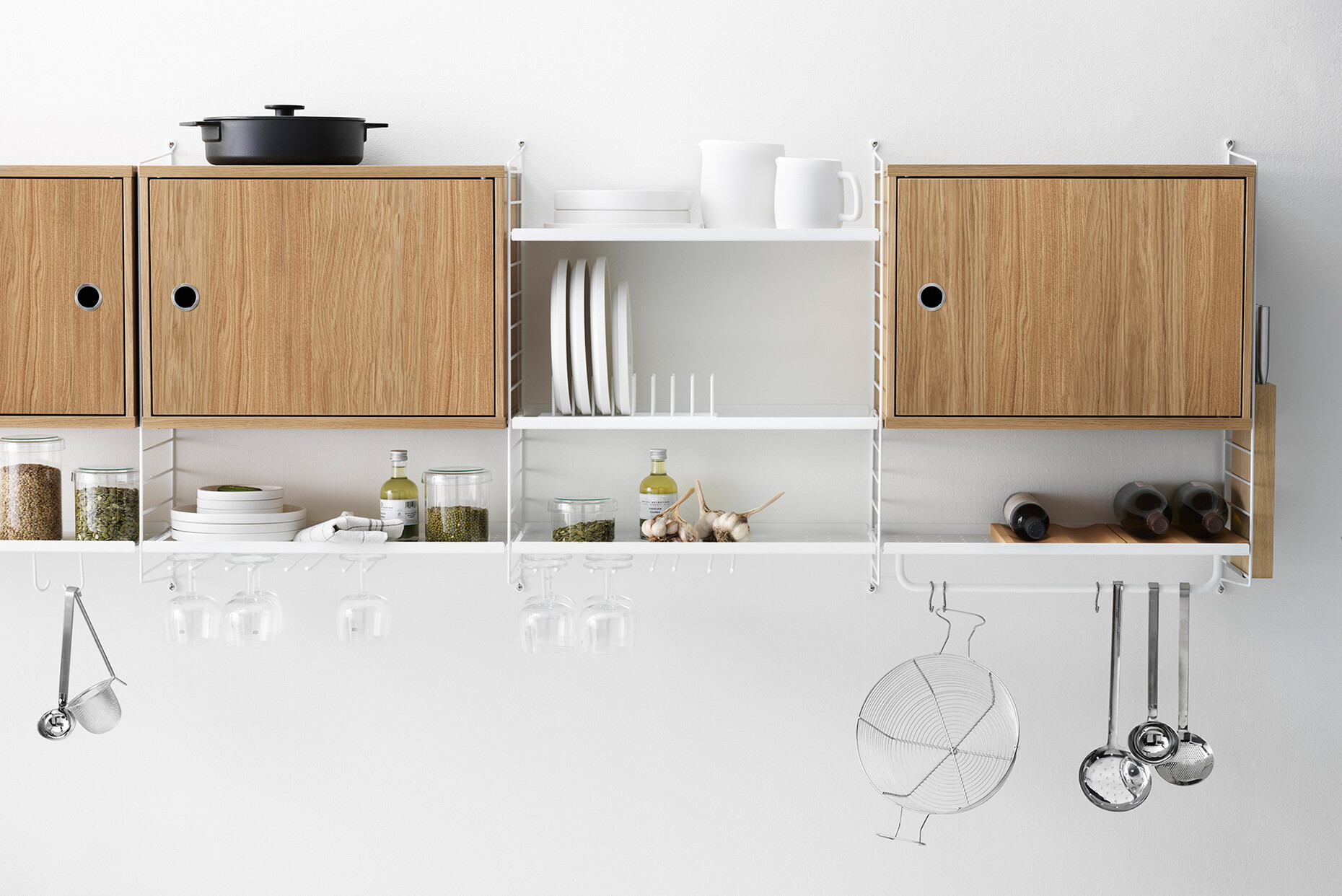 String Furniture addiert seinen Küchenregalen weitere flexible Aufbewahrungselemente hinzu: So kann die Tür des neuen, 58 Zentimeter breiten Schränkchen nach vorne geöffnet werden. Die Tellerablage lässt die Option frei, die Teller seitlich oder von vorne nach hinten anzuordnen. Ein neuer Flaschhalter aus Kork hält jeweils zwei Flaschen liegend an ihrem Platz – ebenso wie weitere passgenaue Korkeinlagen, die bei Bedarf auch auf dem Tisch als Topfuntersetzer dienen können. Das Besteck und weitere Küchenutensilien werden indes von Trenneinsätzen unterteilt. String möchte zudem künftig auf ölbasierte Kunststoffe verzichten und bietet die bisherigen Organizer in unterschiedlichen Größen nun auch aus einem Bioverbundwerkstoff in Beige, Grau und Schwarz an.
