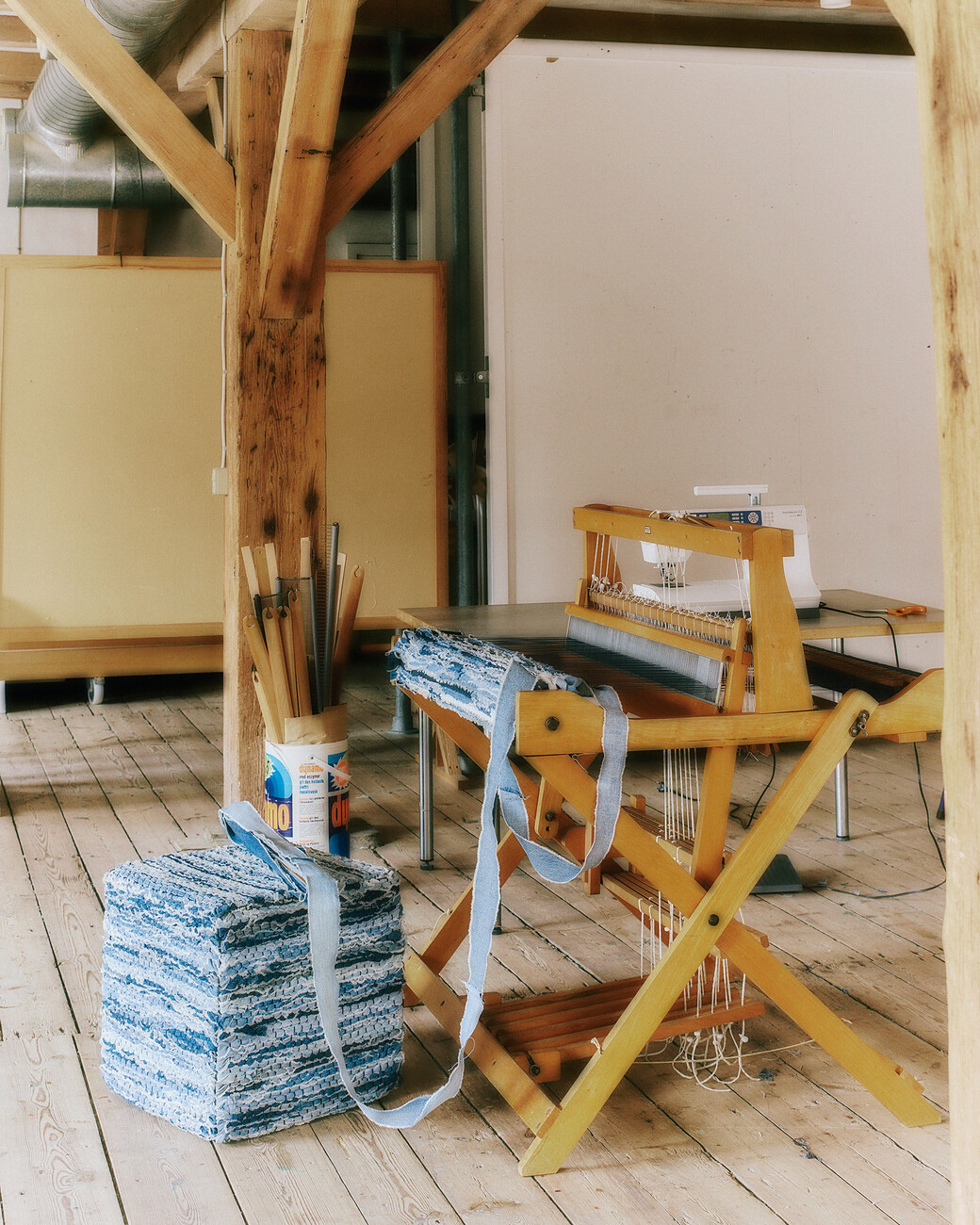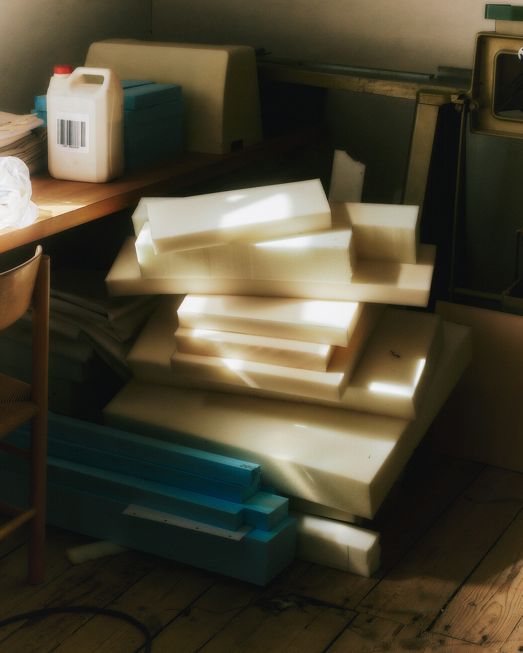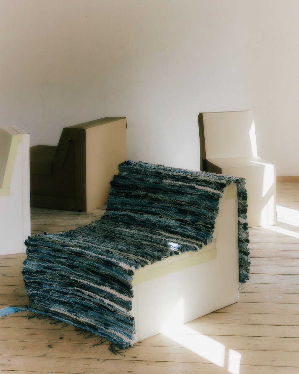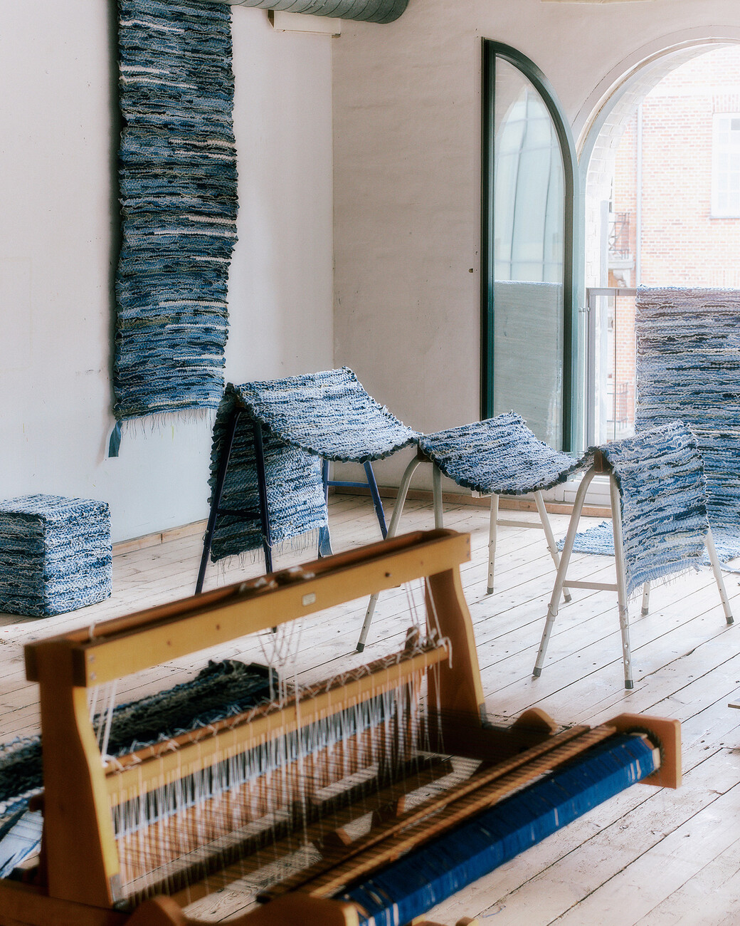 Lærke Ryom: An einer maßgefertigten Möbelserie namens Blue, zwei Stühle mit Bezügen aus aufgewertetem Jeansstoff. Sie ist für eine Ausstellung im Fabrikken for Kunst og Design bestimmt, die sich mit der Geschichte des Gebäudes und der Umgebung von Sundholm befasst. Es gibt verschiedene kleine Anspielungen auf das Thema der Ausstellung. Der Gedanke war, Möbelstücke zu entwerfen, die das Thema Textil wieder aufgreifen, da Fabrikken früher eine Wäscherei war, in der Menschen mit unterschiedlichen Problemen arbeiten mussten. Aus historischer Sicht ist Jeansstoff die Arbeitskleidung für manuelle Arbeit. In dem Stoff, den ich aus kleinen Jeansfetzen herstelle, treffen die verschiedenen Blautöne auf der Oberfläche des Gewebes aufeinander, fast wie Wasser und Wellen. Und im Ausstellungsraum sind blaugrüne Farben an den Wänden zu sehen.
