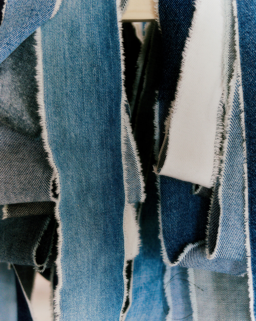 Lærke Ryom: Ich arbeite viel mit der Erstellung von Mustern und der Erkundung verschiedener Materialien mit der Hand – fast so, als würde ich mit ihnen sprechen. Ich habe viele Muster aus verschiedenen Textilien hergestellt, die ich noch von anderen Projekten hatte und die zu klein waren, um sie zu verwenden, aber auch zu groß, um sie wegzuwerfen. Ich suchte nach einer Möglichkeit, diese Art von Textilabfällen zu verwenden. Und wenn ich etwas machen will, für das ich eine große Menge kleiner Stoffreste brauche, wie finde ich sie dann? Die Lösung kam durch das Rote Kreuz und ihre systematische Sammlung von Altkleidern, wo man Jeans mit Löchern oder solche, die nicht mehr verkauft werden können, in großen Mengen kaufen kann. So hat sich alles ganz organisch aus der Arbeit mit dem Material und der Beschaffung von genügend unregelmäßigem Material entwickelt.