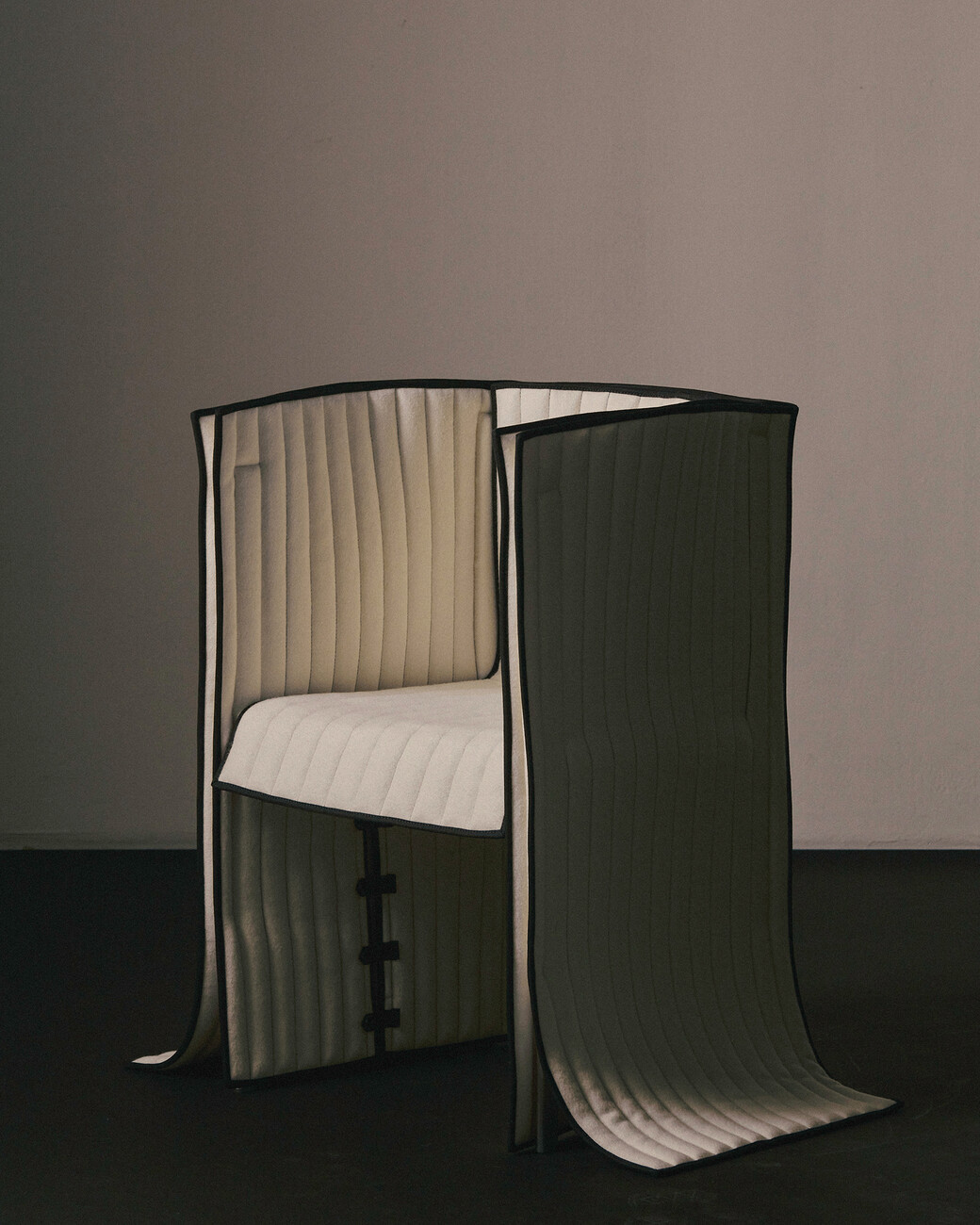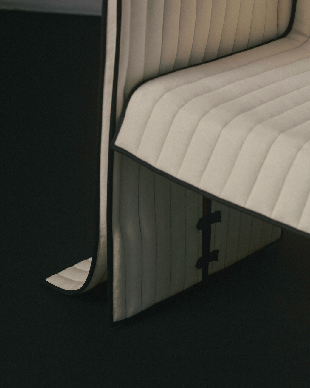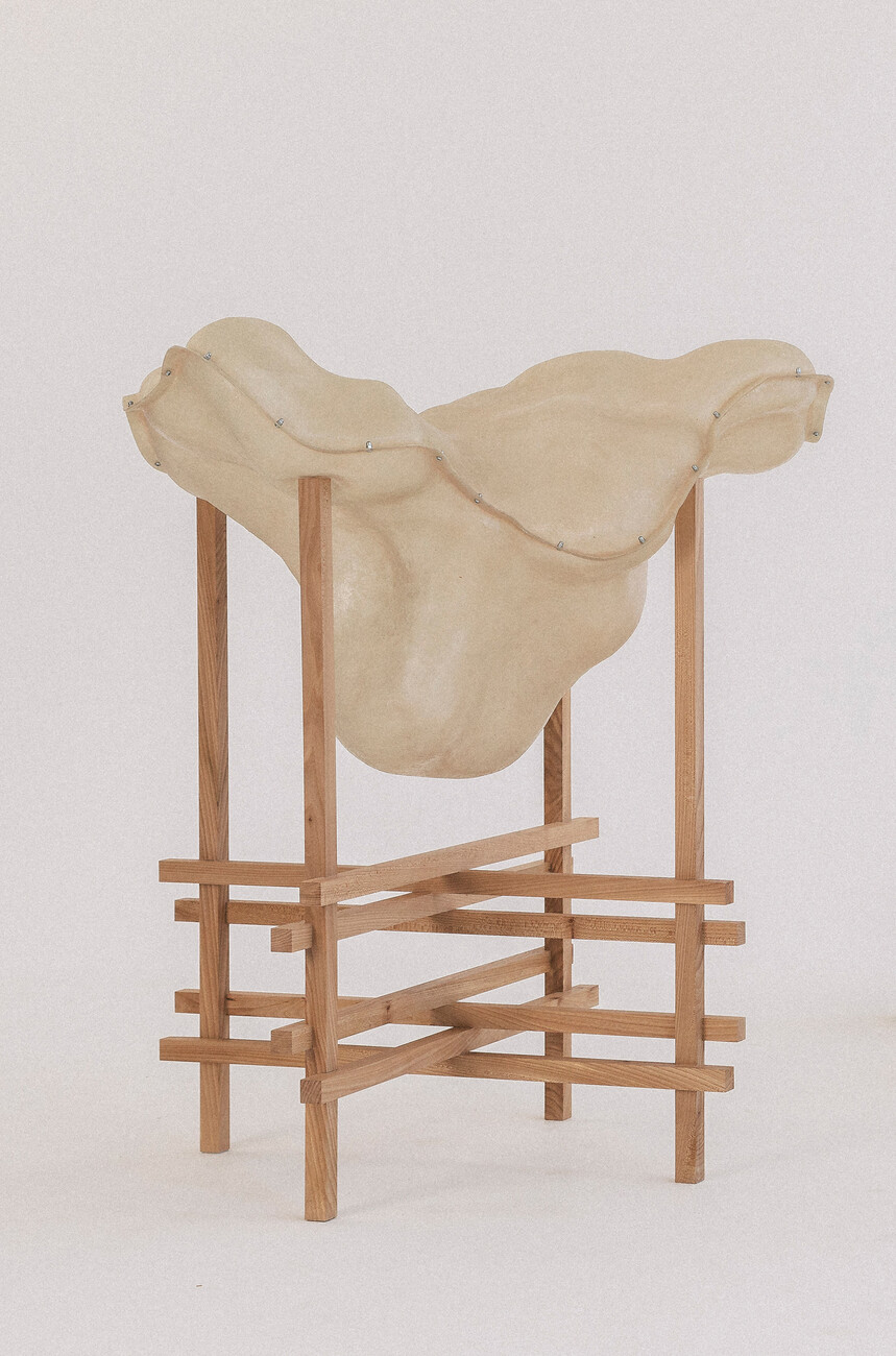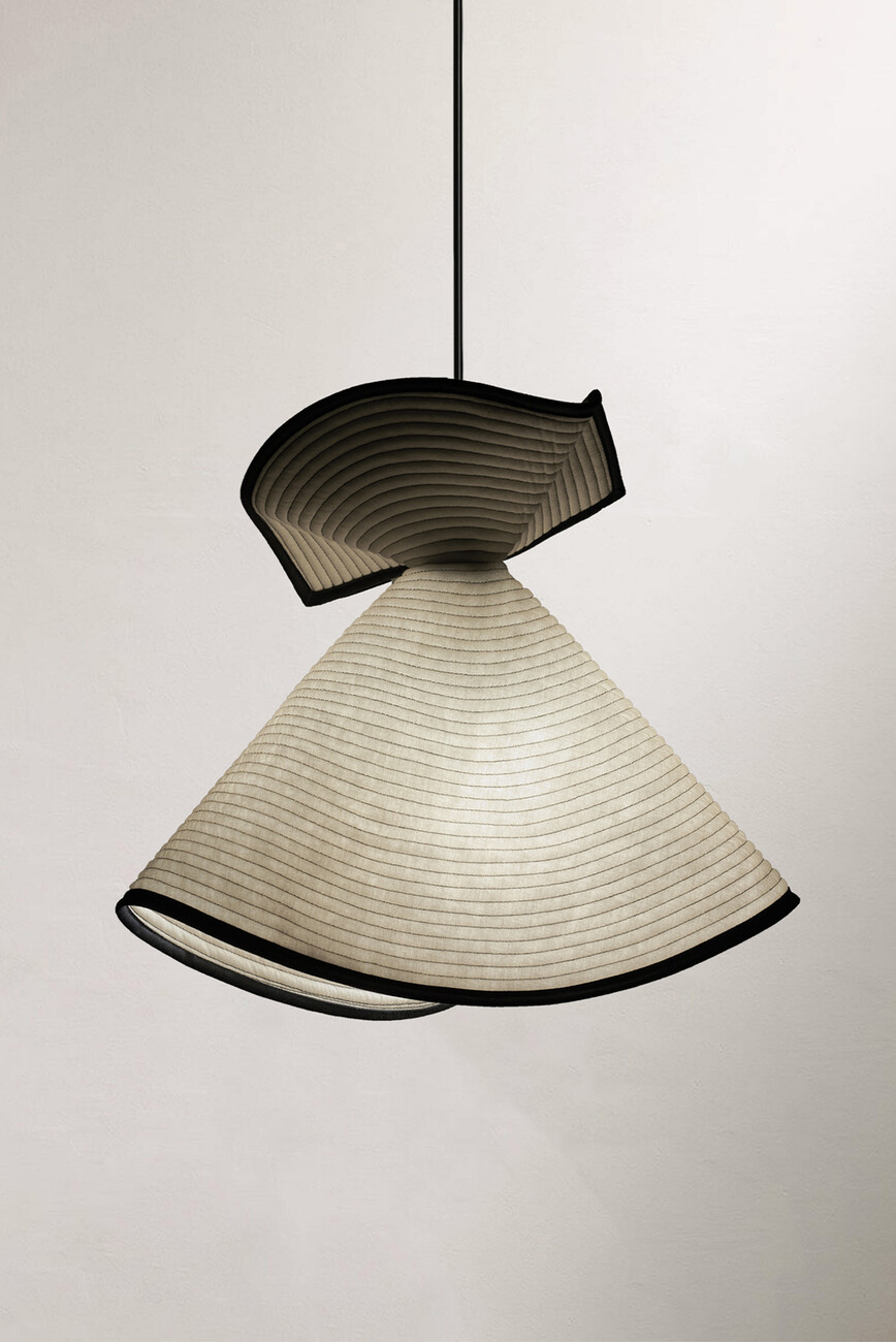 Lærke Ryom: Ich glaube nicht, dass ich jemals nur mit einem Material arbeiten werde, denn jedes hat so viel zu bieten. Aber im Moment bin ich sehr an der Arbeit mit Textilien interessiert. Wenn man mit Metall und Holz arbeitet, ist alles sehr geplant und absichtlich. Bei Textilien muss man auch planen, aber das Material ist lebendiger. Es gibt etwas zurück – sei es der Faltenwurf oder die Bewegung im Material. Es macht sehr viel Spaß, damit zu arbeiten. Ich finde es sehr interessant, Materialien in einen neuen Kontext zu bringen – wie Textilien in Möbel. Für mich ist die Arbeit mit meinen Händen eine Möglichkeit, die Welt zu verstehen. Ich verstehe sie, indem ich sie berühre und mich mit meinem Körper auf die Welt einlasse. Wir sind daran gewöhnt, dass Textilien einen großen Teil unseres Lebens ausmachen, und es gibt eine starke physische Beziehung zwischen Möbeln und dem Körper. Wir beziehen uns sowohl auf die Größe als auch auf die Art und Weise, wie wir interagieren, wie wir am Tisch sitzen, wie wir uns auf den Hocker setzen. Wir sind mit unseren Kleidern in sie eingehüllt. Indem ich einige Techniken von der Kleidung übernehme oder Bezüge zur Kleidung hinzufüge, kann ich mit dieser Beziehung arbeiten und eine engere Beziehung zu einem Möbelstück herstellen.