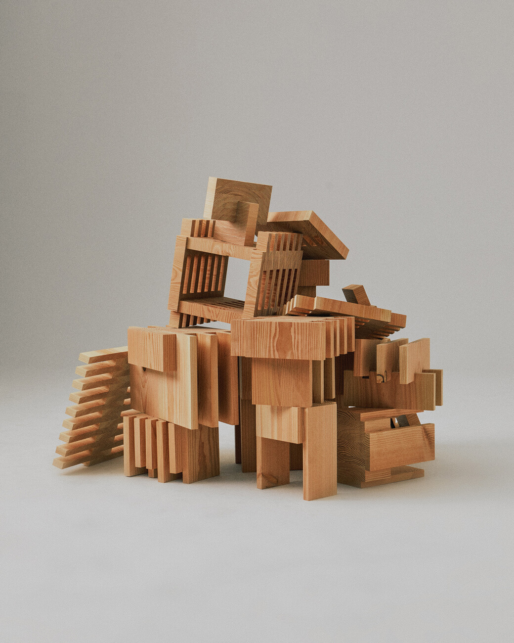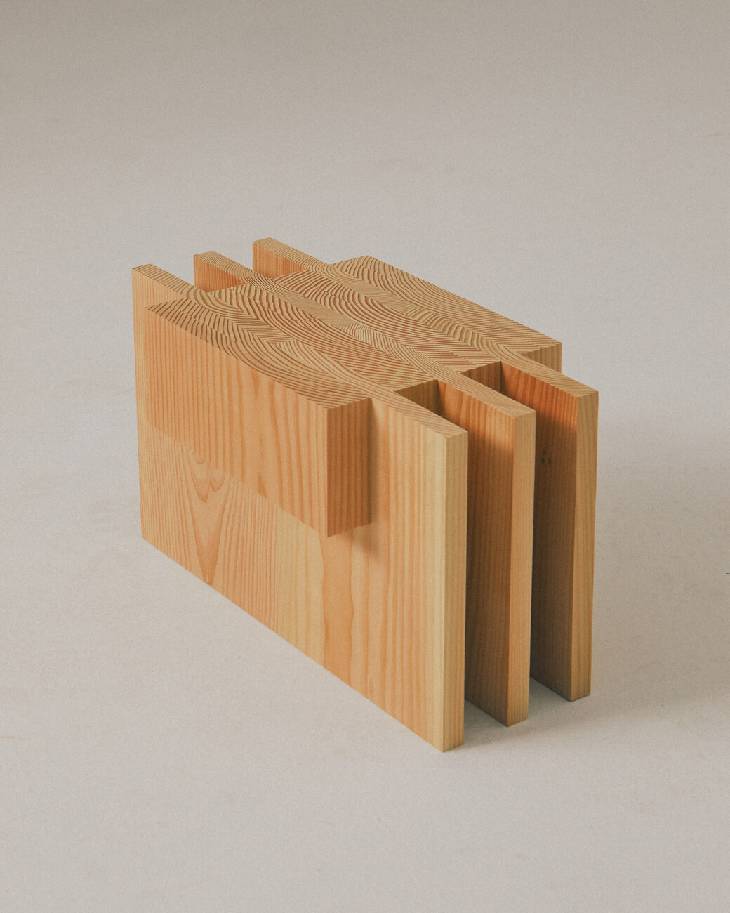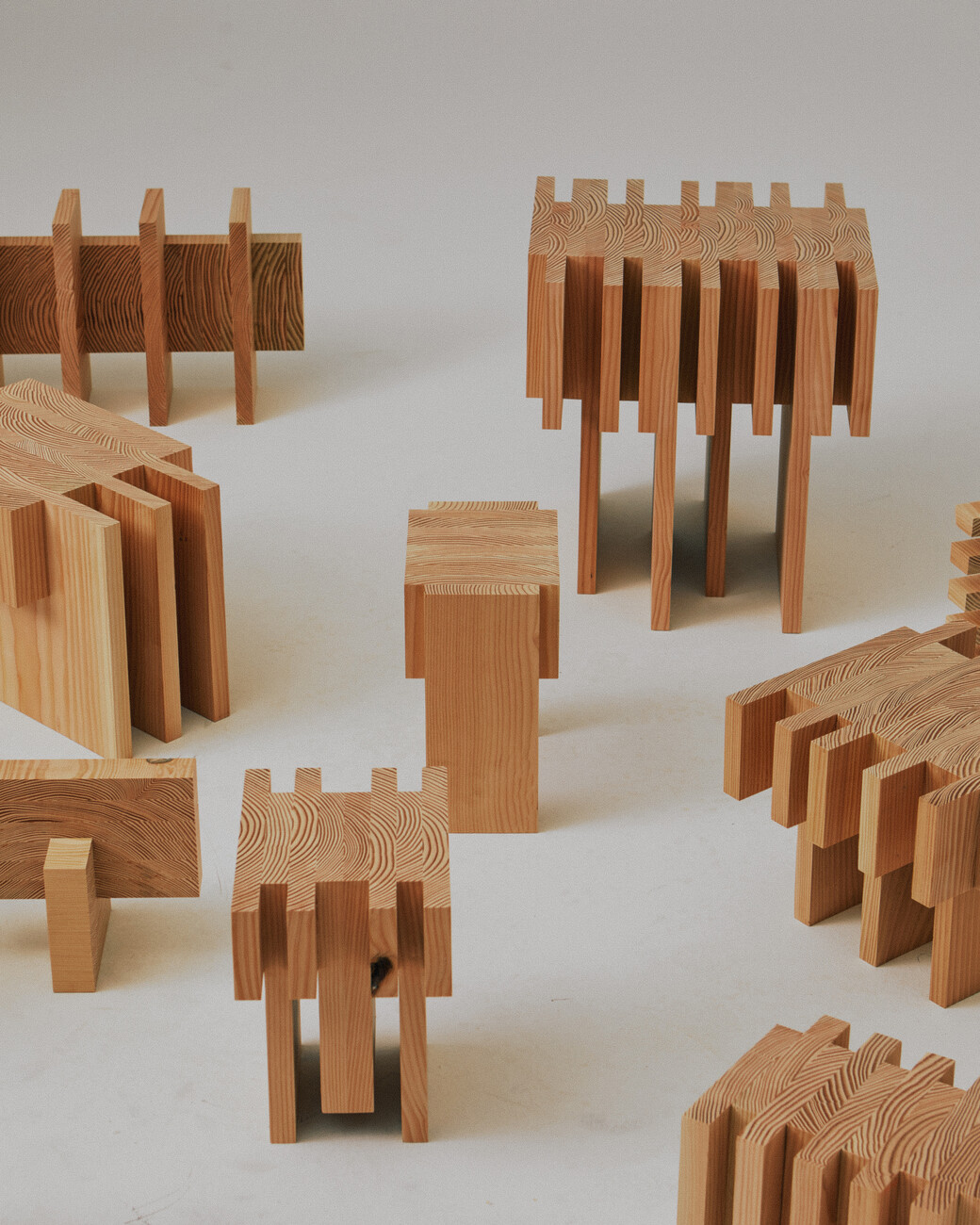 Lærke Ryom: Ein bewusster Umgang mit Materialien und der Verzicht auf Verschwendung spielen dabei eine große Rolle. Heute ist Nachhaltigkeit nicht etwas, das man anwendet oder sich aussucht. Sie ist grundlegend. Bei der Gestaltung gibt es verschiedene Strategien; man kann mit Nebenprodukten und minimalen Konstruktionen arbeiten oder für die Demontage entwerfen, bei der alle verschiedenen Materialien am Ende getrennt werden können. Für mich ist es sinnvoll, in Nebenprodukten einen Wert zu sehen. Es kann ein guter Ausgangspunkt sein, ein kreativer Rahmen für die eigene Arbeit, und es kann inspirierend sein, weil man dann die Grenzen dieses Rahmens wirklich ausreizen kann. Es kann einen an neue Orte bringen. Wenn ich zum Beispiel die Off-Cut Collection aus neuem Material gemacht hätte, würde sie nicht so aussehen wie jetzt. Die Formen, die Formationen, alles basiert auf den verschiedenen Stücken des Nebenprodukts. Die unterschiedlichen Breiten, Größen und Qualitäten der Fußbodendielen inspirierten die Idee zu den versetzten Strukturen, die für die Stücke so charakteristisch sind.