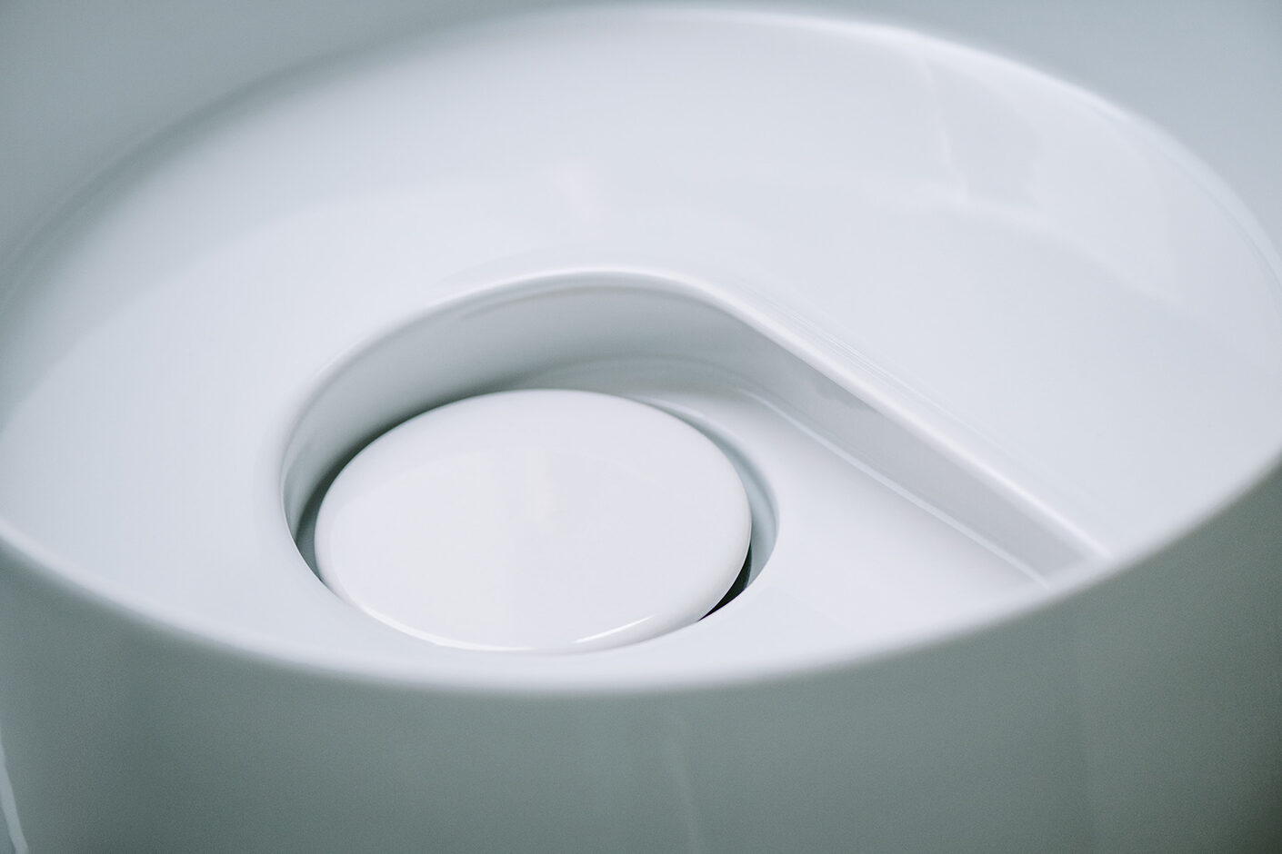 Die außergewöhnliche Form des Beckens entstand aus einer intensiven Auseinandersetzung mit Bewegung und Rhythmus: Die sanft geneigten Innenflächen des runden Waschtisches erzeugen einen sanften Strudel – einen Vortex –, der das Wasser länger erlebbar hält und somit das Bewusstsein für einen nachhaltigen Umgang mit der kostbaren Ressource fördert. Zugleich erleichtert die gelenkte Bewegung des Wassers durch das Becken dessen Reinigung. Der Ablauf im Zentrum ist von oben zugänglich und bietet somit unterhalb zusätzlichen Raum, denn dank der großen Öffnung ist ein klassischer Siphon nicht unbedingt erforderlich. Um die minimalistische Ästhetik vollumfänglich in Szene zu setzen, kann der Wasserfluss zudem auch aus einer Öffnung am oberen Ende der Rampe geleitet werden.