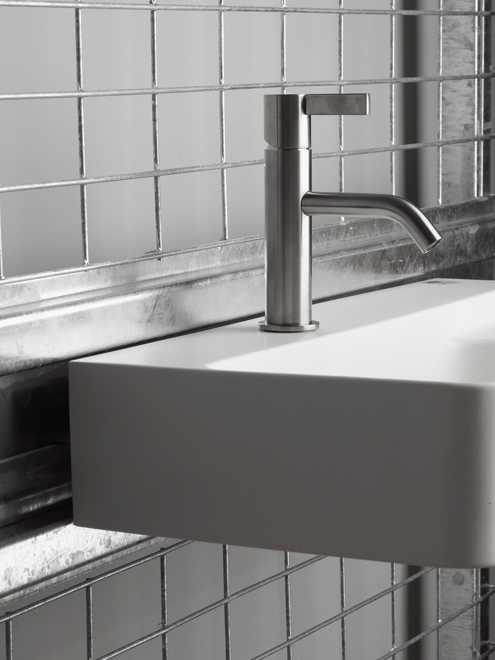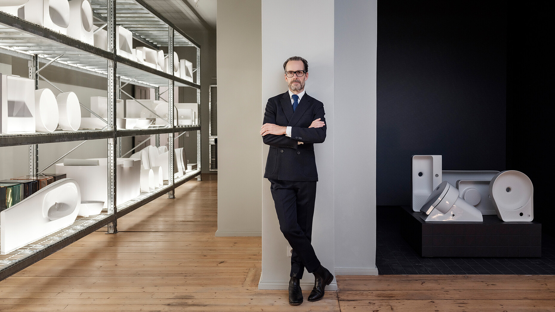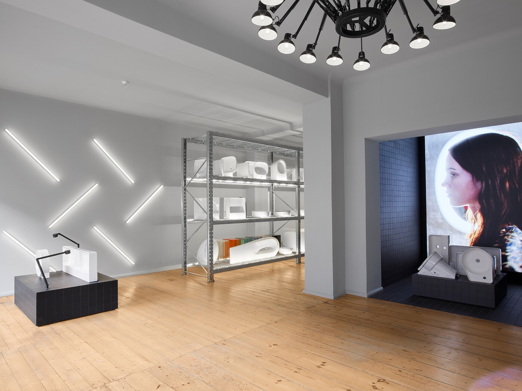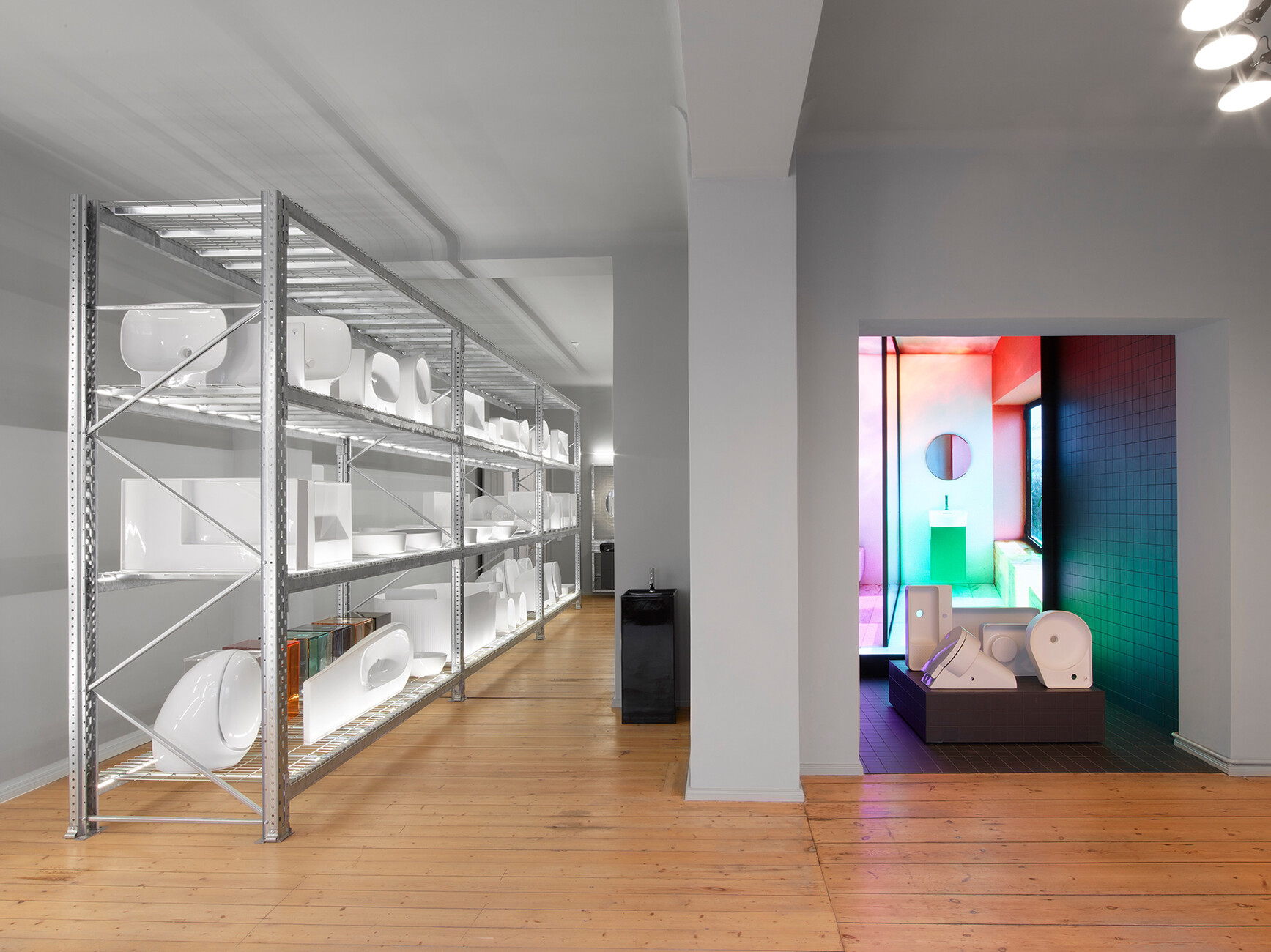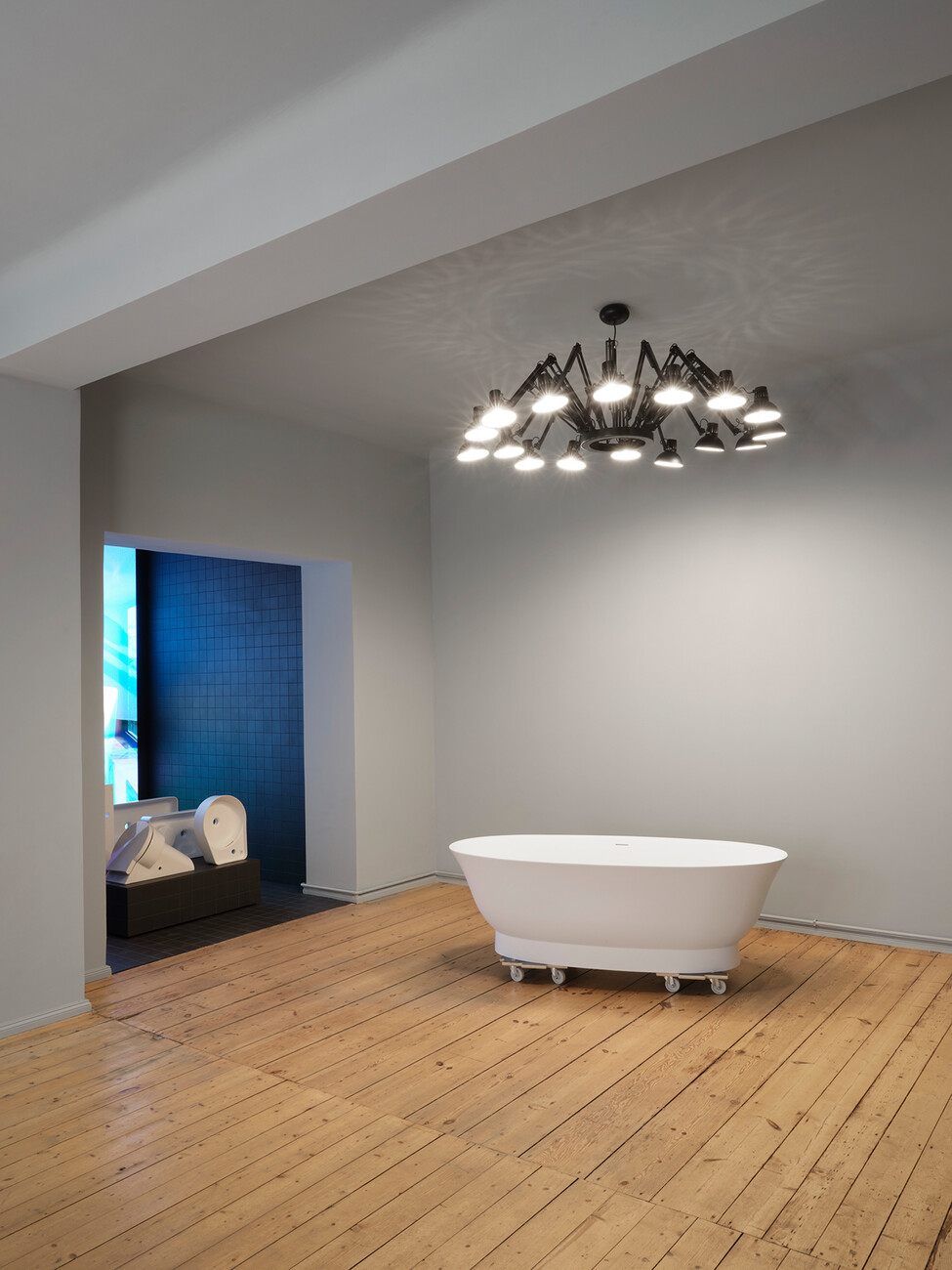 Den Abschluss bildet eine gitterförmige Metallkonstruktion, die als analoge Probe-Hängefläche für alle in Berlin archivierten Laufen-Editionen dient. Die Montagewand sei im Grunde wie eine kleine Werkstatt, meint der Designer, der 2015 mit "VAL" eine der umfangreichsten Gesamtbad-Kollektionen für Laufen entwickelt hat. Waschtische und WCs können auf diese Weise beliebig kombiniert und in der geplanten Anwendung simuliert werden, was Architekten und Innenarchitekten neue Möglichkeiten zur Bemusterung bietet. Darüber hinaus lassen sich ebenfalls die Armaturenkollektionen durch einfaches Ein- und Ausstecken in ihrer Farbigkeit, Oberfläche und ihrem Design zusammenstellen und vergleichen. Arbeitsraum, Schauraum, interaktive Plattform, Treffpunkt und Archiv: Die Kantstraße 29 ist für den Schweizer Badhersteller eine Adresse voller Aktivitäten. "Uns ging es um Dialog, nicht um Repräsentation", betont Grcic und erklärt damit seine Idee für die Szenografie. "Es sind Bilder, die sich zusammensetzen, Atmosphäre, Architektur, Stimmungen, Licht und Farbe, Künstlichkeit. Die Bilder sind gar nicht so konkret und müssen nicht in jedem Detail exakt sein, sondern sind oft nur Andeutungen."