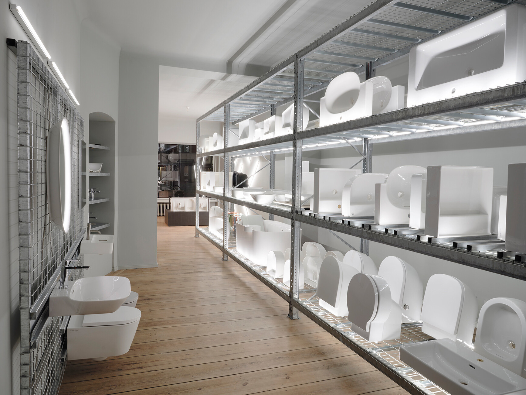 "Wir wollten unbedingt, dass der Raum ein zeitgenössischer Ort für Laufen ist, ein Ort für Kultur, für eine Öffentlichkeit", erzählt Grcic. Inspiriert hatte den Industriedesigner, der 2018 mit seinem Studio von München nach Berlin umgezogen ist, selbst aber bereits zehn Jahre in der Hauptstadt wohnt, einerseits der Standort: "die Kantstraße als lebendige Straße mit all ihren Geschäften für Möbel, Design, Antiquitäten und Restaurants". Andererseits sei auch der Charme des Ladens mit seiner herausfordernden L-förmigen Fläche bestimmend für die Gestaltung gewesen. Der verwinkelte Grundriss bewirke eine gewisse Persönlichkeit, sagt er. Konstantin Grcic gliedert den Raum in drei Zonen: Präsentation, Display und Archiv. Der vordere Ladenbereich fungiert als freie Fläche, die für ein wechselndes Programm aus Veranstaltungen und temporären Installationen flexibel bespielbar sein soll. Im anschließenden kleineren Raum dahinter leuchtet eine LED-Wand, die auch durch die beiden Schaufenster sichtbar ist. Als multimediales Display genutzt lassen sich so Gäste per Video live nach Berlin schalten: eine digitale Bühne. Der tiefe Raum im hinteren Bereich, ergänzt den Laufen space als kuratiertes Produktarchiv. Mitten in dem langen Durchgangsraum steht ein drei Meter hohes Industrieregal, das mit einer beeindruckenden Länge von zwölf Metern das Berliner Zimmer dominiert. Wie eine Bibliothek öffnet sie sich zu beiden Seiten und macht die Vielfalt der verschiedenen Laufen-Kollektionen sichtbar.
