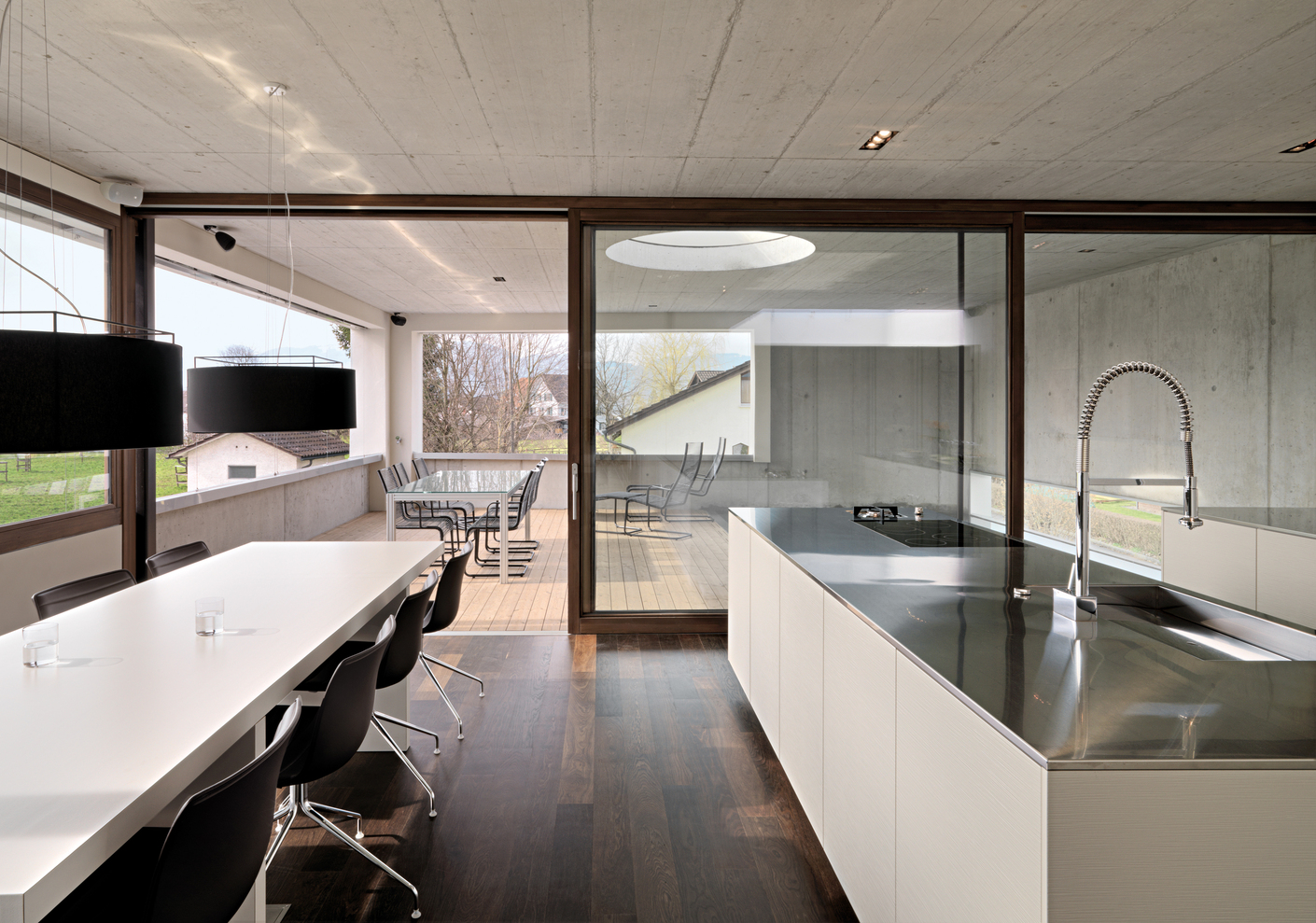 Die Inszenierung der beeindruckenden schweizerischen Berglandschaft spielt für den Architekten Martin Gepp bei seinem Entwurf für ein Wohnhaus eine zentrale Rolle: Strenge, schmale Fensterformate – mal horizontal, mal vertikal angeordnet – rahmen den Ausblick auf die Berge. Große Fensterflächen und Glasschiebetüren lassen Wohnbereich und Außenbereich samt überdachter Terrasse und Swimmingpool miteinander verschmelzen. Dabei bestimmen elegante Materialien wie roher Sichtbeton an der Decke und ein Boden aus geräucherter, geölter Eiche die zurückhaltende Architektur.