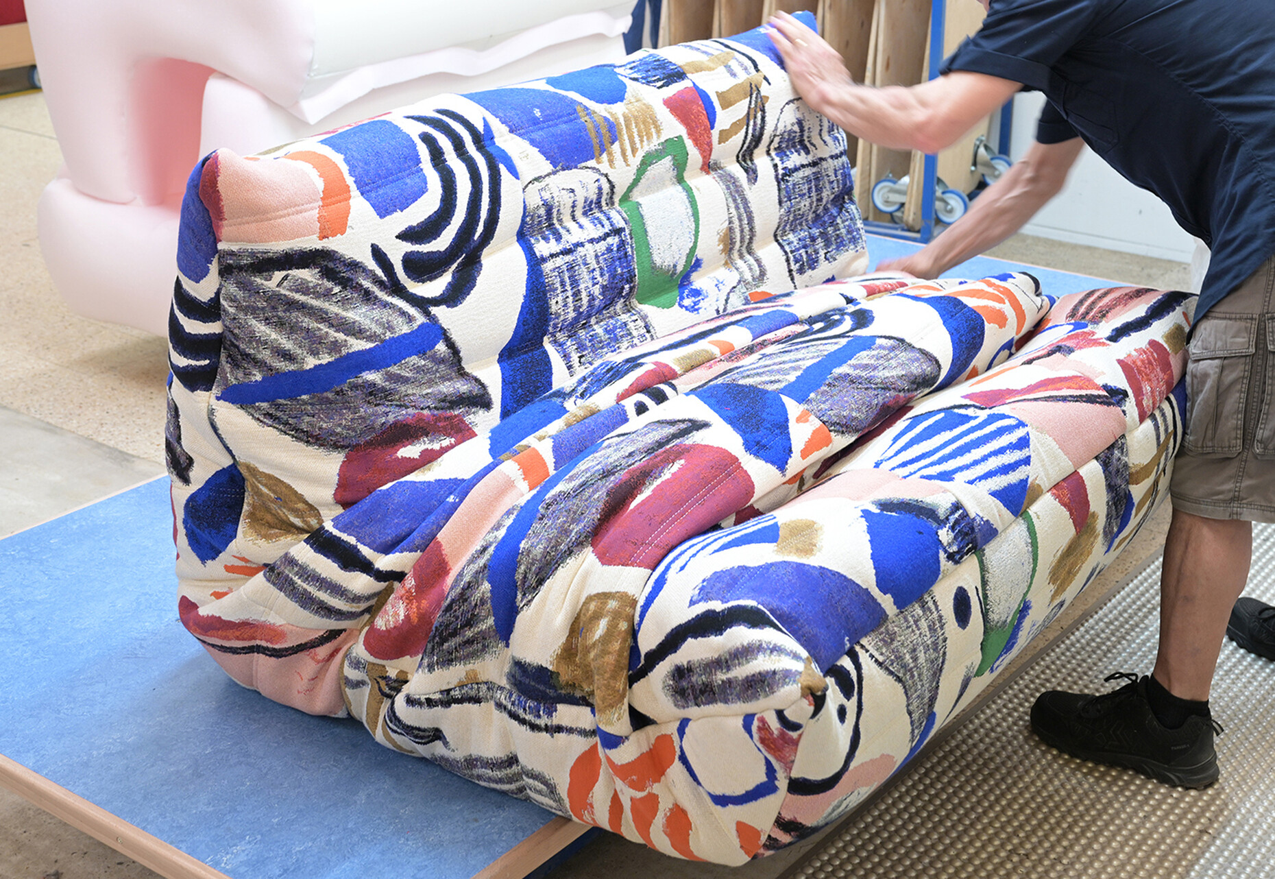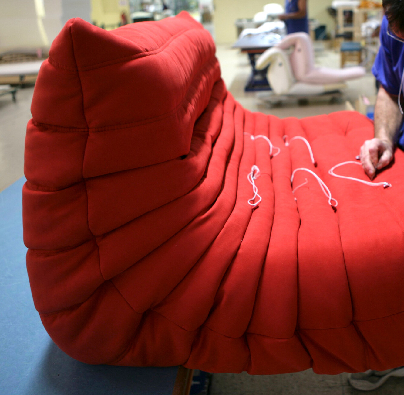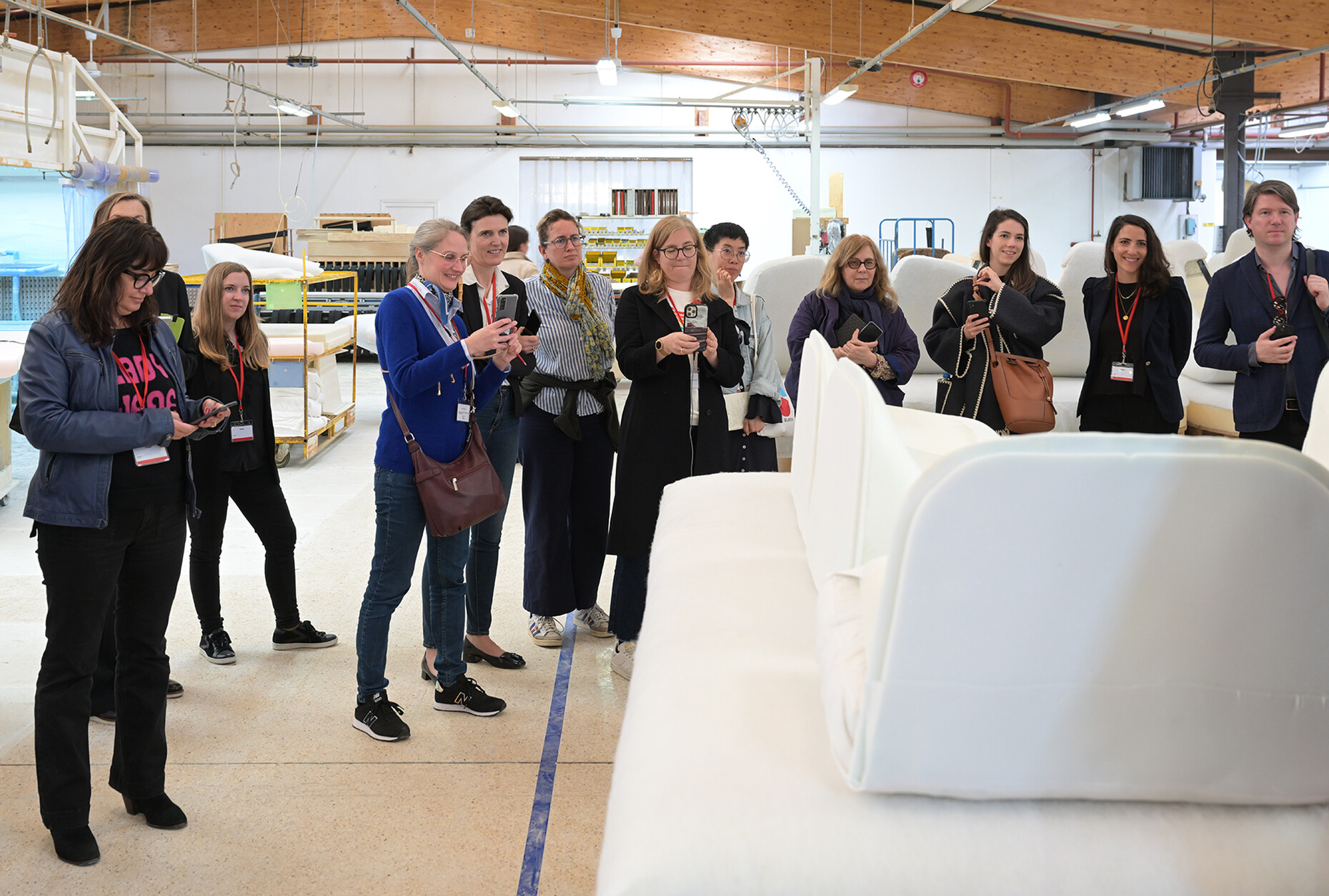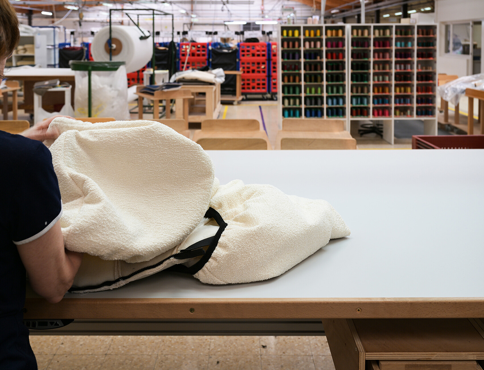 Beim Rundgang durch die weitläufigen Fabrikhallen lassen sich die vielen Details entdecken, die dazu beitragen, dass Ligne Roset für alle ihre KundInnen das beste Sitzerlebnis schaffen kann: Für die Polsterung der Sofas und Sessel wird aus 19 Sorten die jeweils passende gewählt, der Großteil der dabei anfallenden Materialreste wird parallel ganz im Sinne der Kreislaufwirtschaft recycelt. An den unzähligen Plätzen der NäherInnen werden in Handarbeit einer ballettgleichen Choreografie aus den zahlreichen Stoffen und Ledern die Möbelbezüge gefertigt. Der Zuschnitt ist dabei so optimiert, dass die Reste minimal sind. Unterstützend wirken Nähroboter, deren Ergebnisse von den MitarbeiterInnen geprüft werden. Auch in der Holzverarbeitung für den Unterbau der Möbel ist die Handarbeit und die Kontrolle der maschinell erzeugten Elemente durch die erfahrenen HandwerkerInnen ein Garant für die Qualität der finalen Produkte.