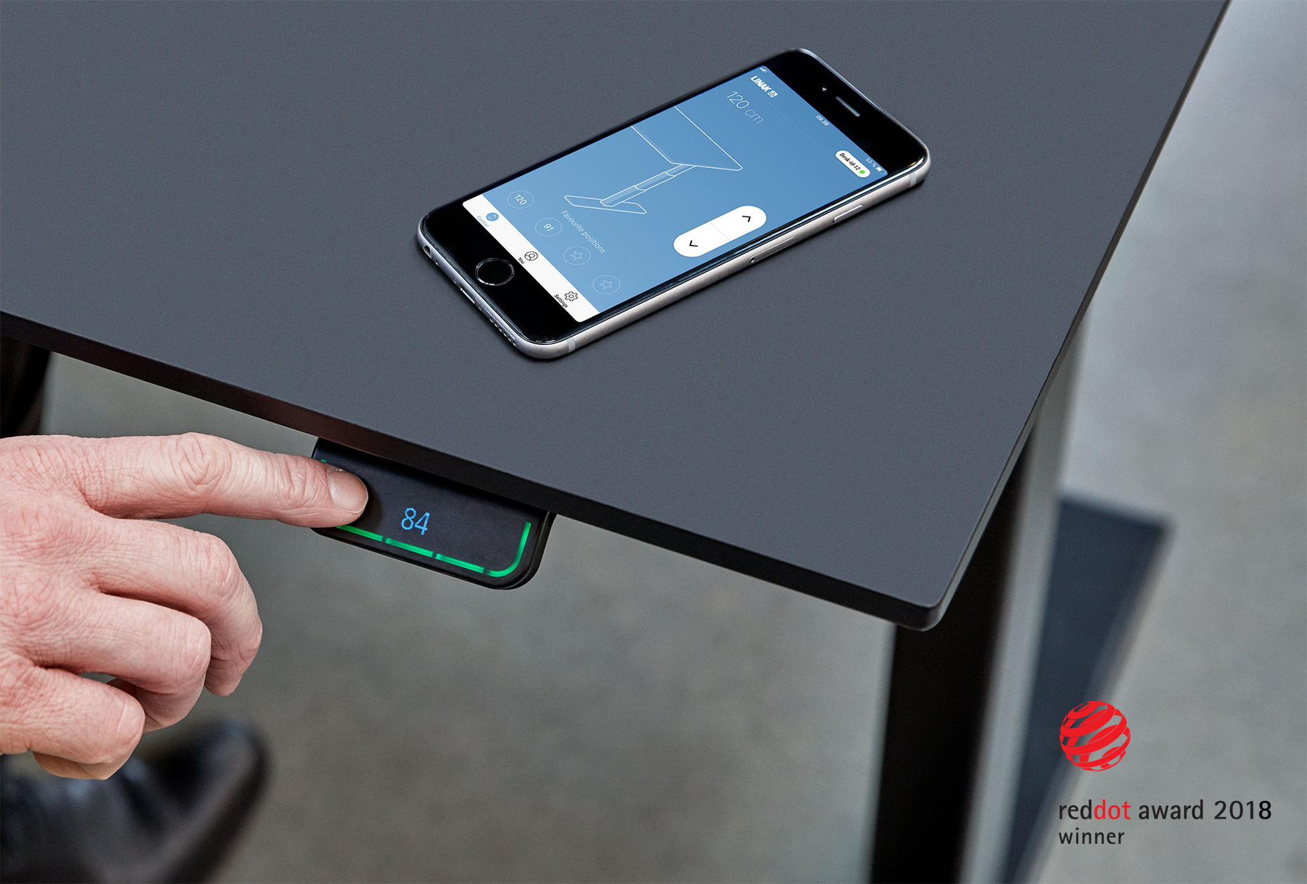 Um die Bedienung der Steh-Sitz-Tische einfacher zu gestalten, hat Linak das neue Bedienelement DPG entwickelt. Dieses lässt ein intuitives Verstellen der Tischhöhe zu. Per Kippschalter kann die Position unkompliziert verändert werden. Bis zu vier verschiedene Stellungen können gespeichert werden. Wie lange diese jeweils angewählt bleiben sollen, kann man vorab einstellen. Eine LED Leiste am Bedienelement, die nach dem Verstreichen des vorgegebenen Zeitraums orange aufleuchtet, erinnert an das Wechseln der Haltung. Über die integrierte Bluetooth-Funktion kann die Erinnerung via Desk Control App auch auf den PC oder das Mobiltelefon übertragen werden. Das flexible Arbeiten im Stehen wird somit optimal gefördert. Die Studie, die vom IGR Institut im Auftrag von Linak durchgeführt wurde, zeigt das die Verstellfunktion seitens der Büroangestellten deutlich mehr genutzt wurde: Im besonders relevanten Bereich der Verstellungen über 25 Zentimeter waren 74 Prozent mehr Sitz-Stand Aktivierungen zu verzeichnen. (am)