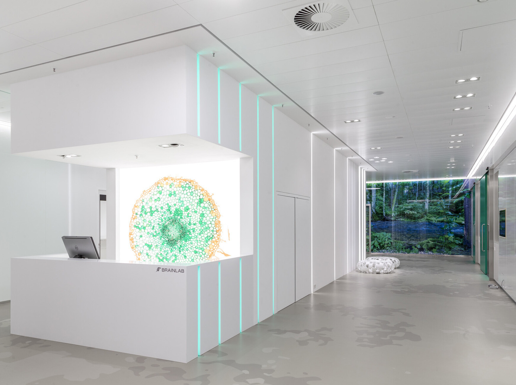 Ein gelungenes Beispiel für die Umnutzung eines denkmalgeschützten Gebäudes steht auf dem Gelände des ehemaligen Flughafens München-Riem: Der achtstöckige Kontrollturm aus dem Jahr 1939 wurde nach dem Entwurf des Architekturbüros Kadawittfeldarchitektur mit pmp Architekten saniert und um einen großzügigen Bürokomplex ergänzt. "Vom Scheitel bis zur Sohle" hat der Designer Markus Benesch anschließend den Innenausbau für das Medizintechnologieunternehmen Brainlab konzipiert. Zusammen mit dessen Gründer Stefan Vilsmeier entwickelte er kreative Ideen, um mit der Gestaltung der Funktions- und Präsentationsräume den Charakter des "Brainlab Tower Riem" als zukunftsweisendes Prestigeobjekt zu unterstreichen. Der Innenausbau erfolgte aus einer Hand – Lindner Reinraumtechnik und die Lindner AG führten vom Boden bis zur Decke den Großteil der handwerklichen und bautechnischen Arbeiten durch und lieferten die verbauten Komponenten. In der OP-Welt (Klinik), die sowohl von Brainlab zu Testzwecken als auch von Brainlab und Lindner Reinraumtechnik als Showroom genutzt wird, überraschen so den Besucher statt weiß gekachelter Wände künstlerische Installationen und hinterleuchtete Glas-Wandverkleidungen mit keramischen Drucken.