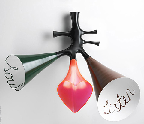Als Patrizia Moroso, die Kreativdirektorin von Moroso, in einem Magazin einen Artikel über die beiden las, wollte sie "these lovely people" sofort kennen lernen. Und, welche Fügung, noch am selben Tag traf ein wunderschöner Briefumschlag aus Indien ein. Zehn Tage später trafen sie sich in London - Patrizia Moroso und das Designerpaar Nipa Doshi und Jonathan Levien. Die Inderin und der Schotte sind auch privat ein Paar und laut Wallpaper-Magazin die Designer des Jahres 2007. Auf der Mailänder Möbelmesse umarmten die Besucher die bestickten Kissen und Polster von Doshi Levien am Stand von Moroso. Man fühlt es den Produkten förmlich an: "Creativity and love", so Jonathan Levien, "come from the same place".Also schaffen die beiden in ihren Projekten spielend den Spagat zwischen der industriellen Perfektion zeitgenössischen Designs und regionaler Maßanfertigung, verbunden mit einer großen Liebe für's Geschichtenerzählen. Die Produkte von Doshi Levien sind Gebrauchsgüter, die von lokalen Traditionen beeinflusst sind, aber universelle Ausstrahlungskraft besitzen. Sie sind allesamt unsentimental, aber nützlich, so wie ihre Kochgeschirr-Kollektion für Tefal. Nach einem Indien-Aufenthalt schlugen die beiden dem französischen Hersteller eine Reihe von Produkten vor, die praktische und ästhetische Charakteristika traditioneller Gerätschaften beibehalten, aber aus modernen Materialien bestehen, die den täglichen Umgang mit ihnen erleichtert. Das Projekt wurde ein voller Erfolg - in Europa genauso wie bei den Endverbrauchern in Indien. Auch bei ihrer Schaufenster-Installation für die medizinische Forschungsstiftung Wellcome verknüpften die beiden Bühnebild und anspruchsvolles Design phantasievoll. Wie in einem riesigen Pop-up-Buch vermitteln überlebensgroße Requisiten medizinische Errungenschaften und heilende Stoffe, die jeden angehen - bis hin zu einem Stethoskop, das selbst die Seele abhorcht. So vermitteln Doshi Levien immer wieder geschickt zwischen verschiedenen Welten und Kulturen, gerade weil sie Kreativität und Technologie einsetzen und Unterschiede hervorheben. Mit den Worten von Nipa Doshi: "Es ist nicht wichtig, wo Produkte heute hergestellt werden, sondern für wen."www.doshilevien.com