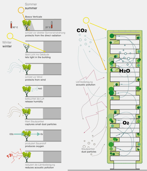 Die Bepflanzung führt zur Absorbierung von Staub und CO2, trägt zu einem angenehmen Mikroklima bei und dient zugleich als Sonnen- und Lärmschutz. Foto © Boeri Studio