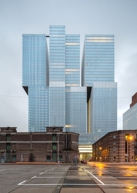 Zehn Jahre Entwicklungs- und Bauzeit: Seit November ist das mächtige “De Rotterdam” (151,3 Meter) von Rem Koolhaas (OMA) – auch ein Finalist beim Award – eröffnet. Foto © Ossip van Duivenbode