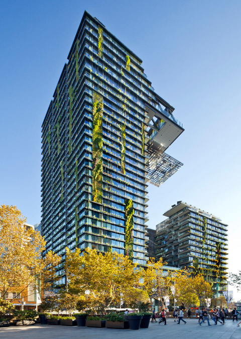 42 Sonnenreflektoren spenden Licht in schattige Bereiche: der Finalist “One central Park” (116 Meter and 64,5 Meter) in Sydney von Jean Nouvel. Foto © Simon Wood