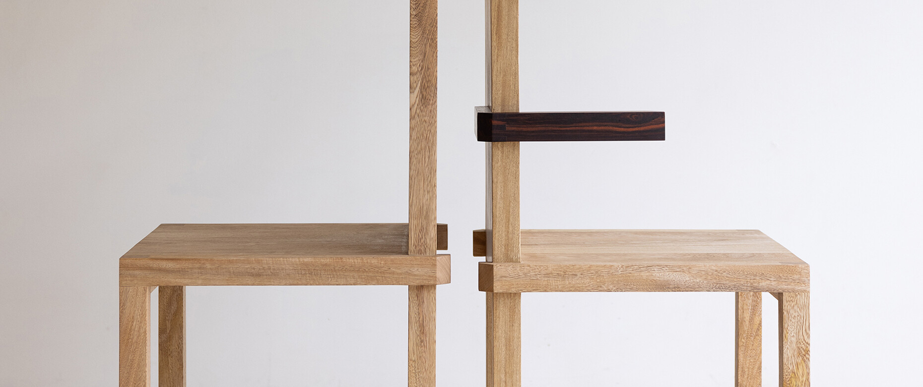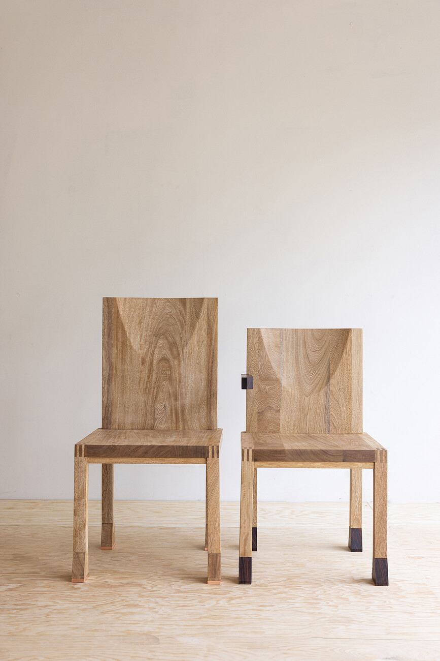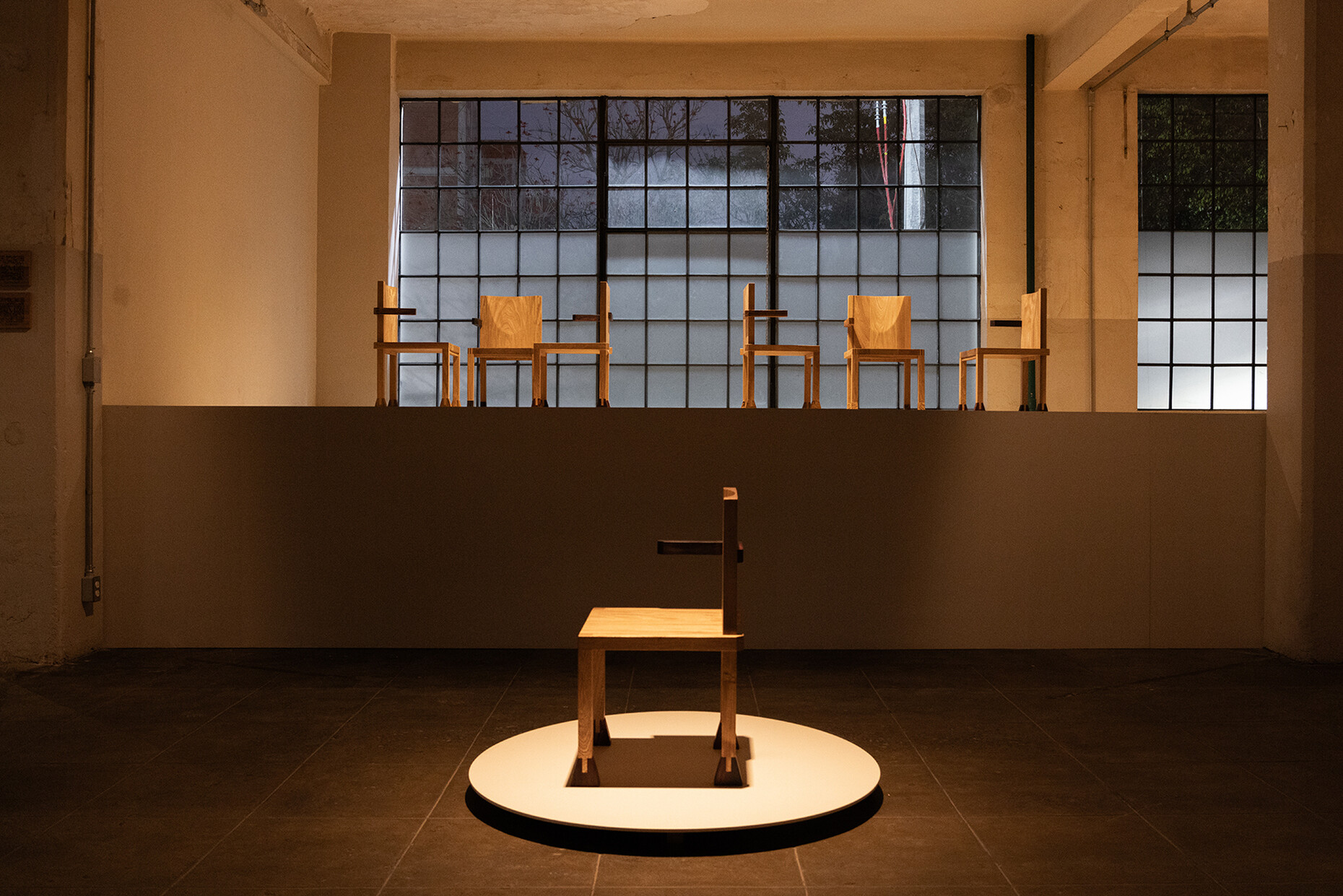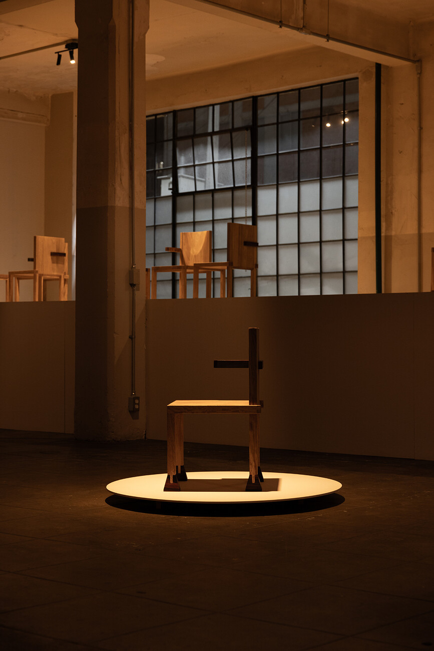 Darüber hinaus zeigt die Gestaltung der Rückenlehnen in zwei Größen eine Einkerbung in Form einer halben Ellipse. Bei der kleineren Version erstreckt sich eine einzelne Armlehne teils über die Kehrseite der Stühle. Einen feinen Kontrast in der Farbgebung bieten indes die unterschiedlichen Materialien. Zur Schau gehört auch der Stuhl "Elephant", dessen Rücken aus einem hohen Balken besteht, der sich wie ein Totem in die Höhe streckt und von einer Kupferspirale umwickelt ist. Als konzeptionelles Werk stellt dieses die gängigen Proportionen des klassischen Sitzmöbels in Frage.