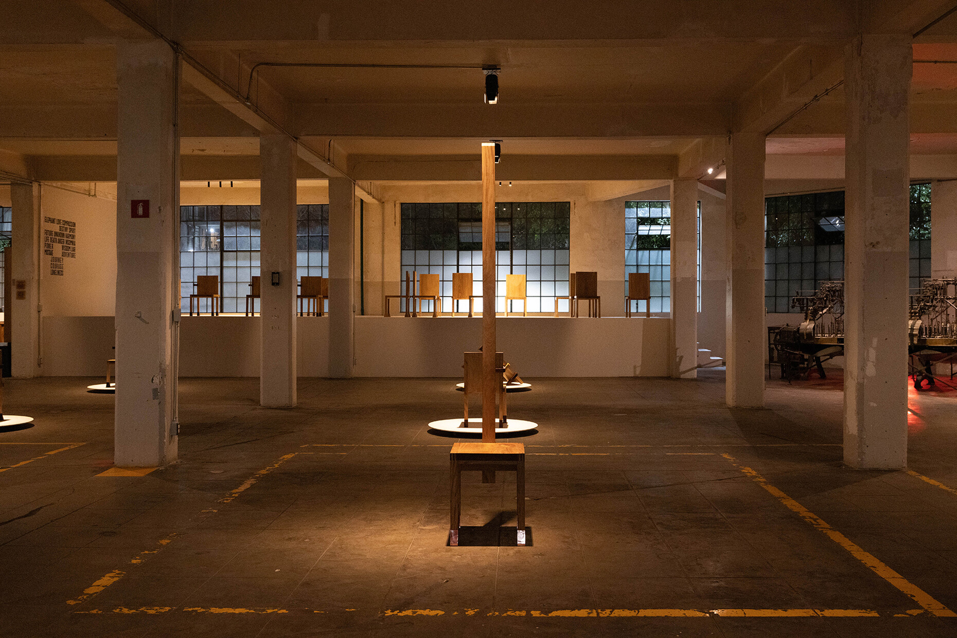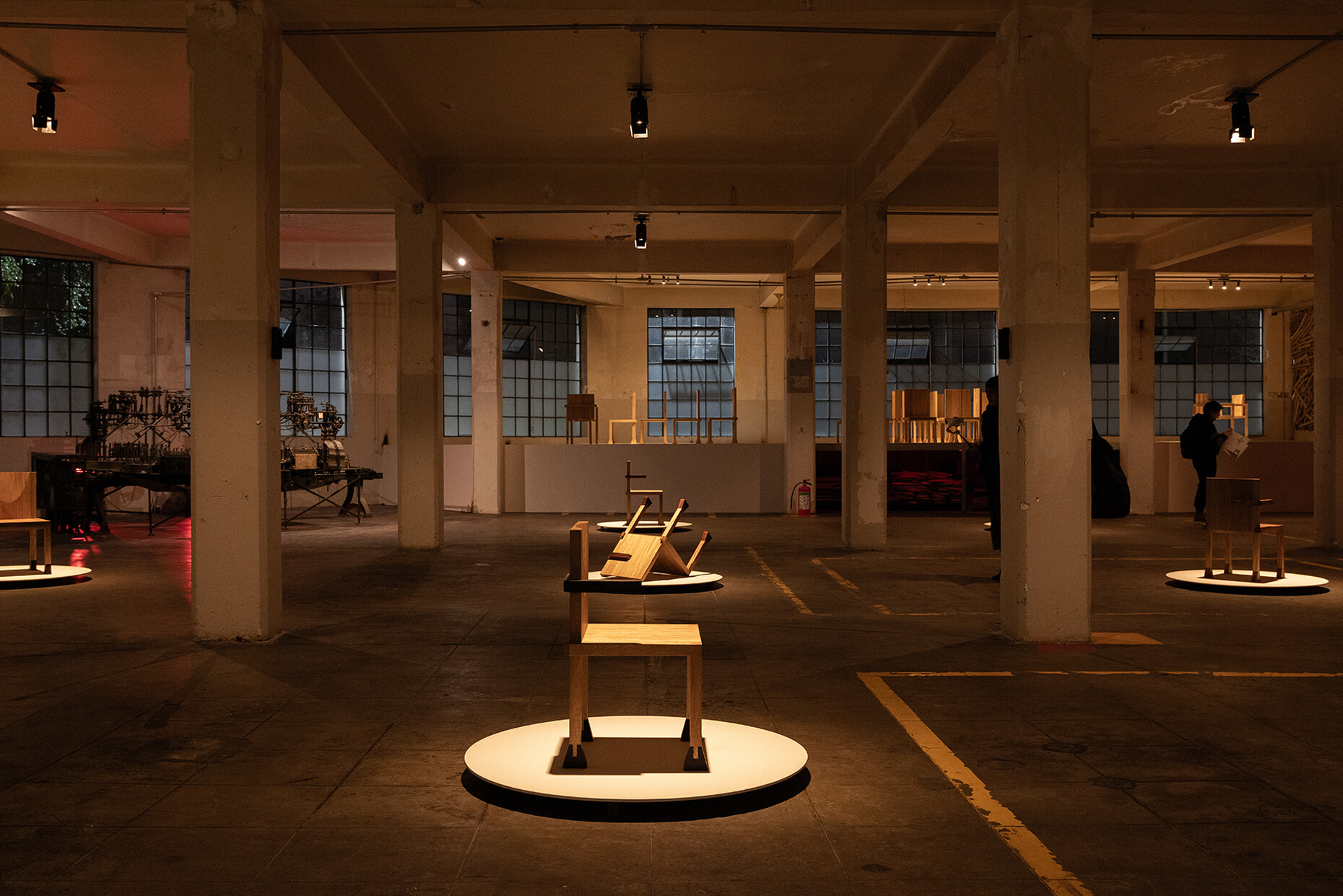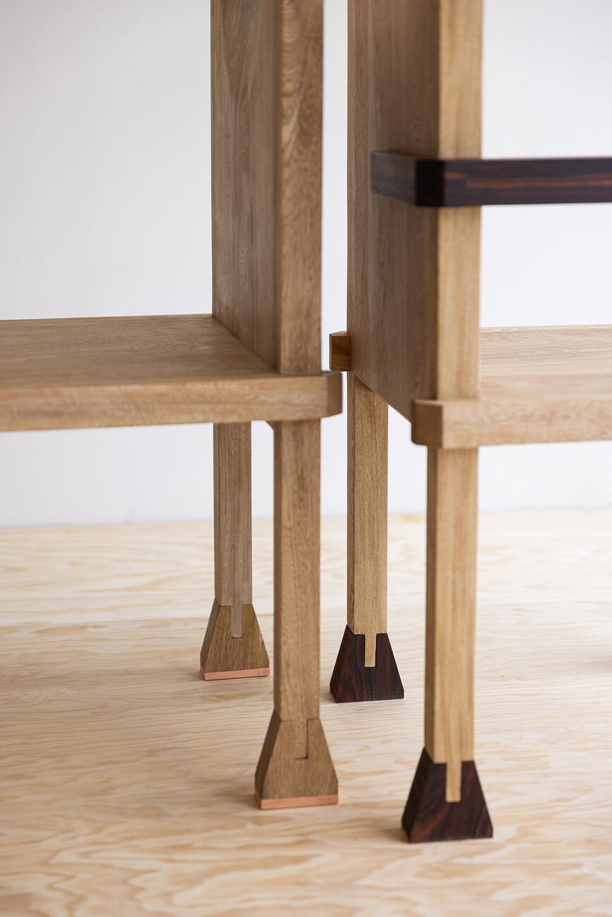 Darüber hinaus zeigt die Gestaltung der Rückenlehnen in zwei Größen eine Einkerbung in Form einer halben Ellipse. Bei der kleineren Version erstreckt sich eine einzelne Armlehne teils über die Kehrseite der Stühle. Einen feinen Kontrast in der Farbgebung bieten indes die unterschiedlichen Materialien. Zur Schau gehört auch der Stuhl "Elephant", dessen Rücken aus einem hohen Balken besteht, der sich wie ein Totem in die Höhe streckt und von einer Kupferspirale umwickelt ist. Als konzeptionelles Werk stellt dieses die gängigen Proportionen des klassischen Sitzmöbels in Frage.