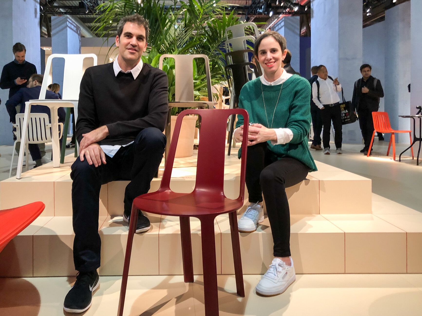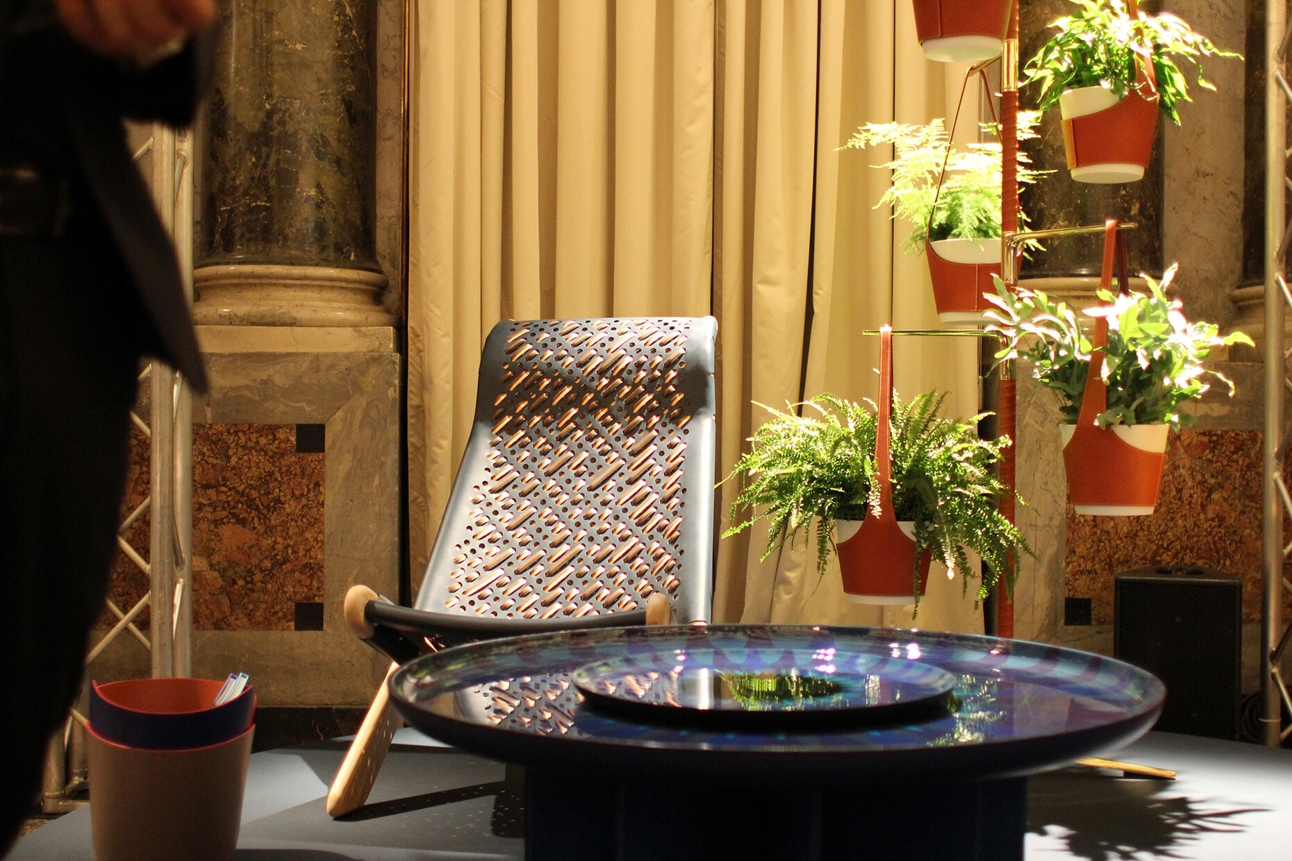 Bei Gloster auf dem Salone del Mobile präsentiert Sebastian Herkner unter anderem seinen Outdoorsessel "Fern" mit auffallend hoher Rückenlehne. Er genießt es sichtlich, ihn selbst einmal Probe zu sitzen. (mh)
