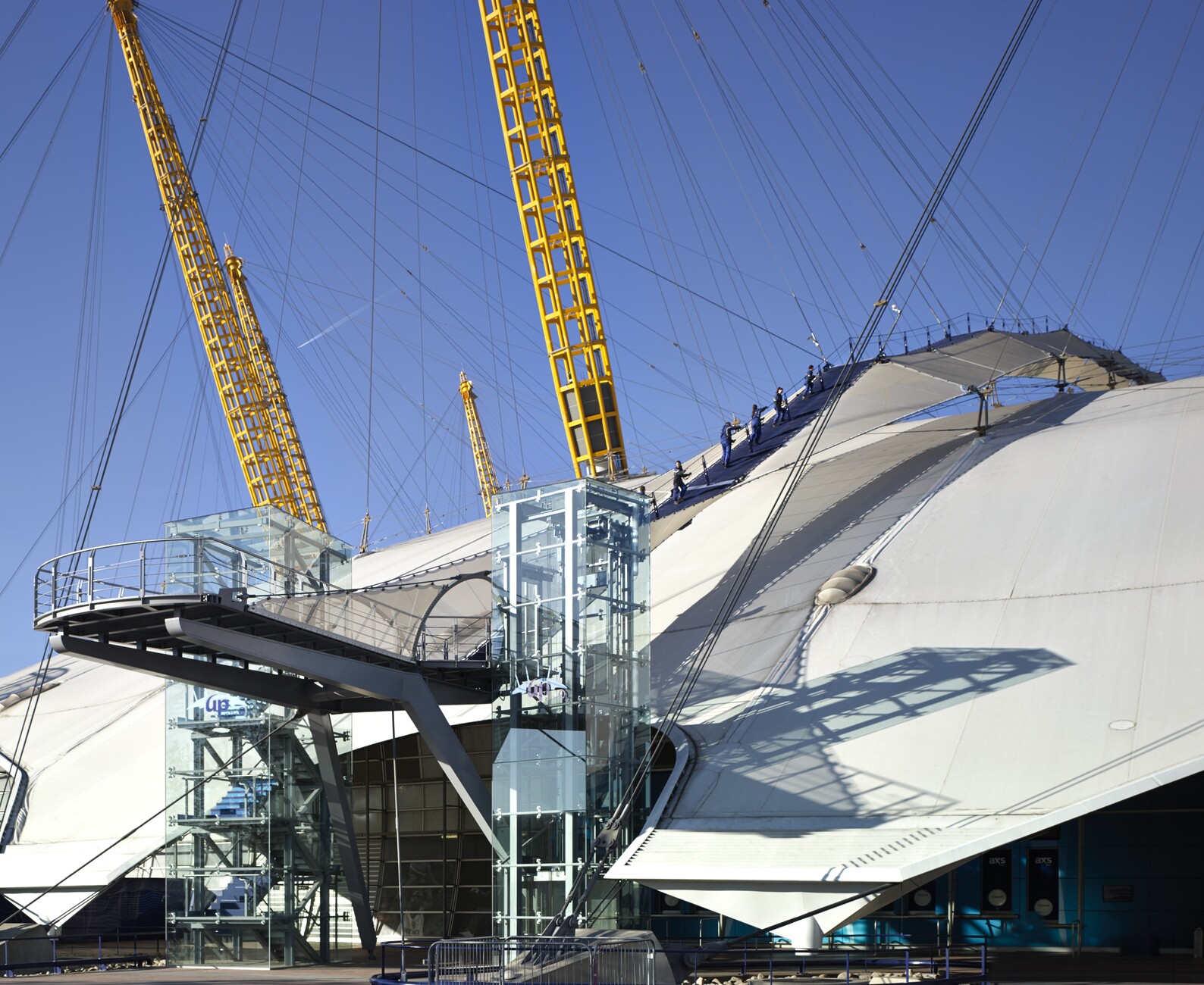 Um die Attraktivität des Dome weiter zu erhöhen beauftragten die neuen Betreiber erneut Richard Rogers und Buro Happold, einen „Roofwalk“ zu konstruieren, mit dem Besucher das gesamte Hallendach überqueren könnten. So kam das ursprüngliche Team des Millenium Dome sieben Jahre später erneut zusammen und entwickelten eine Art Brücke, die mit geringem Abstand über das bestehende Dach führt und gleichsam über diesem zu schweben scheint. Denn konstruktiv ähnelt diese an Stahlseilen abgehängte Brücke weitgehend der originalen Dachkonstruktion: die Besucher laufen über ein ähnliches Material und die zusätzlichen Lasten konnten sogar weitgehend in die bestehenden Konstruktion eingefügt werden. Über der Hallenmitte thront nun eine Aussichtsplattform und wer diese erreicht, der hat auf dem weichen, leicht schwankenden Weg dorthin tatsächlich immer wieder das Gefühl, als würde er direkt auf dem Zeltdach laufen - auch wenn der Steg an seinen feinen Seilen tatsächlich ein wenig darüber zu schweben scheint. (sp)