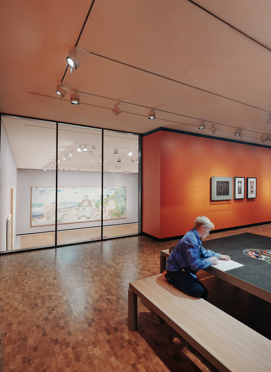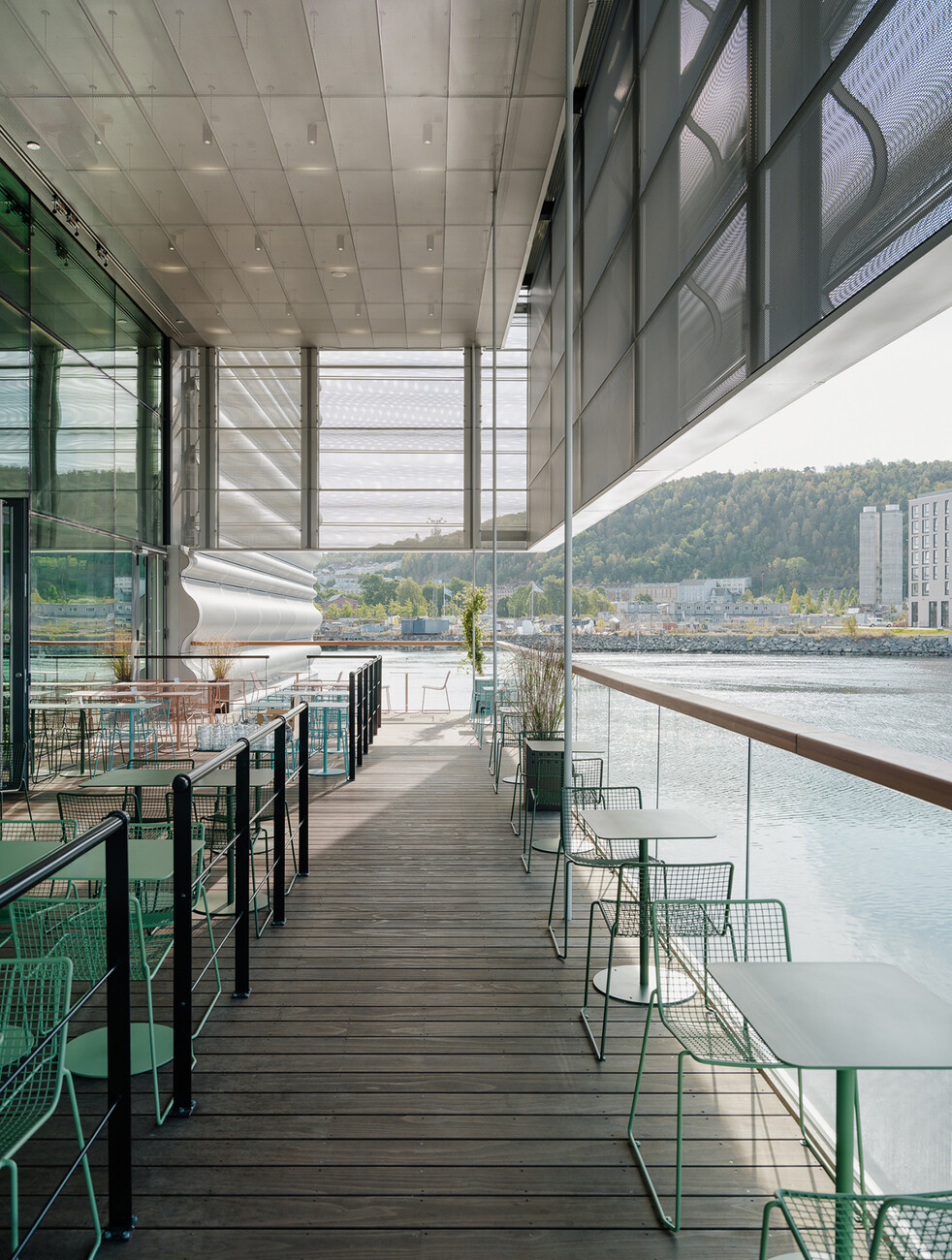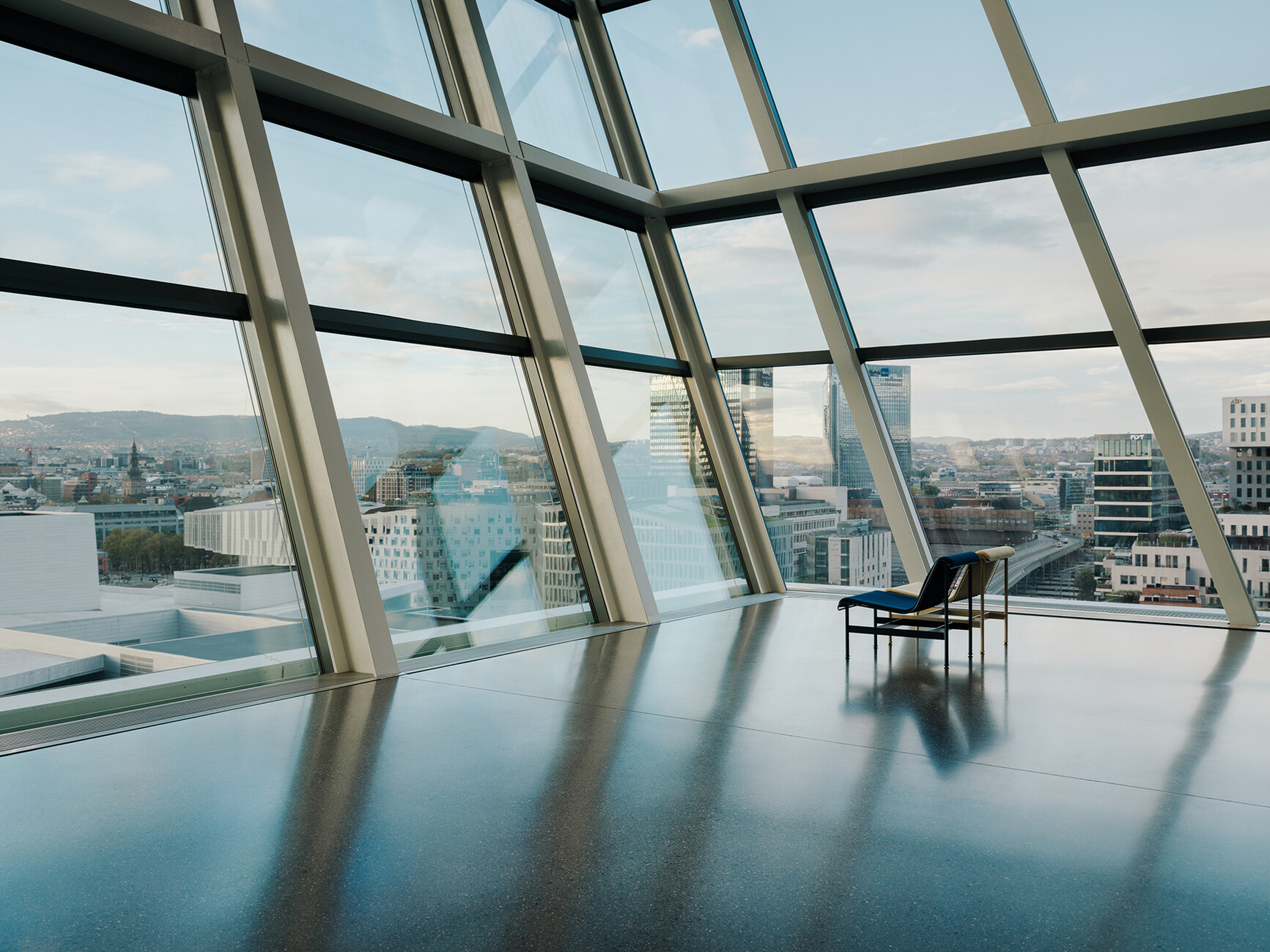 Im Inneren der Ausstellung werden den BesucherInnen keine Laufwege vorgegeben: Das Lebenswerk von Edvard Munch sowie die Gegenüberstellung mit dem Werk anderer KünstlerInnen in wechselnden Ausstellungen kann so in elf Sälen frei erkundet werden. Um inmitten der Exponate einen Moment inne halten zu können, haben die Designer Andreas Engesvik und Jonas R. Stokke gemeinsam mit Vestre eine Tisch- und Stuhlserie mit dem passenden Namen "Munch" entworfen. Die breiten Sofabänke, Loungesessel und Stühle bestehen aus einem elastischem Stahlgeflecht, das über einen robusten Stahlrahmen drapiert ist. Hinzu kommen abnehmbare Kissen aus Wollstoff. Darüber hinaus entwarf das Duo für das Museumscafé einen Cafetisch mit passendem Stuhl. Für die Farbgebung ließen sich Engesvik und Stokke von Edvard-Munch-Gemälden inspirieren und kreierten in Zusammenarbeit mit dem Farbhersteller Jotun drei Töne: "Skin", "Hair" und "Night". 4.500 Quadratmeter Fläche bietet das neue Museum nun und lässt dank seiner vertikalen Geometrie weiterhin ausreichend öffentlichen Raum auf dem Grundstück. Zudem zählt das Gebäude in Passivhausbauweise zu den Pilotprojekten des Programms "FutureBuilt", das vorsieht in den kommenden zehn Jahren 50 Architektur- und Quartierplanungsprojekte umzusetzen, die mit Blick auf die derzeitigen Standards eine um 50 Prozent bessere CO2-Bilanz aufweisen. Der Bau ist so unter anderem an eine Seewasserkühlanlage angeschlossen und bietet zwei energieeffiziente Klimazonen, die ideal auf die jeweilige Nutzung der Flächen abgestimmt sind.