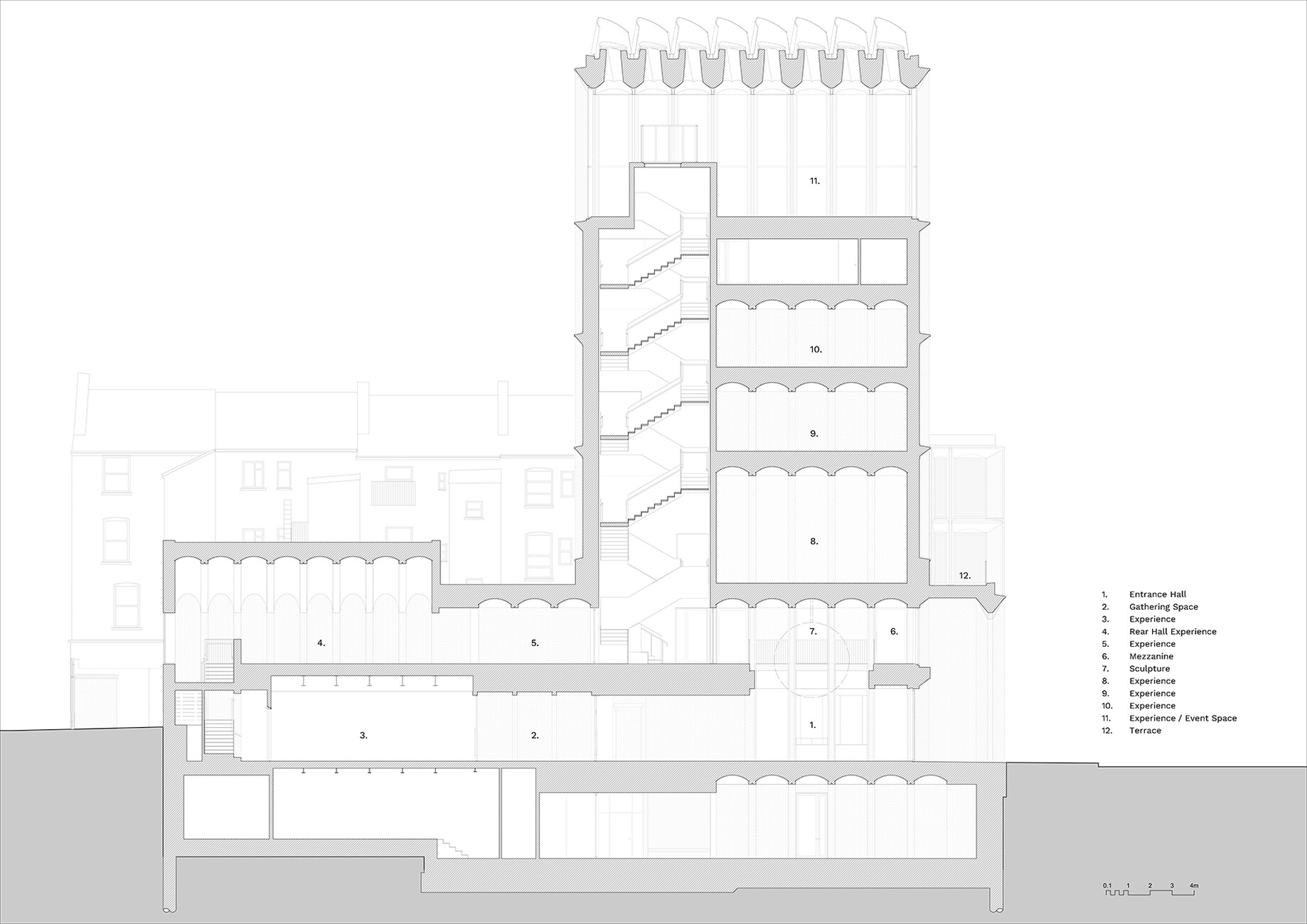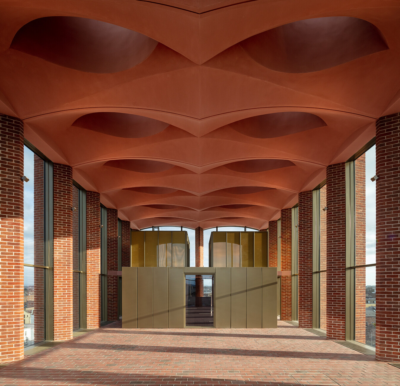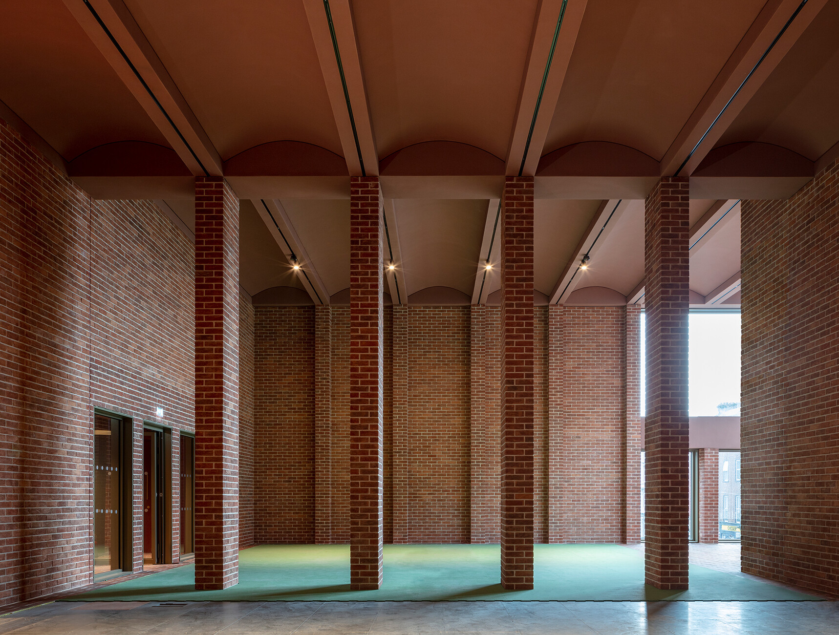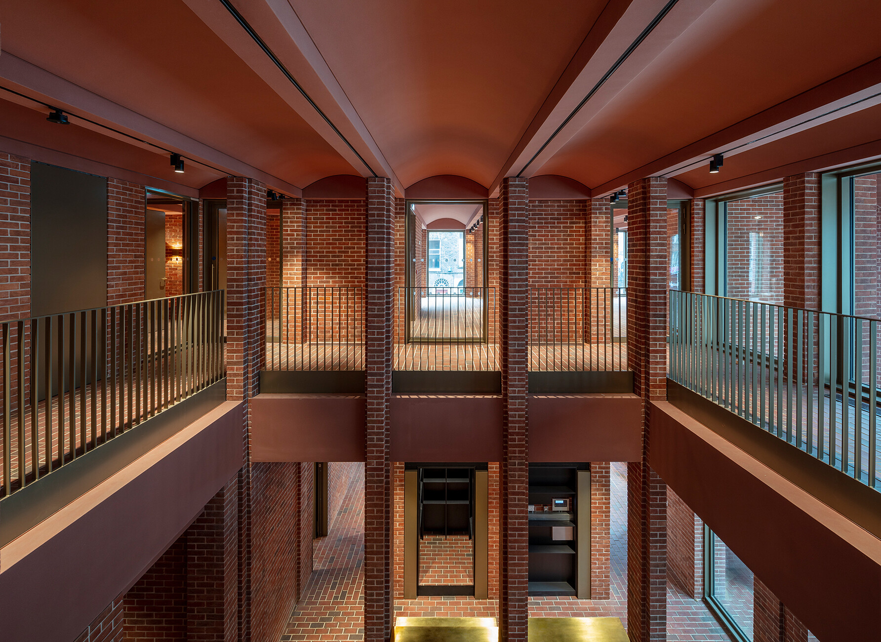 Derart erdverbunden geht es auch im Innern weiter. Níall McLaughlin sieht das Gebäude als innenräumliche Inszenierung eines Theaterstücks oder einer Erzählung. Räume wie einzelne Episoden reihen sich über die Stockwerke nach oben aneinander, dunkle Bereiche folgen helleren, immer wieder gibt es merklich inszenierte Ausblicke in den nächsten Ausstellungsbereich oder in die Straßenräume. Dabei wechseln sich die teils mit Virtual Reality bespielten Bereiche der Ausstellung mit Räumen ab, die scheinbar ganz der Backsteinästhetik des alten georgianischen Limericks frönen. Am eindrücklichsten wird das sichtbar in der Eingangshalle, der rückwärtigen und sich nach oben unter Kappendecken verjüngenden Ausstellungshalle und dem, die Dächer der Stadt überblickenden Abschluss dieser in Backstein und rotbraun-gefärbtem Sichtbeton gefassten Raumfolge. Die Konstruktion wird hier durch die Materialien geprägt, ihre prägnante Form macht den Raum an sich spürbar. Und so wird auch klar, warum dieses Haus formal mehr darf als seine Nachbarn: Seine Räume bieten der Gemeinschaft etwas an. Das piano nobile ist nicht nur Teil der Ausstellung, es kann für Hochzeiten und private Feiern genutzt werden, mit seinem Stadtbalkon kann das Haus jene Szenerie werden, vor der sich Fans und Mannschaft treffen und gegenseitig feiern. Wer hiesige Sportmuseen und sogenannte Fan-Welten kennt, kann nur neidisch nach Limerick blicken.
