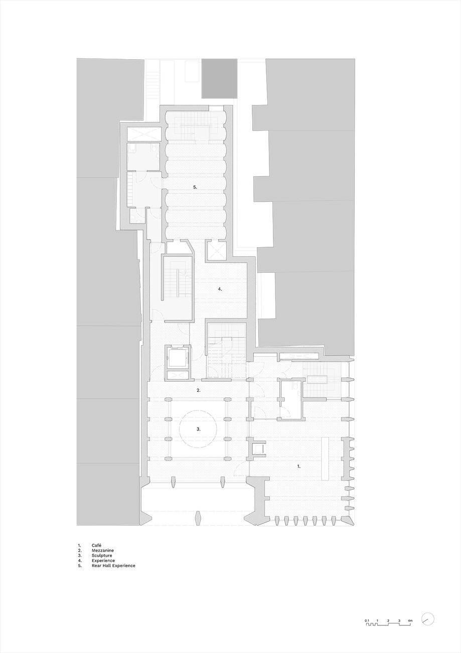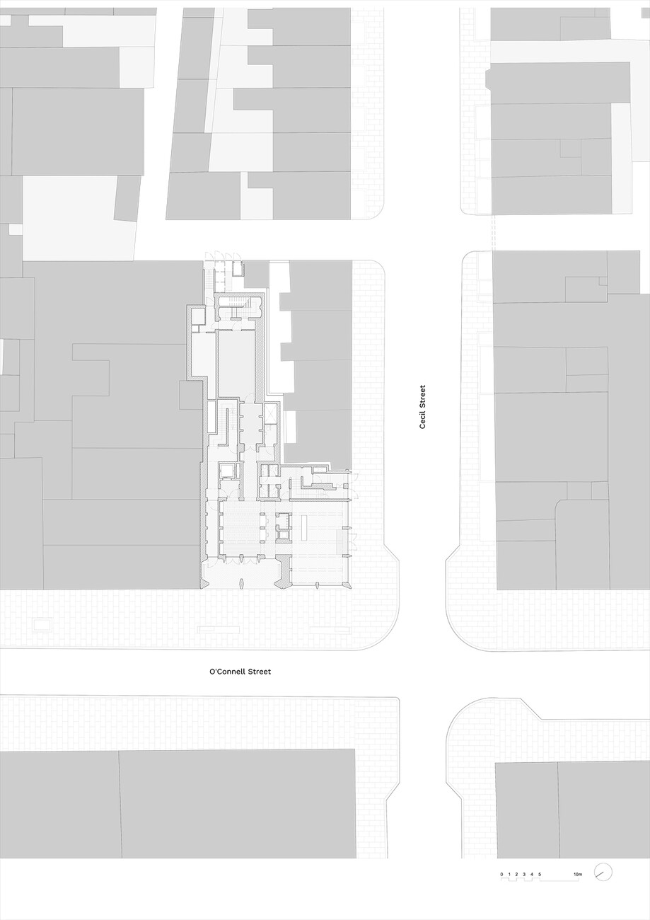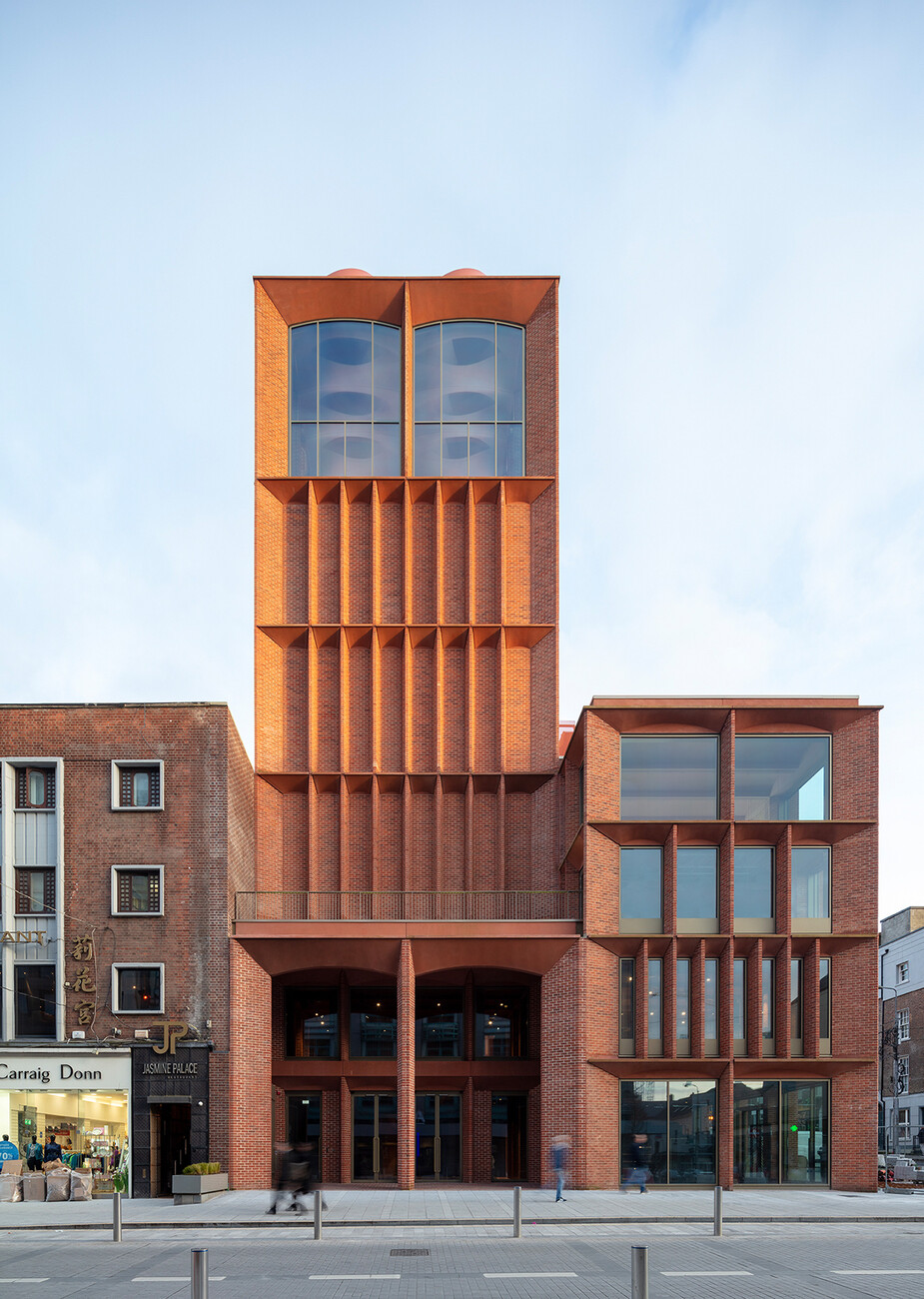 Denn in der Tat ist das Innere des Hauses nachgerade labyrinthisch. Äußerlich nimmt es die Traufhöhen der vier- bis fünfgeschossigen Nachbargebäude ebenso auf wie deren Backstein als bestimmendes Material der Stadt. Unterschiedlich breite Rücksprünge, die mal mit Fenstern geöffnet, mal mit Mauerstein verfüllt sind, werden vertikal durch sich zur Straße hin verjüngende Pfeiler und Pfeilervorlagen rhythmisiert, horizontal durch fein gesetzte Bogensegmente aus Betonfertigteilen begrenzt. Zur O’Connell Street springt die nördliche Hälfte des Baukörpers ab dem zweiten Obergeschoss zurück, sodass sich eine Art Stadtbalkon bildet – wie gemacht, um den Fans von dort gewonnene Trophäen zu präsentieren. Dahinter ragt ein Turm auf, merklich höher als die meisten der umliegenden Bauten, gekrönt von einem über zweigeschossig überhöhten und auf drei Seiten verglasten Stockwerk, das, einem piano nobile gleich, die Stadt überragt. Die Gebäudeecke schreibt die Traufkante des Blocks wiederum fort und definiert den Straßenraum dem Ort entsprechend. Recht urwüchsig türmen sich die Baumassen auf, wie die Leiber der Spielenden während eines line-outs.