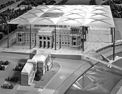 Mit dem großen Rest, mit den zahllosen nicht realisierten Projekten für Berlin beschäftigt sich jetzt eine originelle Ausstellung. Unter dem Titel „Das ungebaute Berlin" präsentiert sie genau hundert zwischen 1907 und 1997 entstandene Arbeiten, die in der Regel von renommierten Architekten aus dem In- und Ausland stammen. Carsten Krohn, Initiator und Kurator des Projektes, gelang eine spannende Auswahl, die sowohl einschlägig bekannte als auch längst vergessene Projekte umfasst. Während etwa Mies van der Rohes Hochhaus Friedrichstraße aus den frühen zwanziger Jahren - der wohl bekannteste und wirkungsmächtigste nicht realisierte Bau der Moderne - oder Albert Speers grauenerregende „Germania"-Planung mit seiner zentralen Nord-Süd-Achse von 1941 selbst dem interessierten Laienpublikum vertraut sein dürften, sind viele andere Entwürfe allenfalls noch Spezialisten präsent. Wer weiß beispielsweise noch von Hannes Meyers Planungen für die Arbeiterbank des ADGB südlich der Fischerinsel von 1929? Und wer erinnert sich an die Vorschläge von Max Bill beziehungsweise von Renzo Piano für eine Erweiterung der Neuen Nationalgalerie aus den Jahr 1981? Es sind solche Fundstücke und Wiederentdeckungen, die die Beschäftigung mit dem ungebauten Berlin ungemein lohnend machen, auch wenn man die These Krohns, dass die „Kenntnis der imaginierten, der unsichtbaren Stadt... für das Verständnis der gebauten Stadt notwendig" sei, vielleicht nicht uneingeschränkt gelten lassen will.
