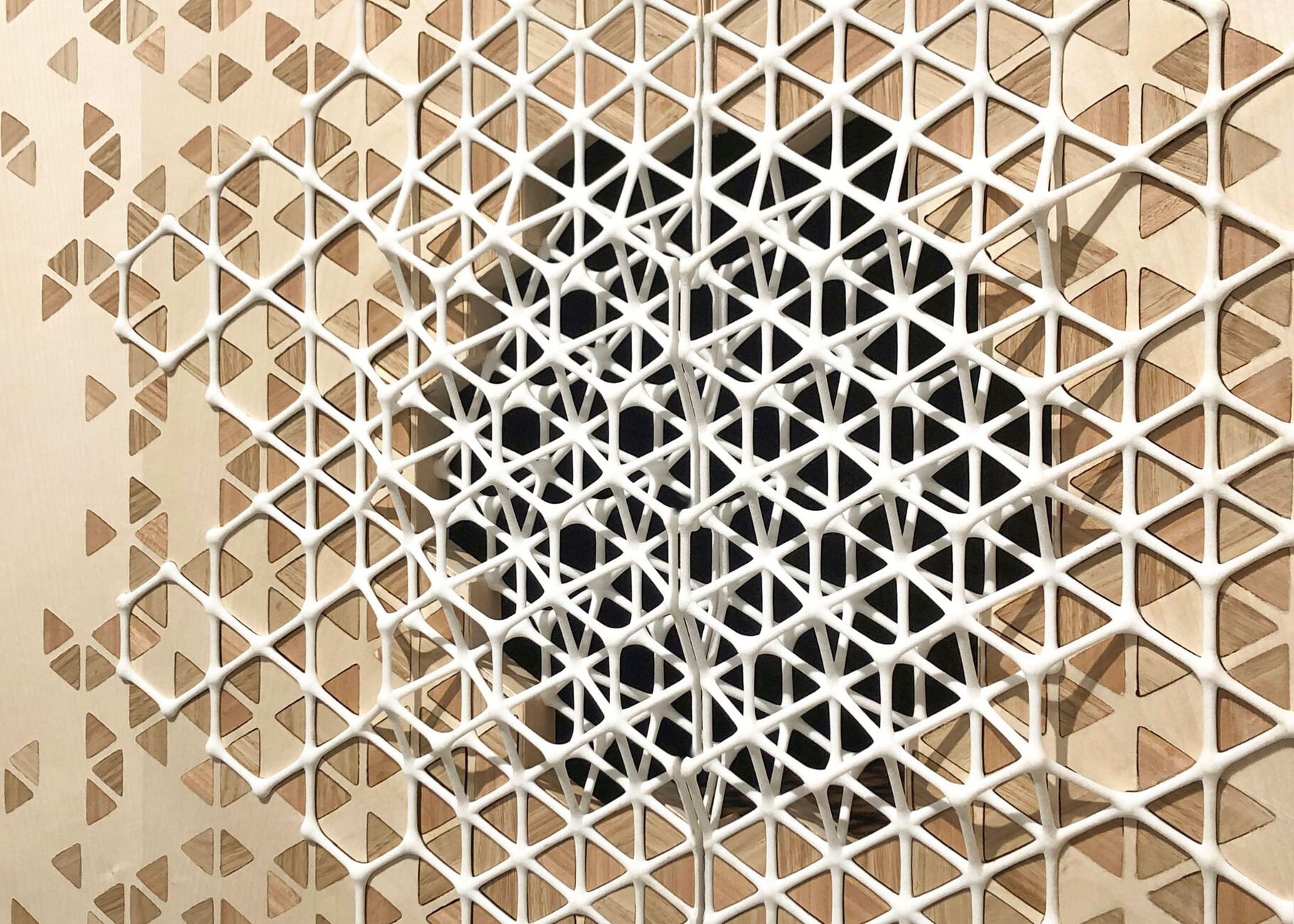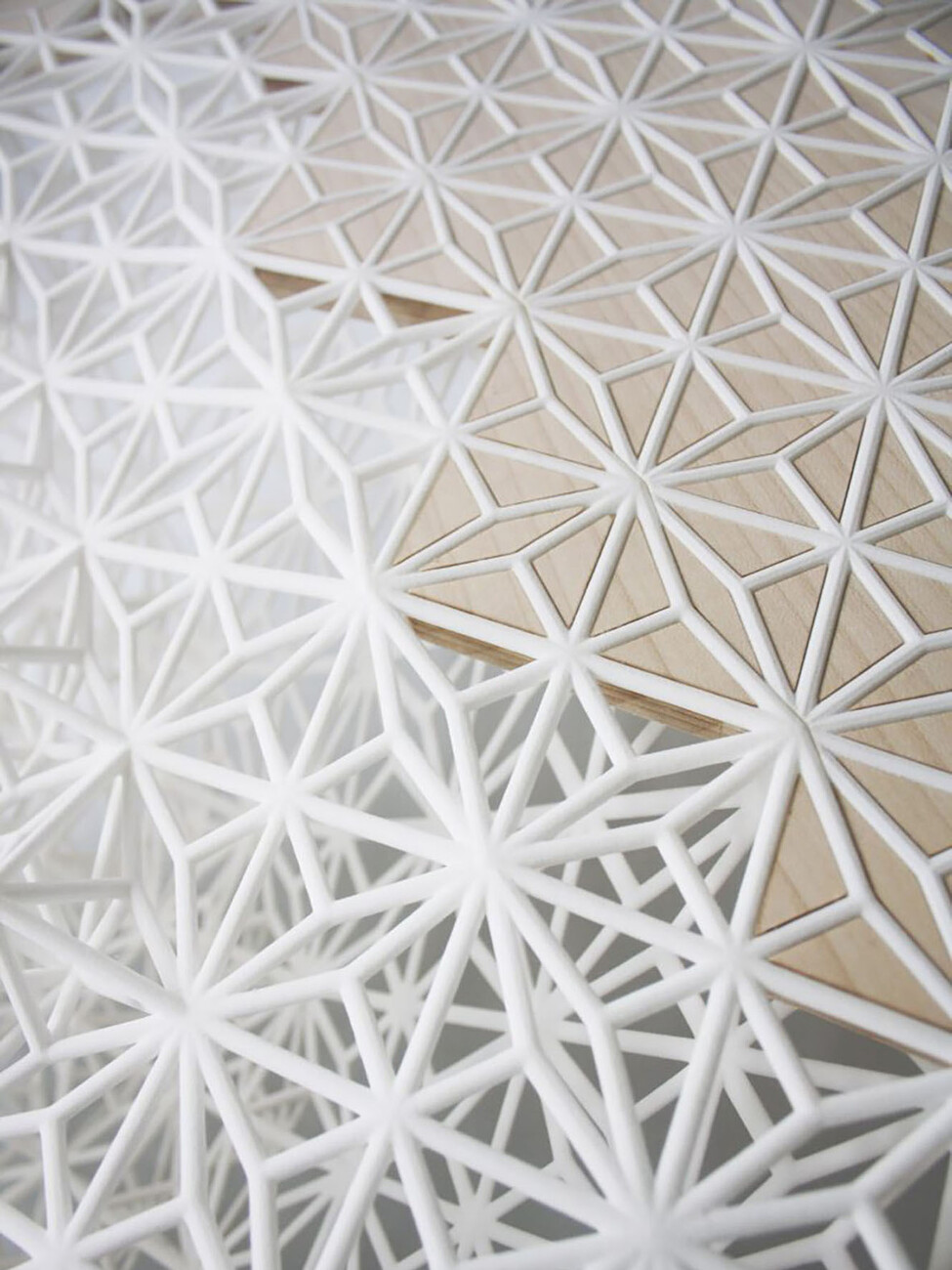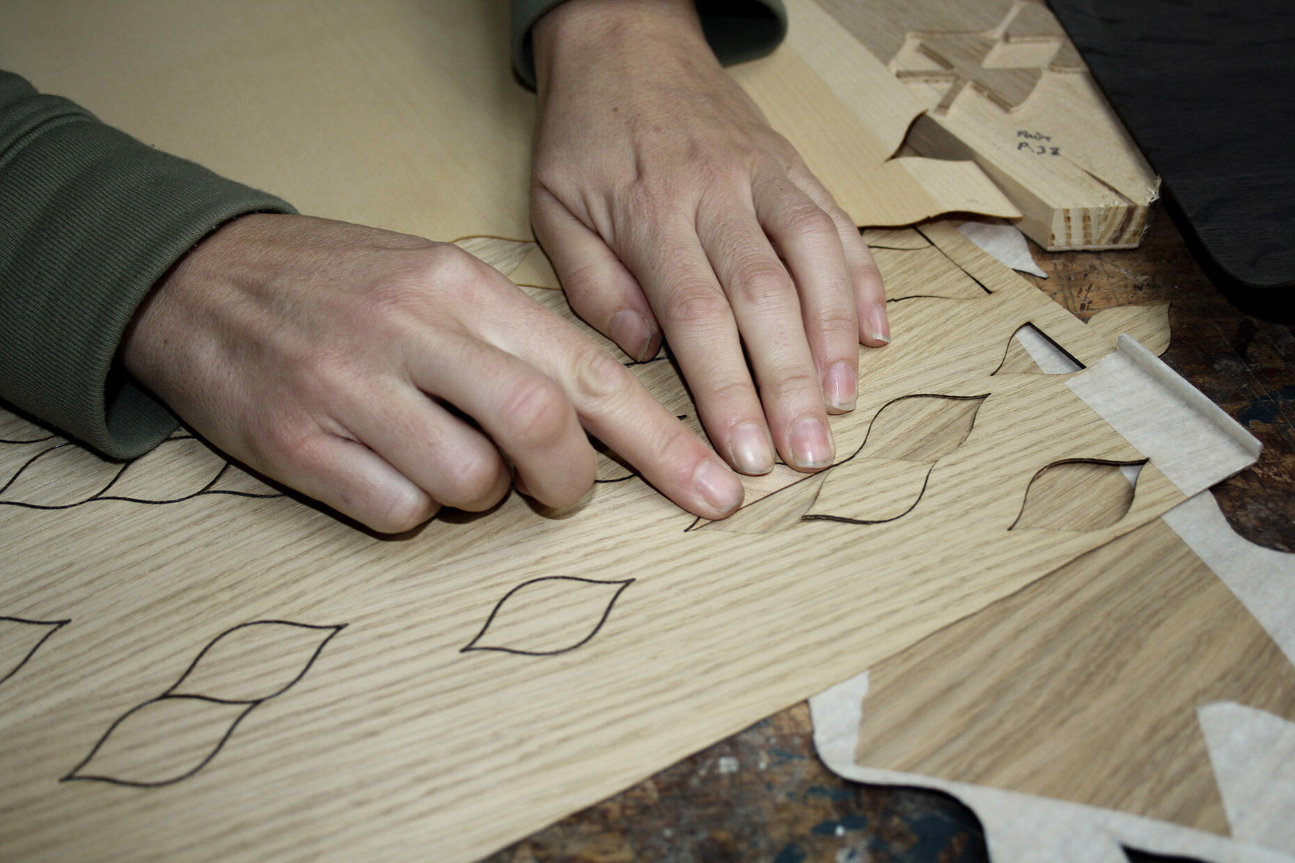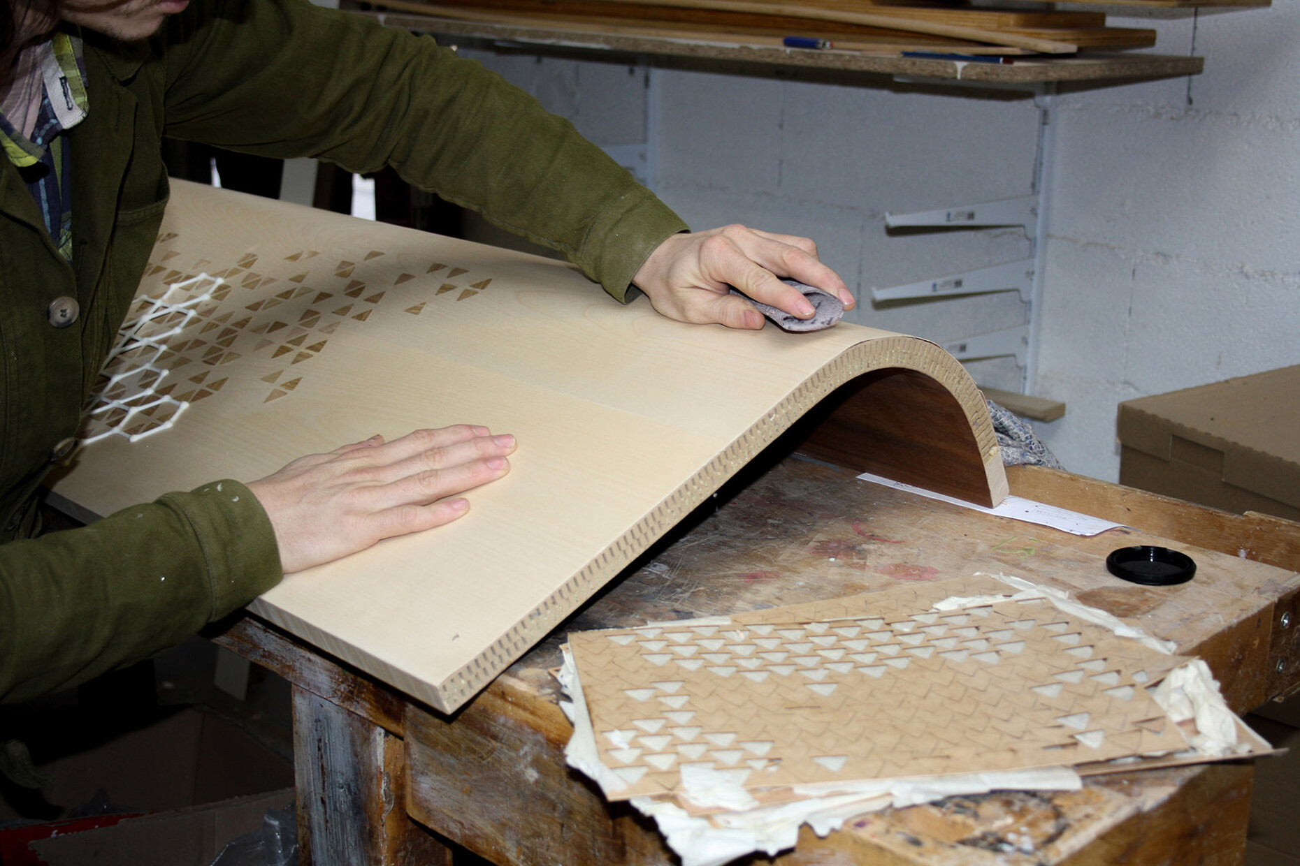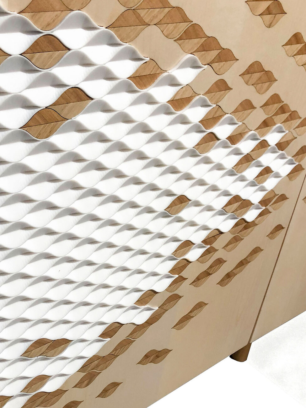 Die relativ junge Technik des 3D-Drucks wird für die traditionsreiche Handwerkskunst der Intarsien angewandt. Damit erfährt sie ein sehr zeitgenössisches Update, ohne dass das Holzmöbel auf das handwerkliche Können und die ästhetische Qualität des traditionellen Materials verzichten muss. "Die Intarsienarbeit ist eine alte Technik, aber unser Ansatz ist sehr neu", betont Raphaël. Und fügt an: "Bei den Tischlerarbeiten behalten wir Referenzen im Hinterkopf, die in der Kunstgeschichte unseres Berufsstandes verankert sind. Wir sind der Meinung, dass sie in Bereichen wie dem unseren markant bleiben müssen, auch wenn wir versuchen, durch neue Herstellungsmethoden einen Hauch von Erneuerung einzubringen." Ihr Ansatz führt die Einlegearbeiten aus der Zweidimensionalität zu dreidimensionalen Formen, erklärt Line: "Ich möchte komplexe Formen für die 3D gefertigten Intarsien entwerfen, die man anders nicht herstellen könnte. Mein Ansatz besteht also darin, verschiedene Motive zu finden, die sich weiterentwickeln. Ich möchte den allmählichen Übergang von einem Motiv inszenieren, das sich in ein Volumen verwandelt und mit dem Holz verschmilzt."