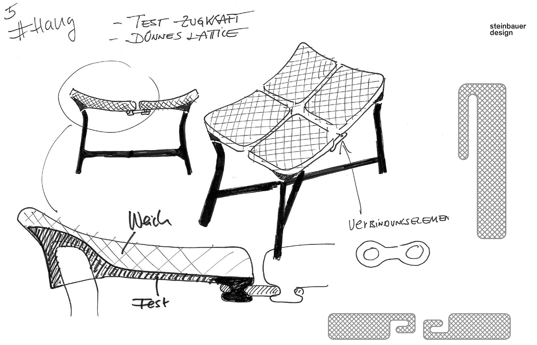 Geschlossene und offene Strukturen wechseln sich im Design des Stuhls ab. Die feinen, geometrischen Gitternetzstrukturen, aus denen sich die Sitzschale formt, sind ein Spezialgebiet von Oechsler: Die Technik verwendete das Unternehmen bereits für den Druck von Sportschuhsohlen. Als Variante für den "Lounge Chair Slope" passt sich die luftige Struktur, welche in mehreren Lagen gedruckt wird, auch ergonomisch an den Körper eines sitzenden Menschen perfekt an. Als Abschluss erhalten die Sitzkissen einen weichen Stoffbezug mit elastischen Bändern zur Fixierung an der Sitzschale. So wenig Materialien wie möglich mit einem Höchstmaß an Flexibilität in Design und Funktionalität – das war das Hauptziel bei Oechsler für den leichtgewichtigen "Lounge Chair Slope". Um die erforderlichen Teile reduzieren zu können, wurden weiche und harte Elemente in einem Bauteil kombiniert. Durch das Hinzufügen von weiteren gedruckten Bauteilen, Gestellen oder Textilen kann das Erscheinungsbild zudem je nach Bedarf problemlos verändert werden. Modular aufgebaut lässt sich auch der Transport des Stuhls platz- und ressourcenschonend realisieren.