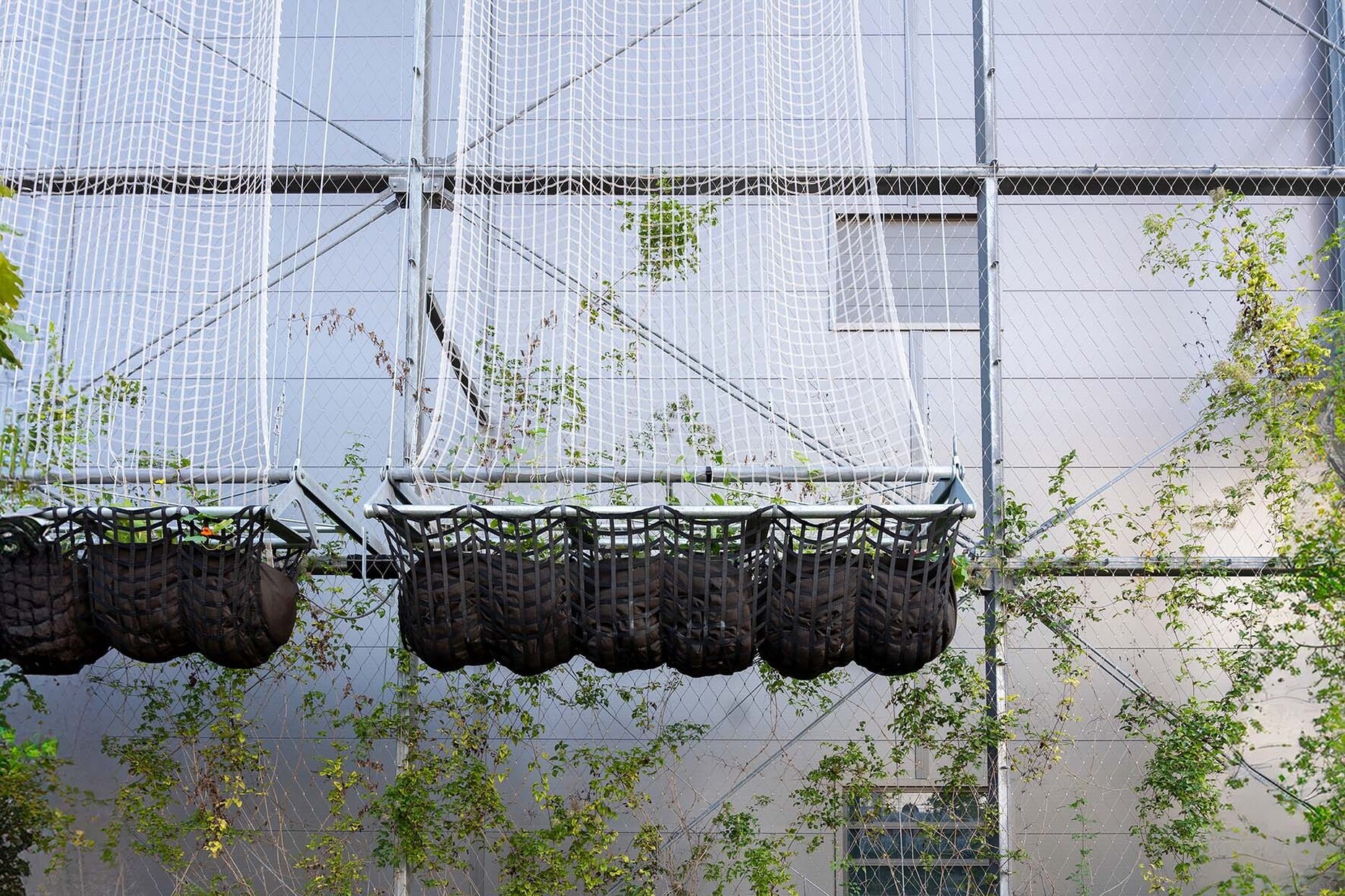 Mit "VERD° Facade" zeigen OMC°C eine Weiterentwicklung des "VERD° System": "Wir haben ein Fassadensystem entwickelt, das auf einem kinetischen Prinzip besteht, Kräfte werden durch Gegenspannung aufgenommen. Es ist ein Seilsystem, das sich parallel zur Fassade befindet, welches am Fußpunkt befestigt wird und oben an der Dachtraufe. Ansonsten berührt es die Fassade nicht und schwebt davor. Es ist meines Wissens nach das erste Fassadensystem, das ohne große Eingriffe in die Fassade funktioniert und auch sehr flexibel ist", so die Designerin und Materialexpertin Nicola Stattmann, die gemeinsam mit Carlotta Stoll das Frankfurter Office for Micro Climate Cultivation gegründet hat. Seit dem Start in 2021 zeigen sie zukunftsweisende Ideen für die Begrünung der Stadt, sei es das "VERD° System" im Hinterhof des Senckenberg Naturmuseum Frankfurt, das freistehende "VERD° Space" auf dem diesjährigen London Design Festival oder nun "VERD° Facade" zur Fassadenbegrünung. Der Clou: "VERD° Facade" ist auch für denkmalgeschützte Bestandbauten unkompliziert nutzbar, da die Fassade für die Installation nicht perforiert wird. Ungebunden und modular wird das System wie ein Segel hochgezogen und kann dementsprechend auch wieder herabgelassen werden. Der Aufbau ist materialsparend gedacht und entsprechend leichtgewichtig. Einjährige, schnellwachsende Kletterpflanzen wie die Explosionsgurke, Mondrinde, Glockenrebe oder der Malabarspinat können nun die vertikalen Flachsnetze an sechs Modulen erklimmen, die jeweils zehn Meter hoch sind. Spätestens im Frühjahr kann die Begrünung dann seine volle Pracht auf 210 Quadratmetern Fläche entfalten.