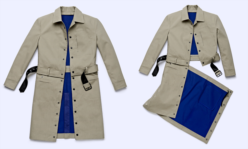 Also gibt es Jacken, Hosen und Overalls, die durch ihre kantigen, geradlinigen Formen, durch ihr stabiles Material und nicht zuletzt durch zurückhaltende Töne wie Grau, Mint und Schlammgrün in Look und Silhouette Industriearbeiter-Uniformen zitieren. Die man aber nach Belieben auf kräftige (Warn-)Farben „umschalten“ kann, denn die Stücke lassen sich alle wenden, von Schlammgrün auf Grellgelb oder von Grau auf Stahlblau. Angesagt ist Multifunktionalität: Jacken, die sich im Handumdrehen in einen Rock oder einen Schlafsack (Parkbank!) verwandeln lassen; Schuhe, die man durch ihre ölig glänzende Patina im ersten Moment bei Greenpeace-Aktivisten verortet – und die dann durch ihre schlichte Machart sowie durch den Stilmix von Desert-Boot mit Running-Schuhsohle verblüffen. All das hat Witz – und macht durchaus Sinn.