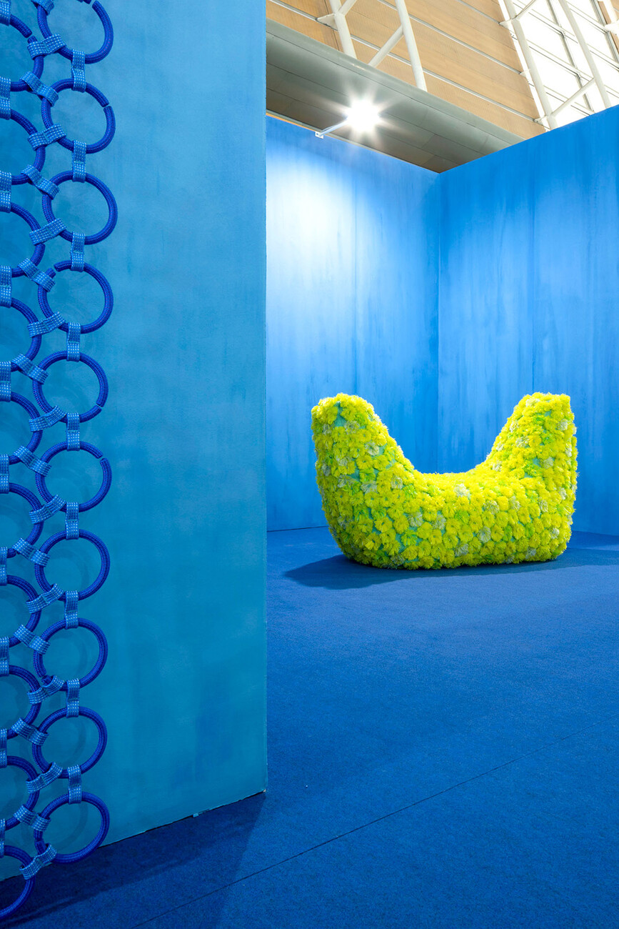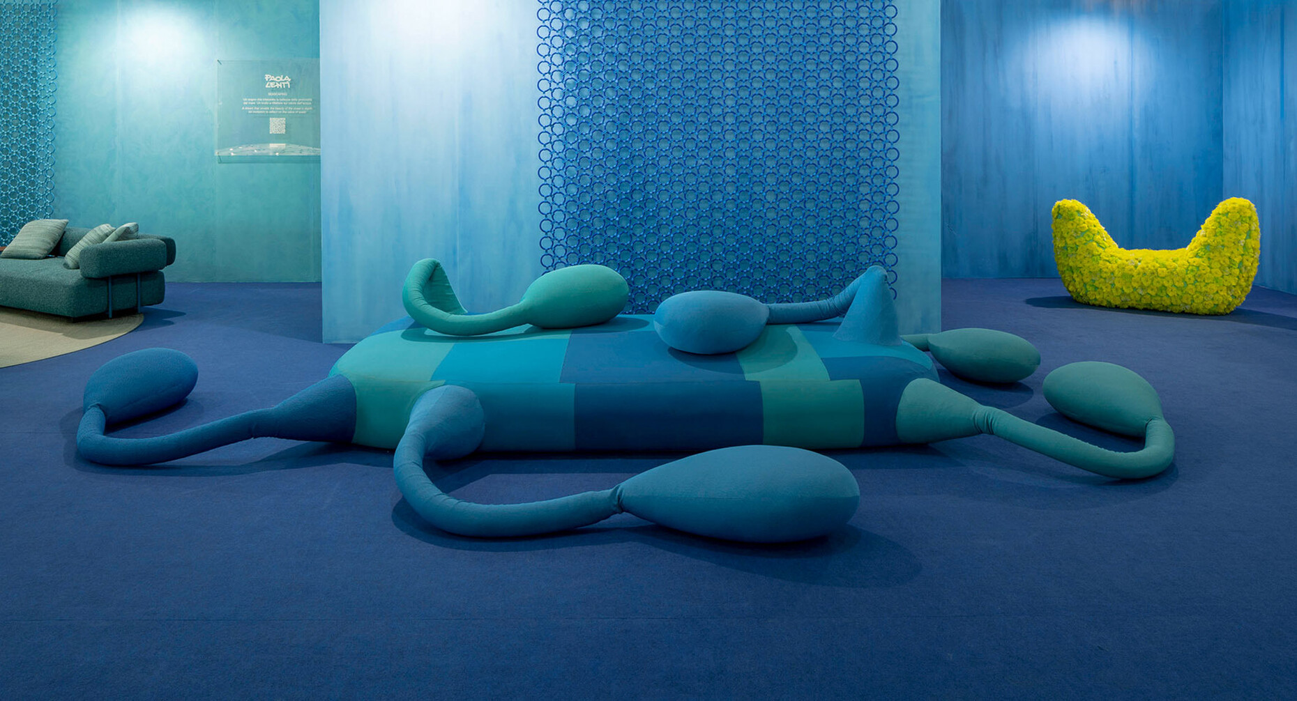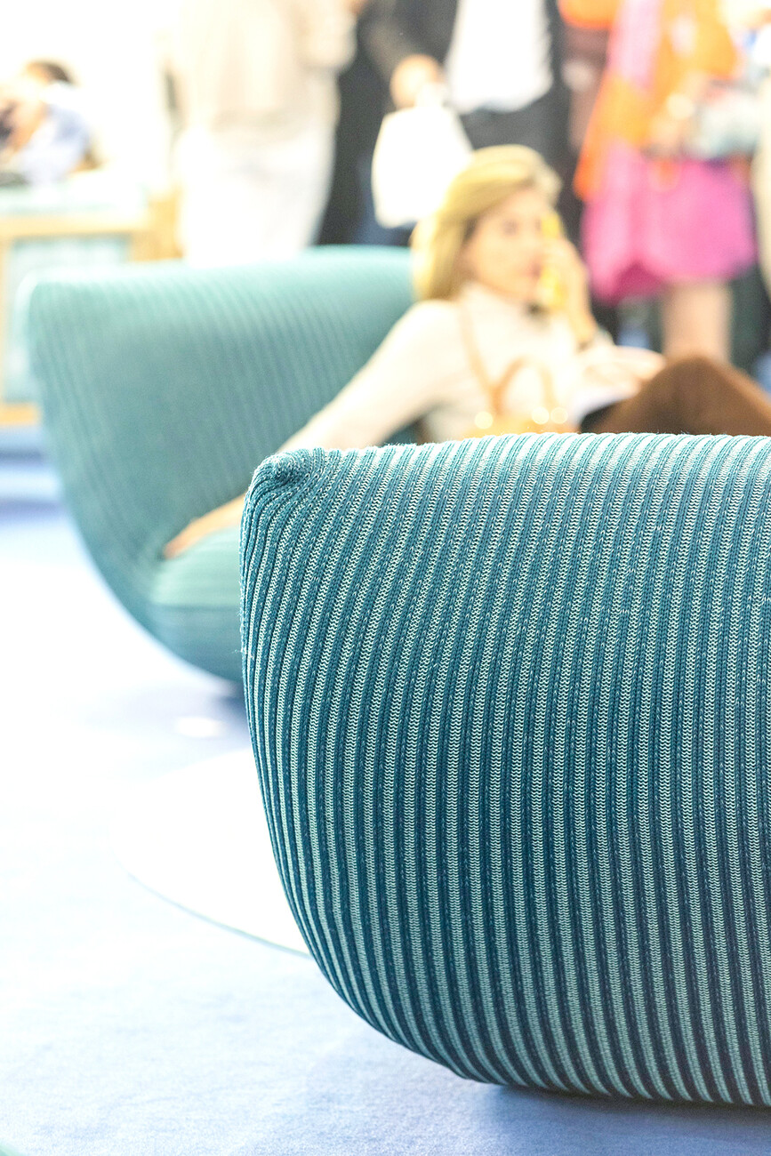 "The Era of Daydreaming" lautete das Motto der diesjährigen Artissima, das dazu einlud, alternative Szenarien für das Leben auf der Erde in der Zukunft zu entwerfen. Paola Lenti wählte für ihre Installation den Schulterschluss mit Farbdesignerin Vicky Syriopoulou und Oikos – The Ecological Paint. In Zusammenarbeit mit ihnen hat die Marke einen Raum geschaffen, der inmitten des Messetrubels die Gäste einlud, in eine fantastische Meerlandschaft einzutauchen: "Seascaping". Schönheit und Mystik, wie die hohe Bedeutung der Ressource Wasser für Mensch und Tier durfte in dieser Szenerie erfahren werden. "Für Artissima haben wir uns eine Kulisse vorgestellt, die Seestücke grafisch interpretiert – eine visuelle Erzählung, von der wir hoffen, dass sie durch Qualität und Schönheit Optimismus und Hoffnung weckt", so Paola Lenti. Dank der außergewöhnlichen Farbauswahl der Produkte des italienischen Möbelherstellers ist so eine kreative Unterwasserwelt mit Bereichen für Meetings, eine kurze Pause und eine Erfrischung an der Bar entstanden, die zur Erkundung und zum Platz nehmen einlud. Wie auf den Sofas "Kyo" und "Santorini", den Loungesesseln "Pod" und "Baleari" oder den Stühlen "Capri", "Telar" und "Sabrina" von Paola Lenti. Begleitet wurden diese unter anderem mit den Tischen "Giro" und "Sciara" oder dem Hocker "Otto". Dazu verzierten die Outdoor-Teppiche "Zoe", die Wandteppiche "Morpho" sowie der flexible Hintergrund "Mandala" die Szenerie.