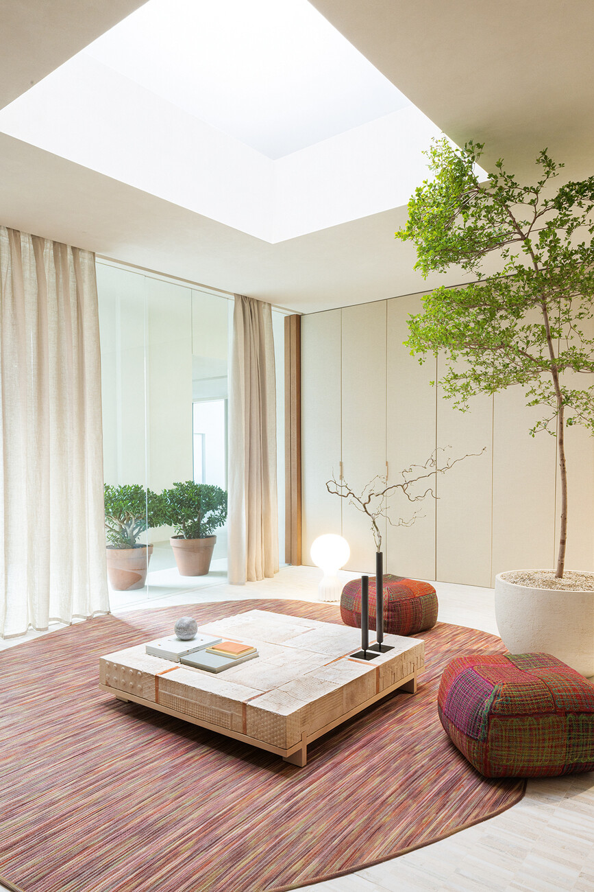 Während die Farben der Möbel und Accessoires für den Außenraum wie für ein fröhliches, schnelles Musikstück komponiert wirken, spielt die Ausstattung im Innenraum visuell leisere, sanftere Töne, die mit farbenfrohen Akzenten stilvoll abgerundet sind. Ein Beispiel für die ideale Kombination der zwei Welten ist die "Naga" Bank von Atelier Oï: "Unser Projekt für Paola Lenti verkörpert einen Geist der Transformation und Innovation, indem es die exklusiven Farben und Stoffe des Unternehmens verwendet und gleichzeitig neu definiert, wie diese Elemente innerhalb einer essenziellen Struktur interagieren, um eine präzise Funktion zu erfüllen. Dieses dynamische Zusammenspiel der Materialien bietet ein visuelles und sensorisches Erlebnis, bei dem die Anordnung und Spannung der Bänder einen faszinierenden Dialog zwischen Farben und Texturen erzeugt.", so die Designer. Klar und verspielt, dezent und auffällig: Paola Lenti schafft es das Beste aus beiden Welten zu kombinieren.